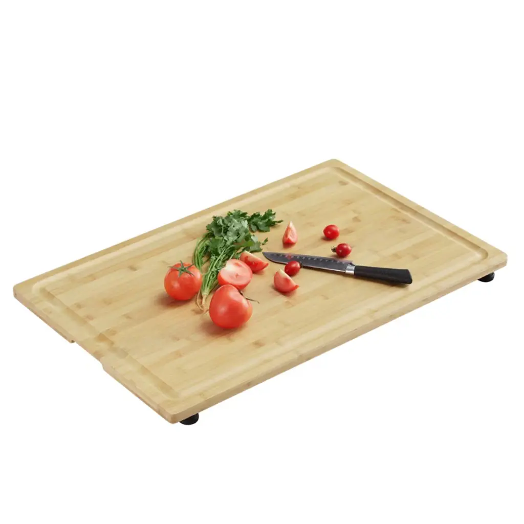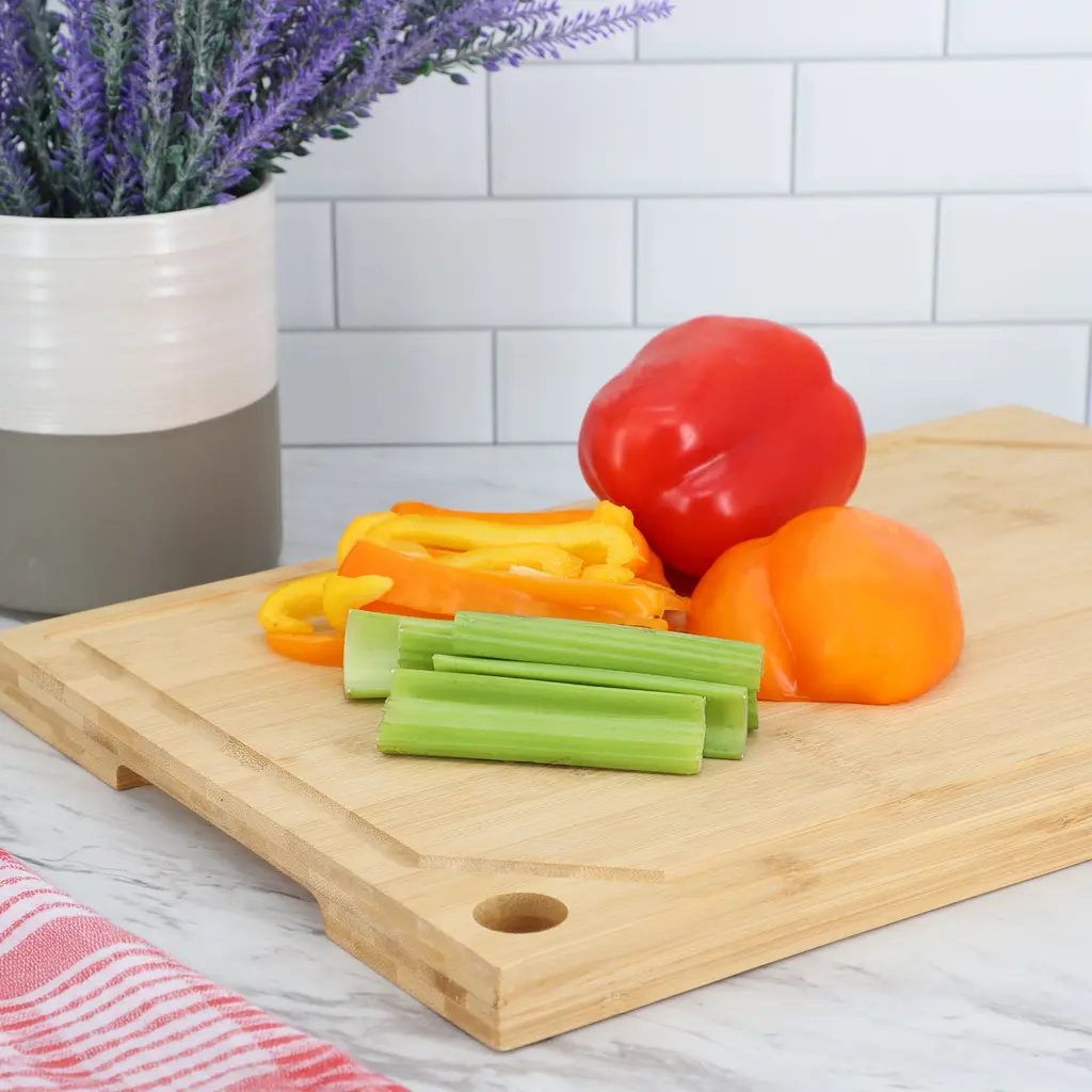For serving or kitchen prep work, this cutting board looks sophisticated in a natural hue with a rounded square cutout handle. The heat-safe board also serves as a trivet to protect tables and counters from hot pans and baking dishes. Knife-safe to help keep your cutlery sharp, the reversible board cleans up easily in the dishwasher. Our modern natural cutting board is a Crate and Barrel exclusive.