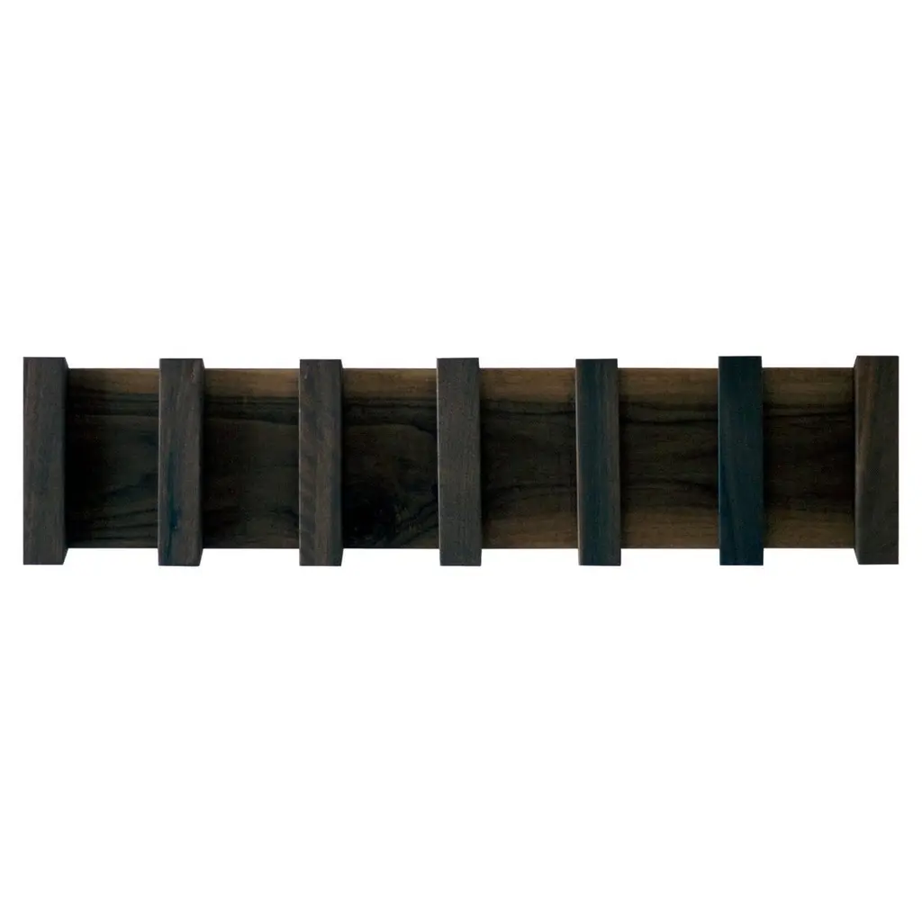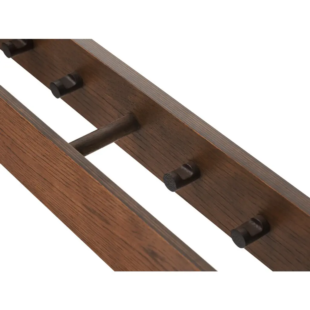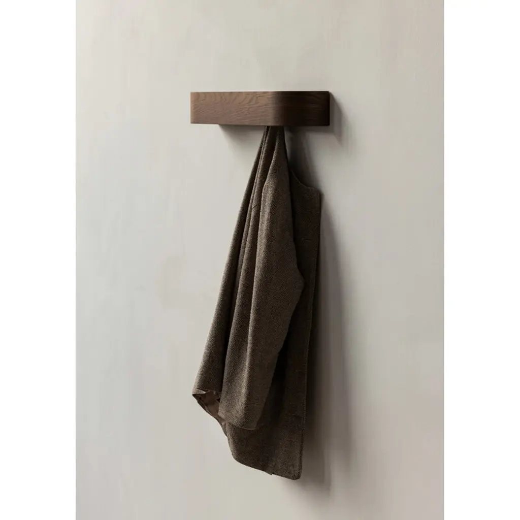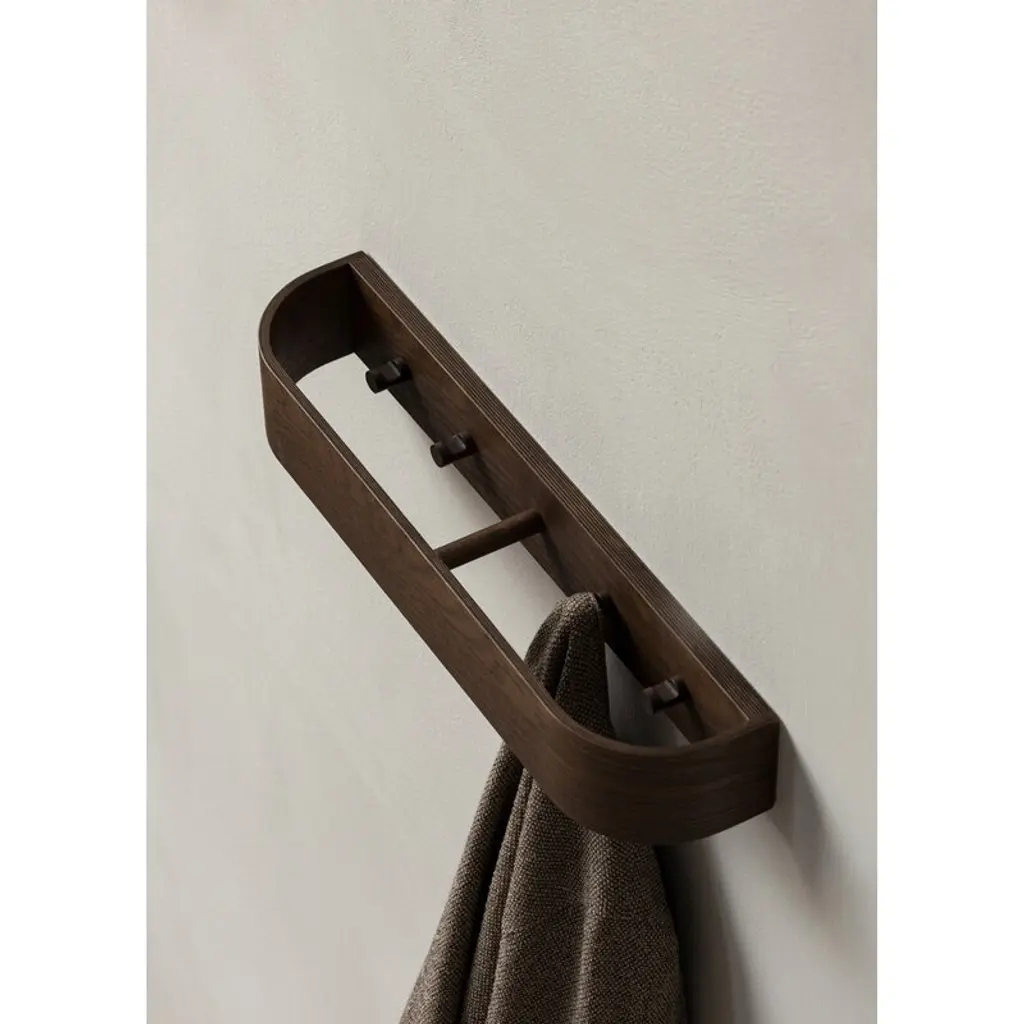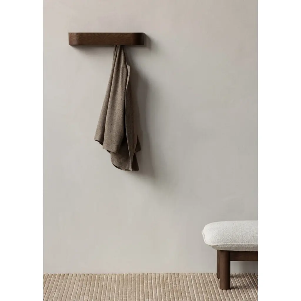 Audo Copenhagen's Epoch coat rack boasts an elegant design that emphasizes both form and functionality. Designed by Nina Bruun, the coat rack has its pegs hidden behind a gently curved slat of wood, infusing the space with a sense of calmness and serenity – the entrance often is not the tidiest of spaces. The wooden shelf is made of oak veneered plywood, with the natural warmth of the wood and the curved design language reinforcing the coat rack's serene impression.