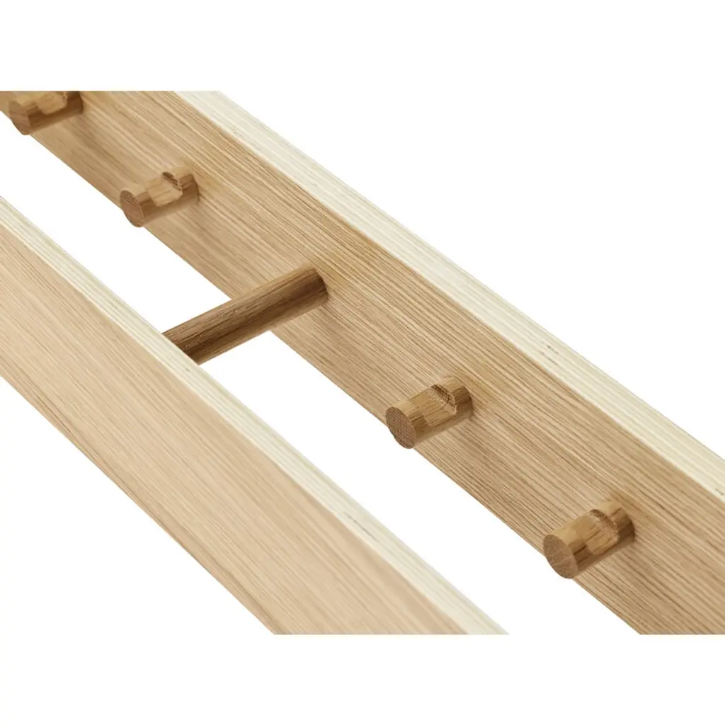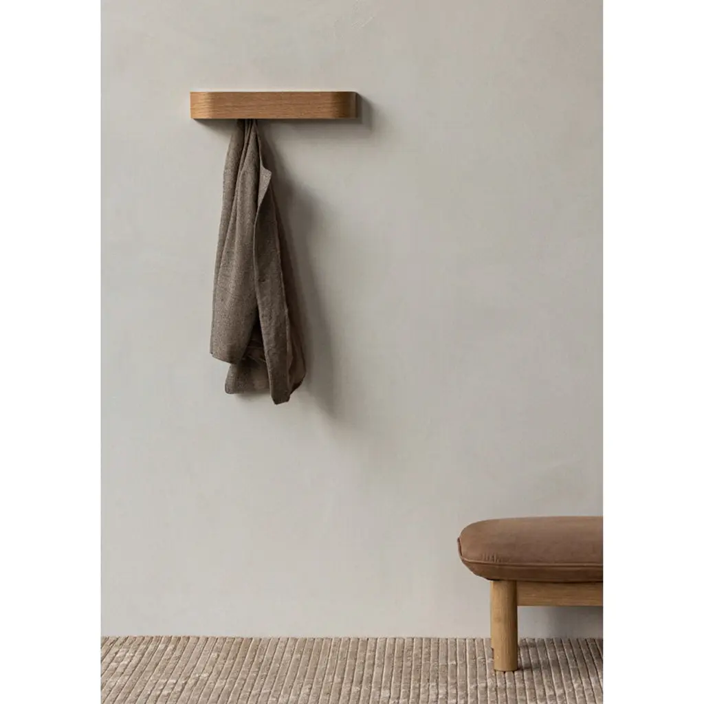Audo Copenhagen's Epoch coat rack boasts an elegant design that emphasizes both form and functionality. Designed by Nina Bruun, the coat rack has its pegs hidden behind a gently curved slat of wood, infusing the space with a sense of calmness and serenity – the entrance often is not the tidiest of spaces. The wooden shelf is made of oak veneered plywood, with the natural warmth of the wood and the curved design language reinforcing the coat rack's serene impression.