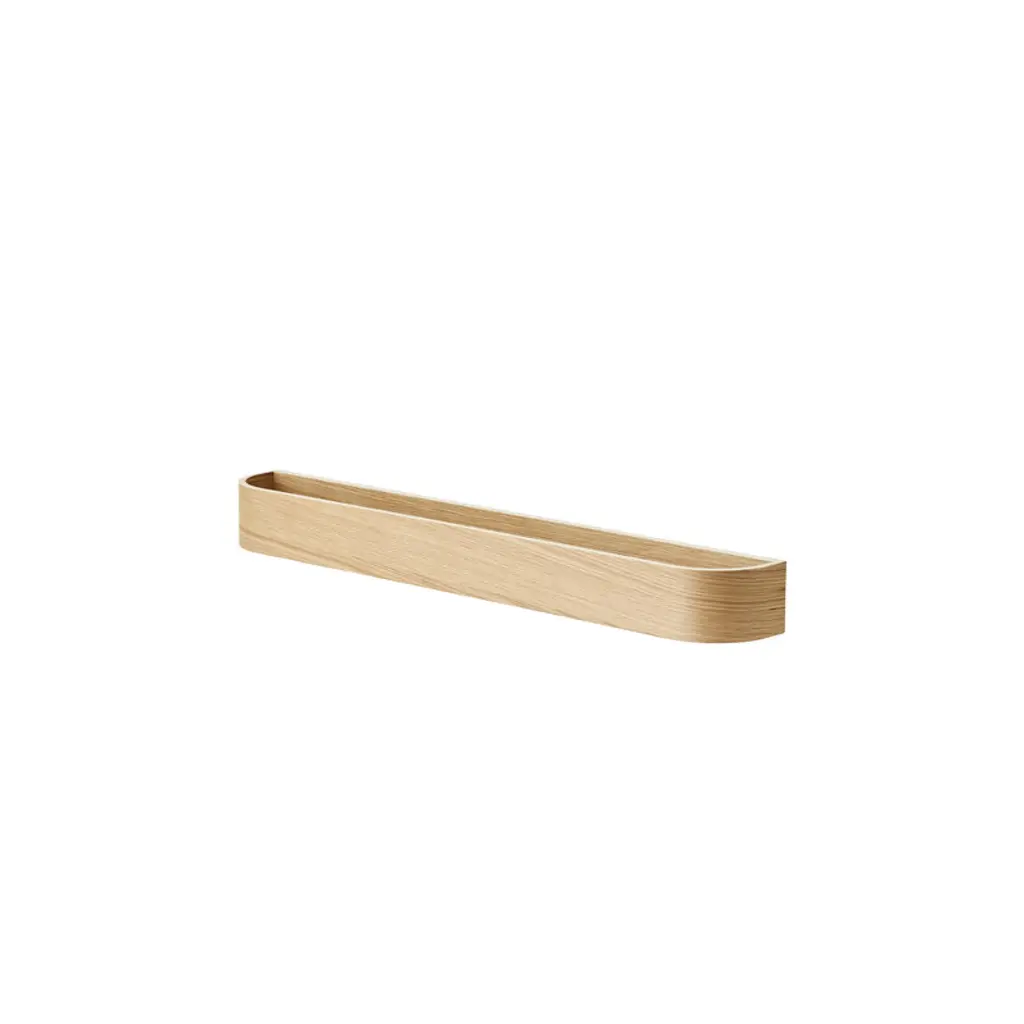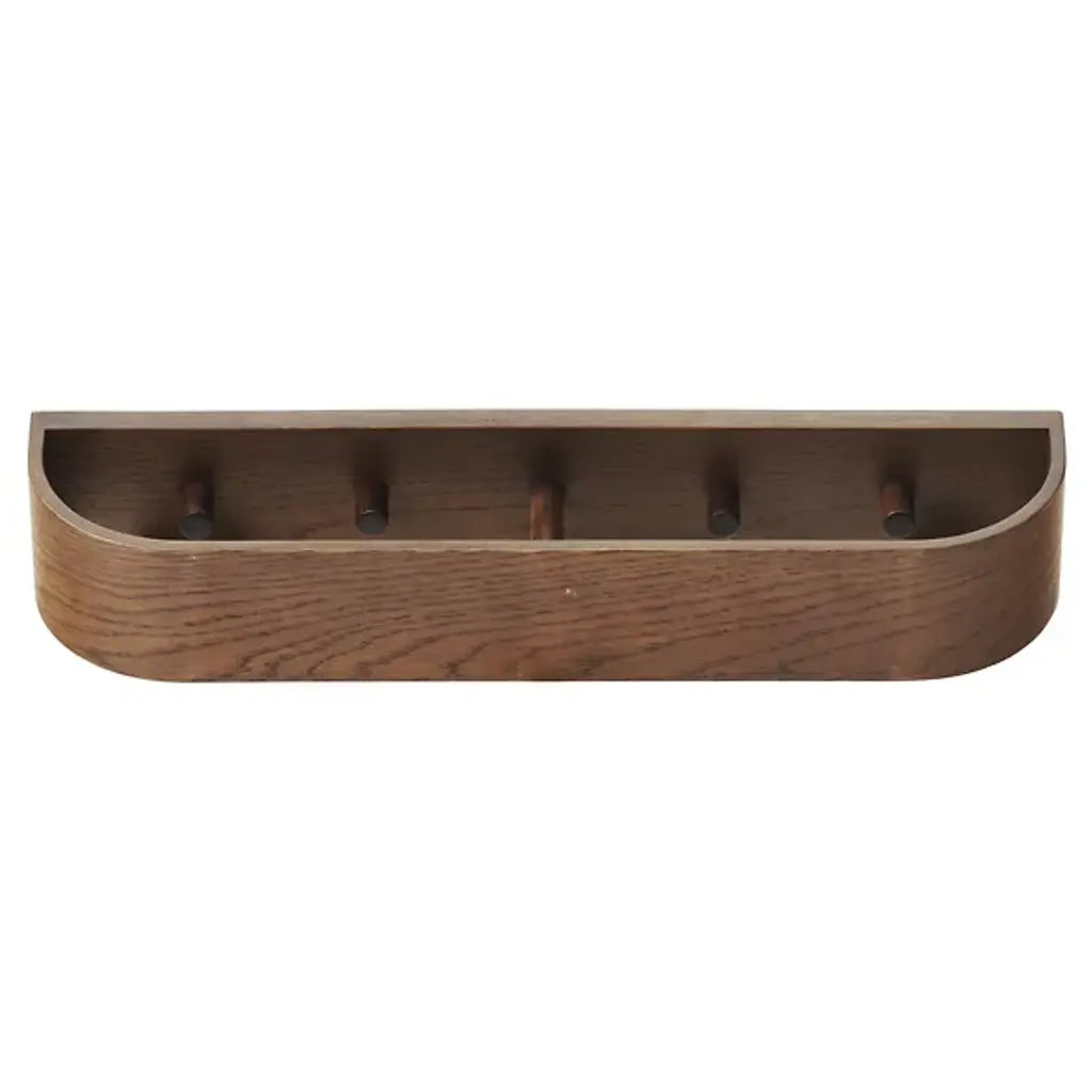 Audo Copenhagen's Epoch coat rack boasts an elegant design that emphasizes both form and functionality. Designed by Nina Bruun, the coat rack has its pegs hidden behind a gently curved slat of wood, infusing the space with a sense of calmness and serenity – the entrance often is not the tidiest of spaces. The wooden shelf is made of oak veneered plywood, with the natural warmth of the wood and the curved design language reinforcing the coat rack's serene impression.