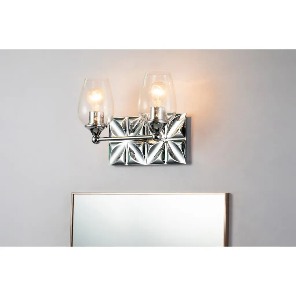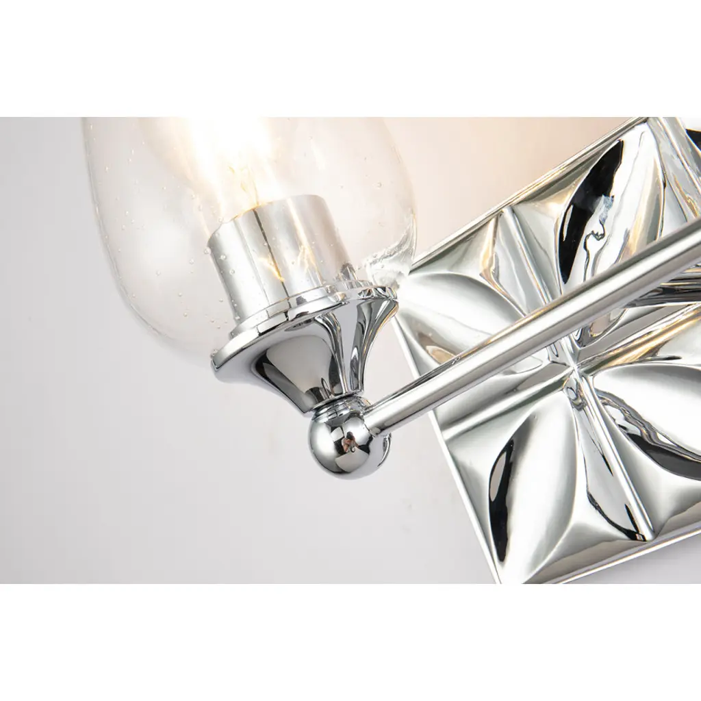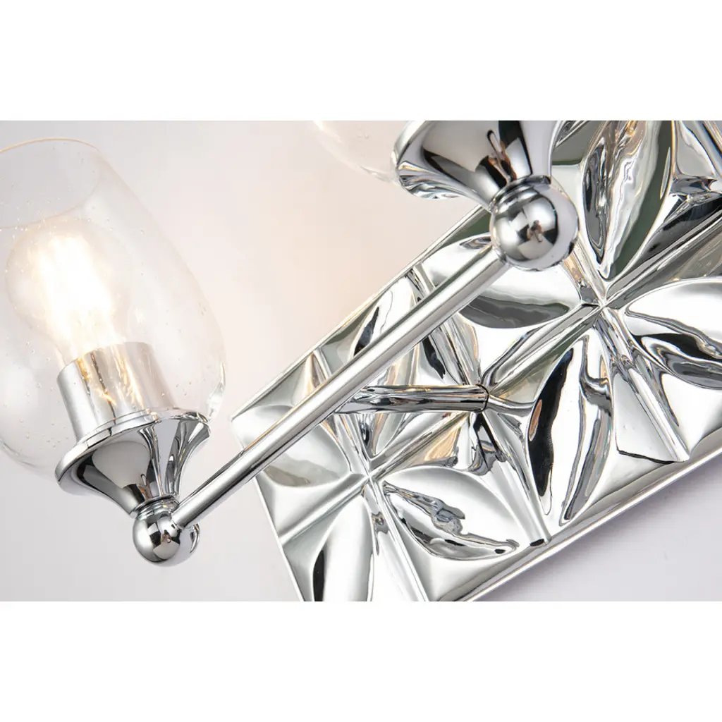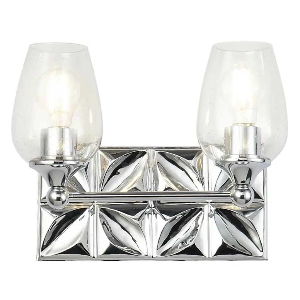 Always looking to add texture and dimension to a room, we created the perfect 2-light bathroom vanity light. The 14 inch back plate with a pressed textured shape creates a modern design completing our intent. Showcasing the elegant polished chrome finish and sleek wine glass-shaped, clear seeded glass shades that can be mounted either up or down, we are giving that extra touch to show our attention to design and our love for the details.