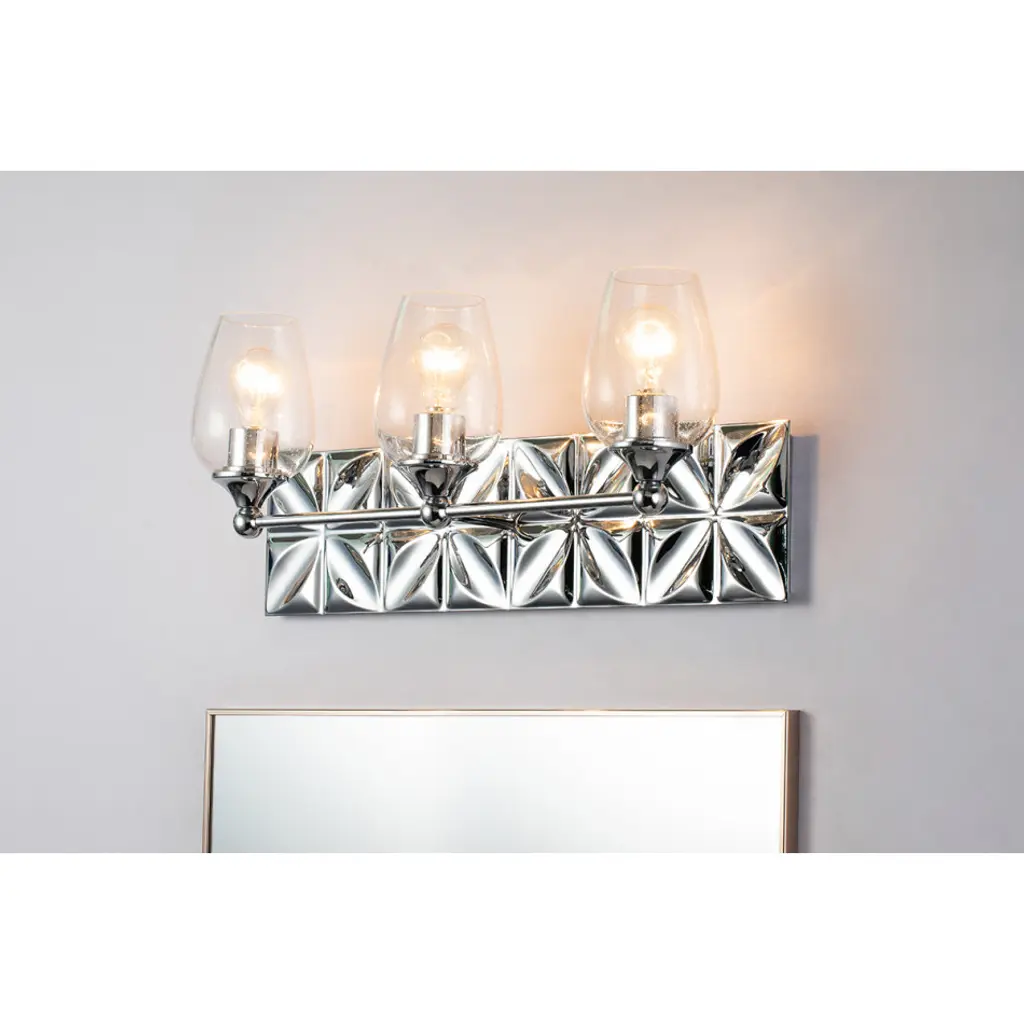 Always looking to add texture and dimension to a room, we created the perfect 3-light bathroom vanity light. The 24 inch back plate with a pressed textured shape creates a modern design completing our intent. Showcasing the elegant polished chrome finish and sleek wine glass-shaped, clear seeded glass shades that can be mounted either up or down, we are giving that extra touch to show our attention to design and our love for the details.
