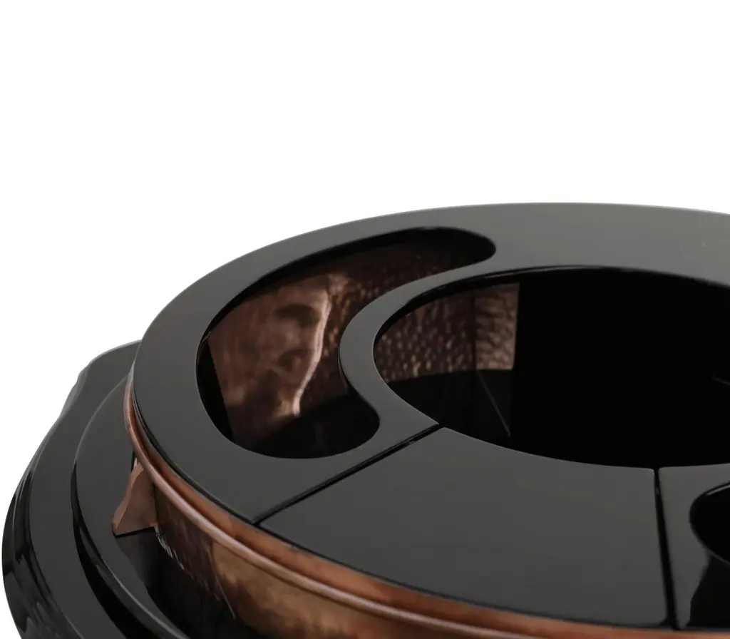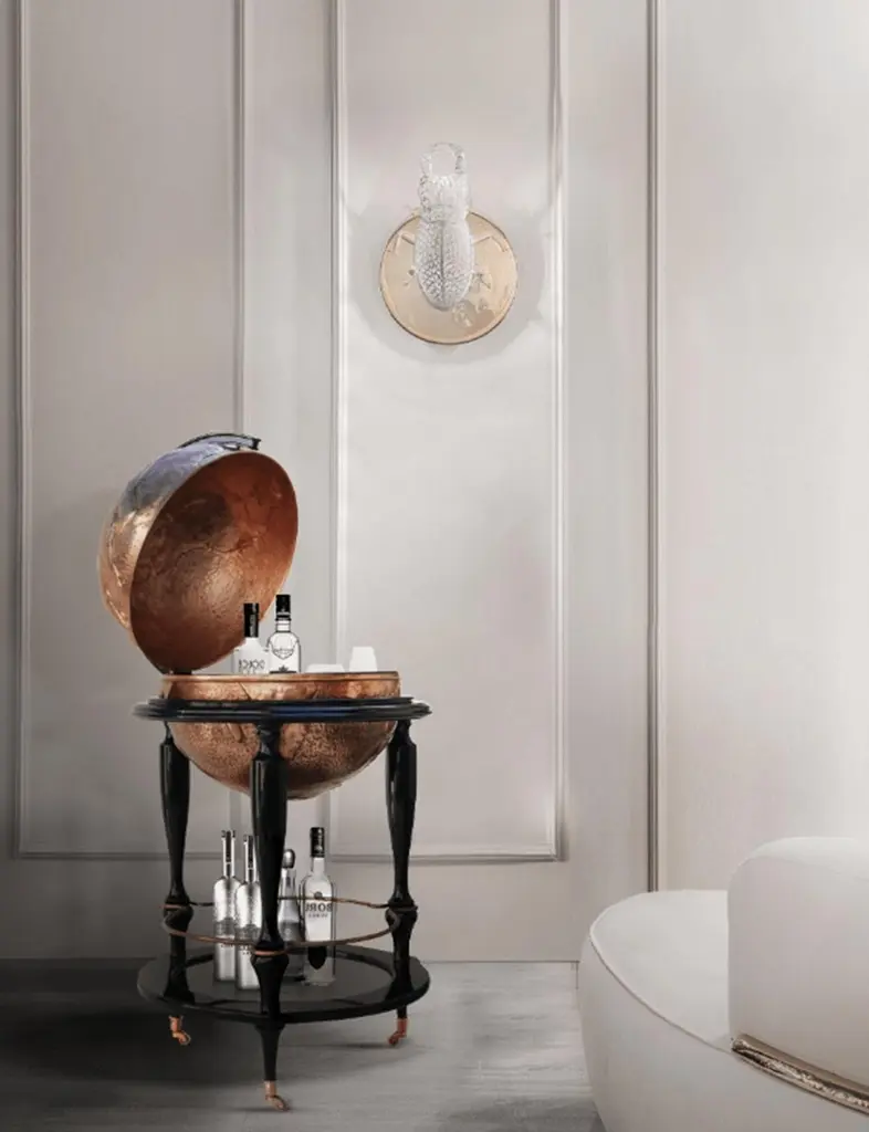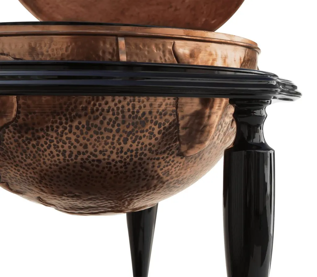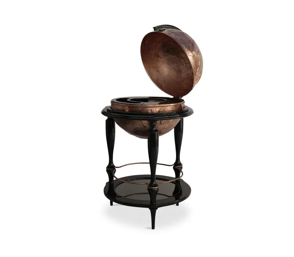 An eye shut travel, back to the 16th century; epoch where the globe had a major role in the navigators’ lives and was the main key to world exploration. Equator is full of “Portugal”: soul, navigators & discovery, represented by the embossed hammered cooper and the elegant wood lines. The delicate and detailed craftsmanship equals one unique jewelry piece. Mixing two necessities of the perfect lifestyle, traveling and celebrating. Ideal for exclusive interiors, this exclusive piece of furniture can be placed at any living or dining room giving it an elegant style providing a journey of pure comfort and relaxation. The Globe is made from polished copper, manually hammered. In its interior there is space for glasses and bottles. The surface of the bottom head’s base is made from black lacquered glass.
