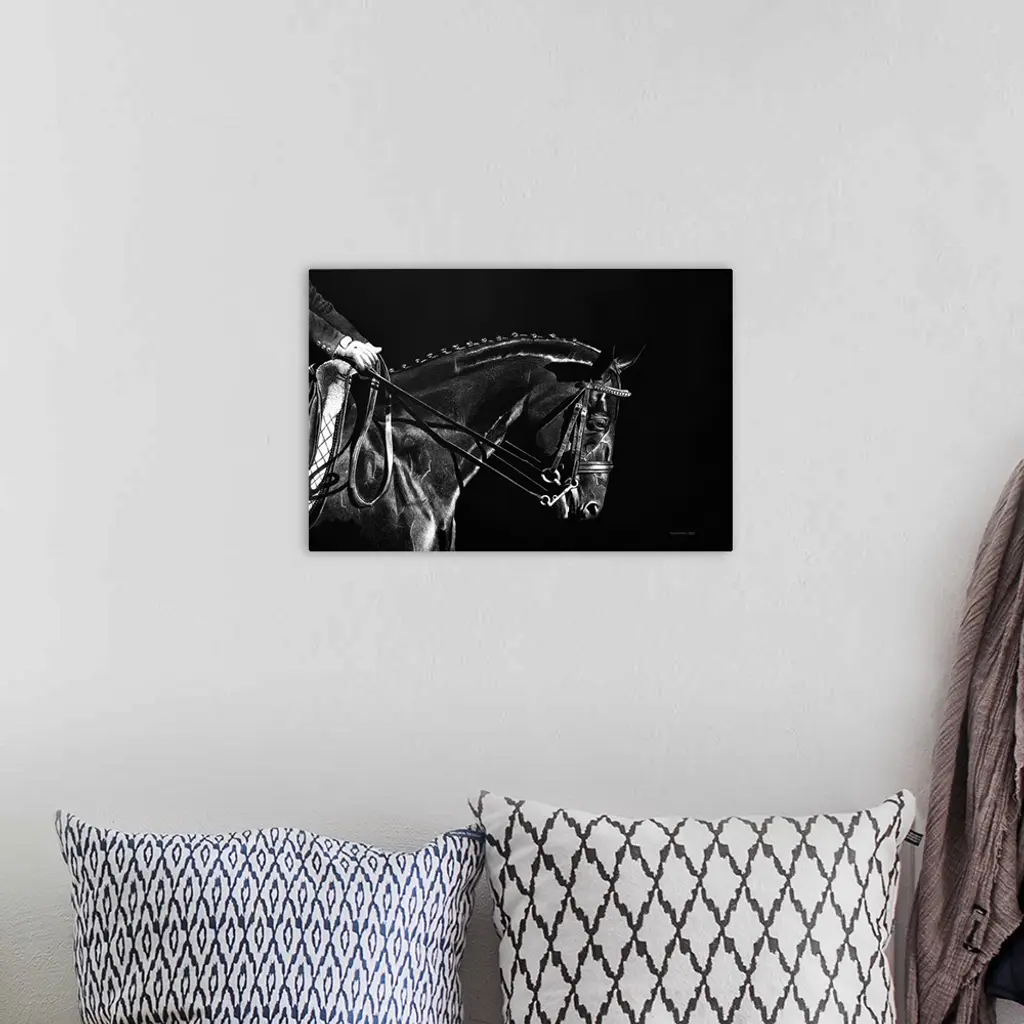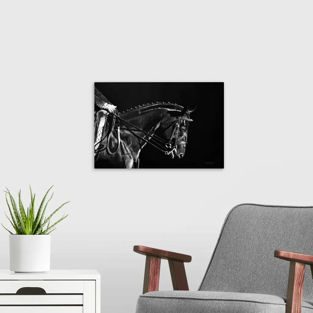 This scratchboard depicts a woman rider just entering an Equestrian competition on this beautiful horse. The fur shows the veins and smooth shiny fur in detail, which really helps this horse look so elegant.