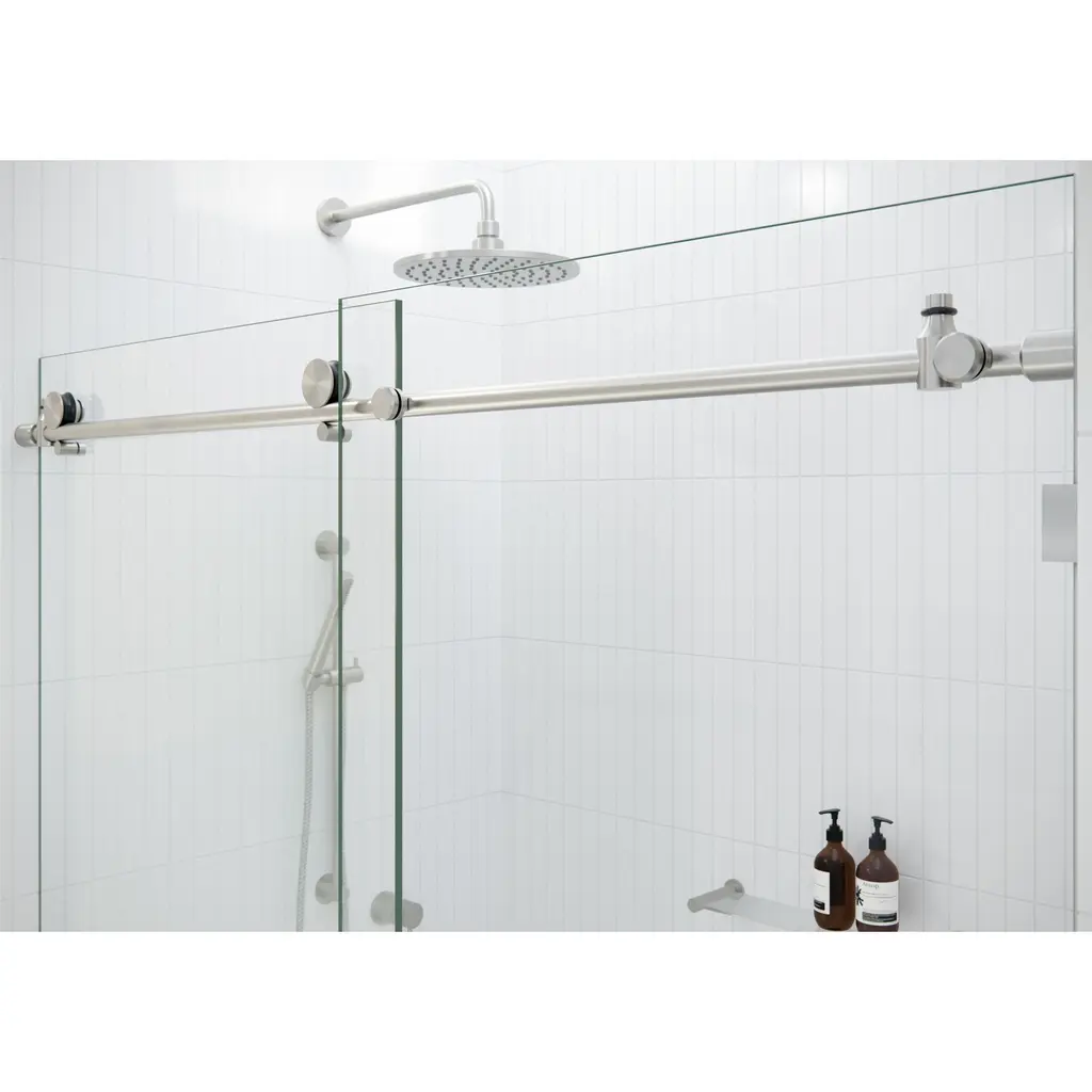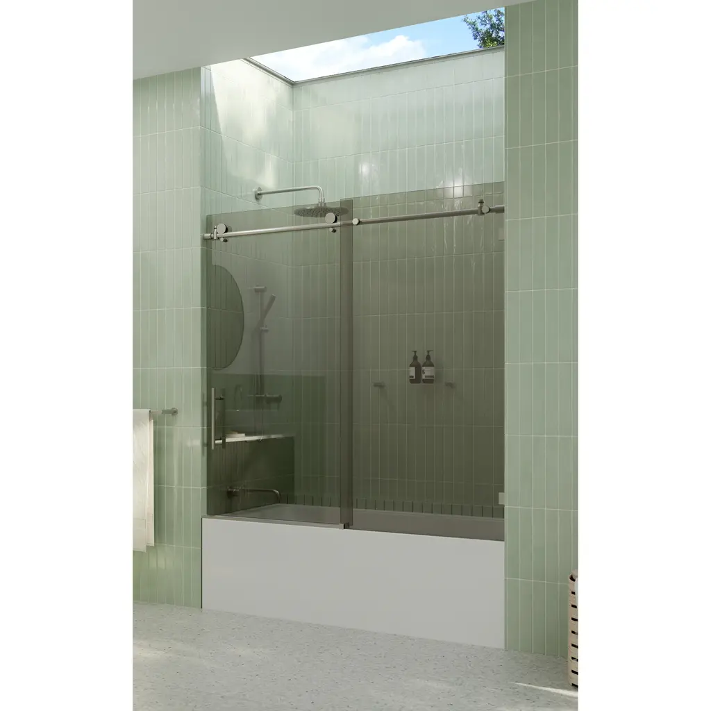 The Equinox, our high-end, sliding door model, is a simple way to update your bathtub. Each frameless 3/8" tempered glass panel comes in a standard 60" height with one sliding panel and one fixed panel. Glass is treated on both sides with EnduroShield coating, which aids in repelling water and soap residue, allowing the panels to be fully reversible. In addition, our superior quality stainless steel hardware is available in a variety of color finishes to suit any bathroom. With our extensive collection of shower door panel sizes, the Equinox shower enclosure by Glass Warehouse is designed to easily fit over your bathtub. Doors slide effortlessly on high-quality stainless-steel rollers, creating a look that's far sleeker than a shower curtain..