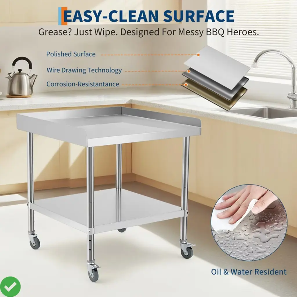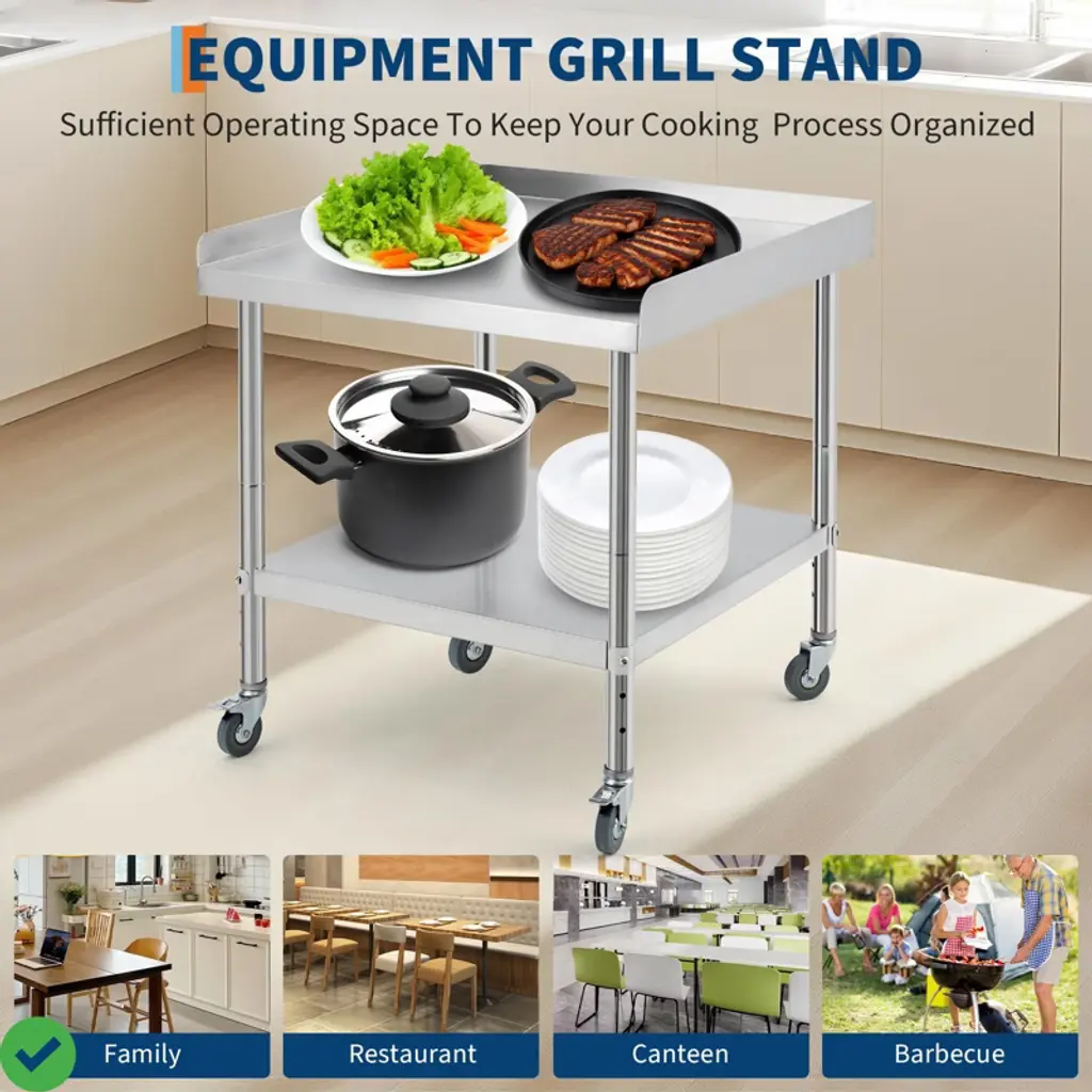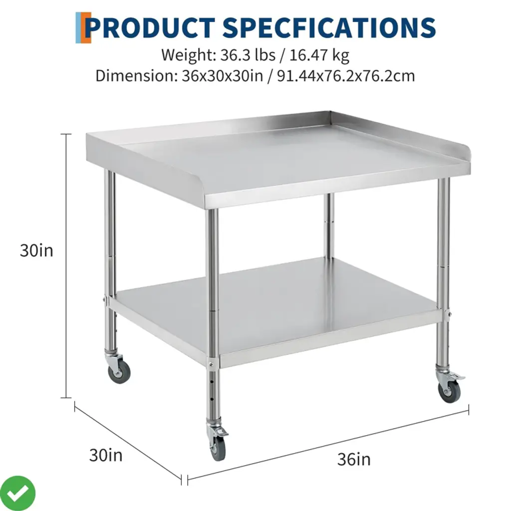 24x24x30 Inch/30x30x30 Inch/36 * 30 * 30Inch Stainless Steel Equipment Grill Stand Table NSF Certified with 5" Wheels, 400 Lbs Capacity, 2" Edge Baffle, for Hotel, Home, Commercial Restaurant Kitchen.
