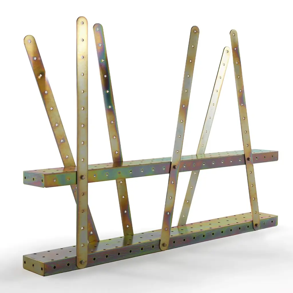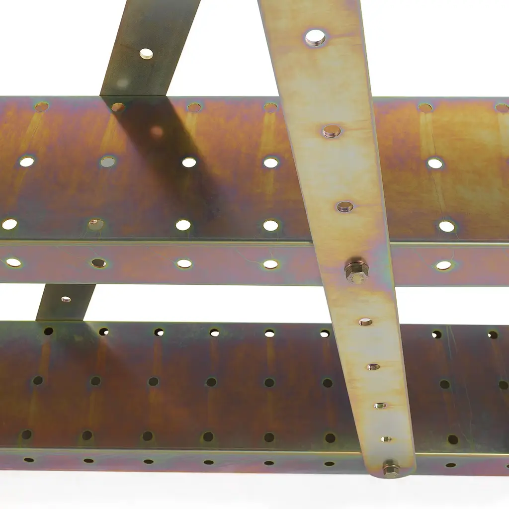 "Meccano: more than a toy, an iconic building set teaching basic mechanical principles. Over a hundred years since its inception, this game inspires a brand new artifact. Eret is a stunning composition of perforated metal surfaces and fixing bolts, expression of creativity as a bridge to new realities." Console with structure made by assembling Meccano-like elements in tropicalized metal. No variations available.