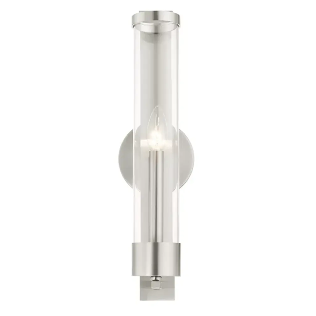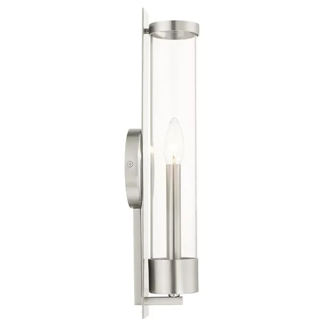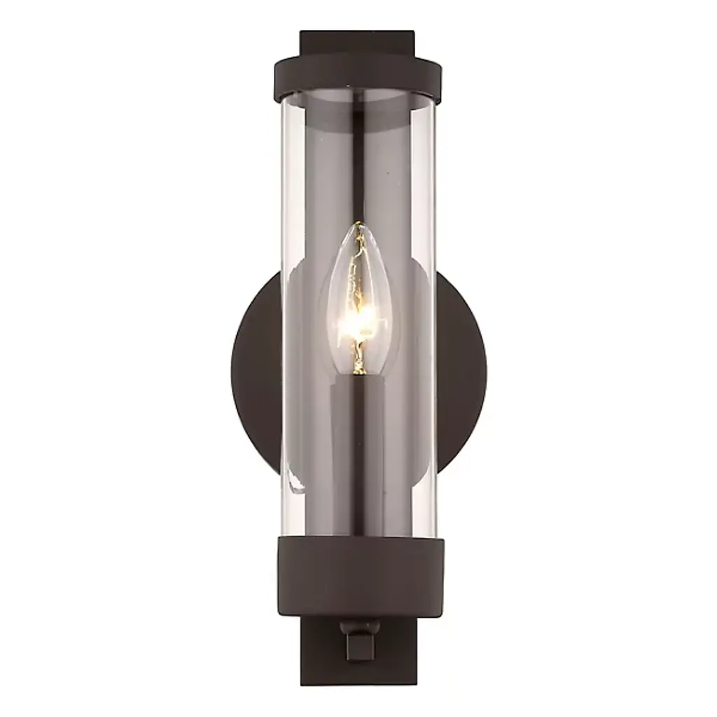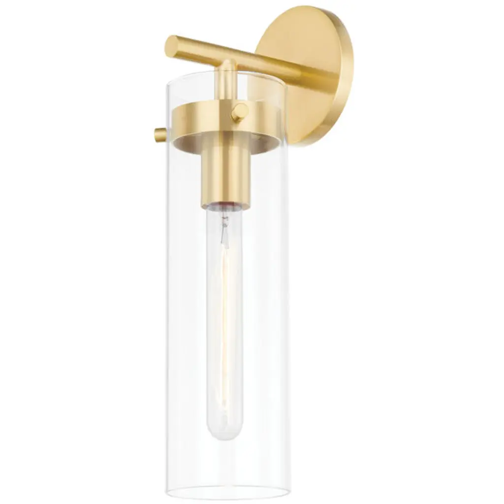 Heighten the intimate warmth of your home lighting with the Erica Wall Sconce from Alder & Ore. This piece slots in between entryways, columns, or framed pictures with a compact backplate and a slim figure. It reveals its modern aesthetic through the precision in its shapes. Made from steel, a curved cover presents an enhancing background for the lone bulb. A clear glass cylinder also accentuates the light source with a reflective, display-like quality. Standing over a minimalist lamp holder, the bulb turns on to generate a radiant and romantic ambient glow.