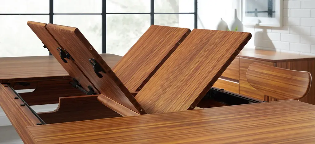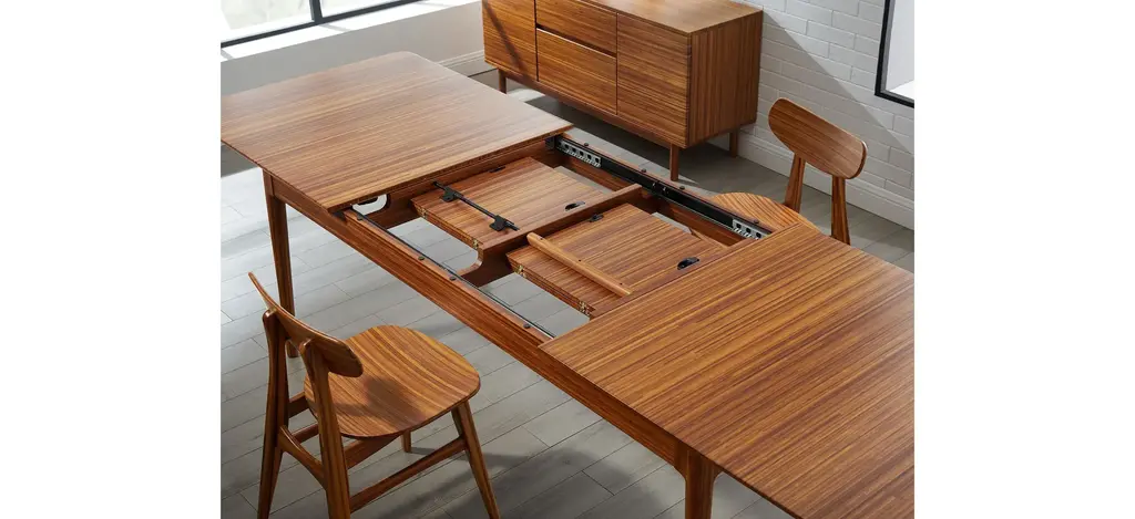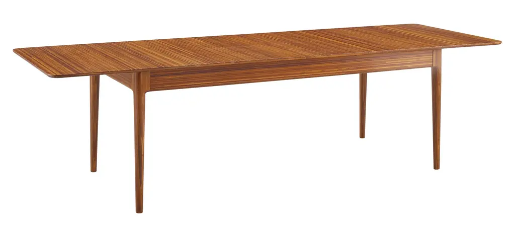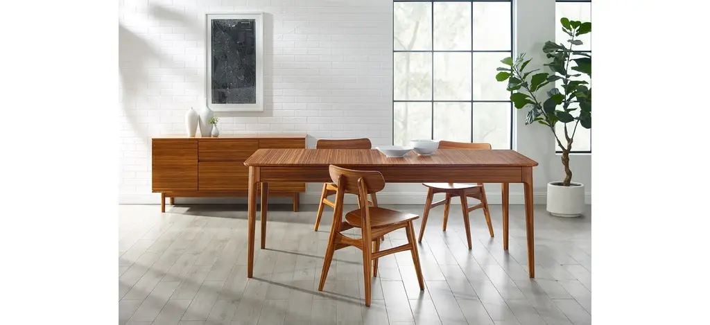Stylish and functional, the first thing you notice about the Erikka Double-Leaves Extension Dining Table are the vibrant colors found in the solid Amber bamboo. Terrific for the whole family, the elegant dining table is easily expandable to make entertaining easy. Erikka boasts two self-storing 16" butterfly leaves that gives you the flexibility of extending to 94" or 110" inches, making this table suitable for everyday use or a family feast. Expertly crafted in sustainable and earth friendly solid bamboo, the Amber color is not a stain finish, simply an innovation created using earth friendly heat, steam, and pressure to transform the bamboo into Amber's deep color. Erikka makes it easy to live sustainably with style.