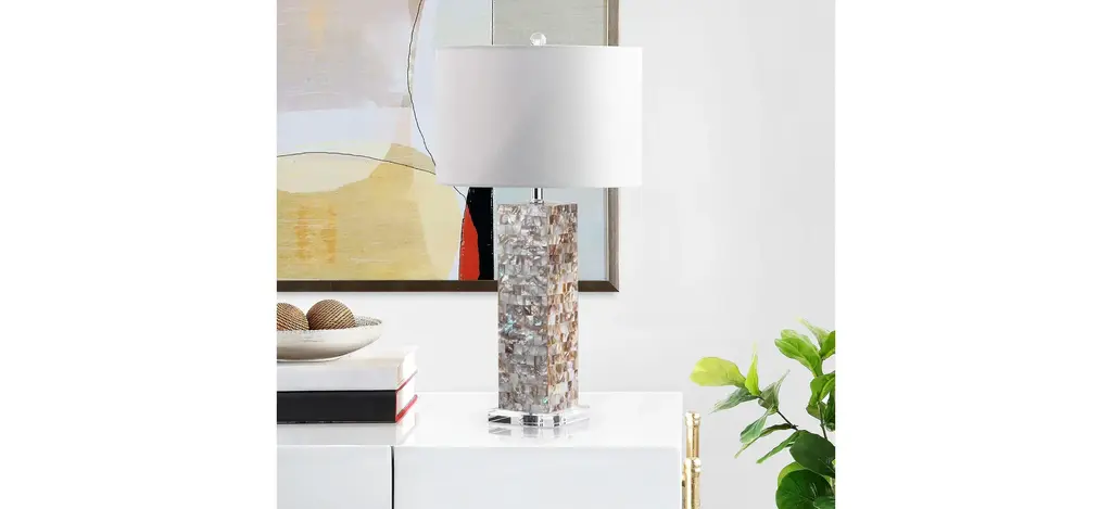 Naturally elegant, the Erinn Table Lamp features a rectangular column base finished with a mosaic of capiz shell tiles. A white textured cotton drum shade sits atop this transitional lamp, replete with a clear acrylic pedestal and finial.