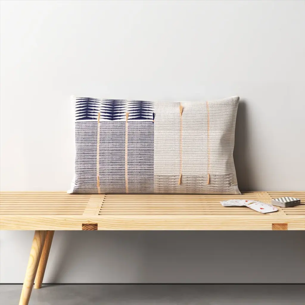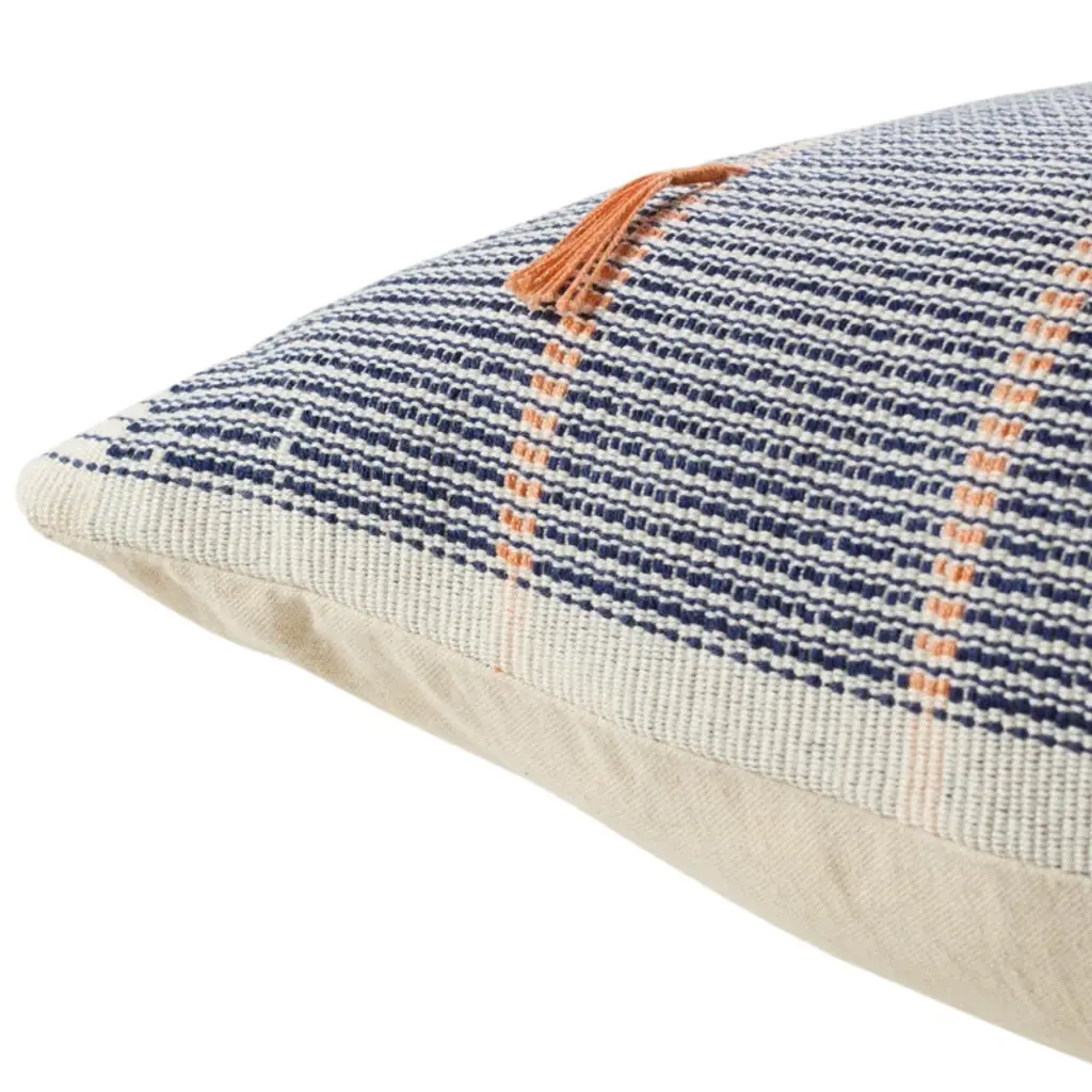 This throw pillow features the traditional loin-loom techniques of indigenous tribes in Nagaland, India. Handcrafted by these weavers, the globally inspired tribal and stripe pattern combined with a navy, silver, cream, and orange colorway create a stunning statement piece. The soft and finely woven cotton material and bohemian style perfect any indoor space in a modern home.