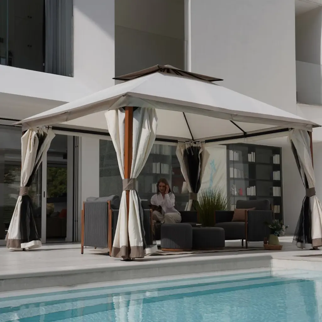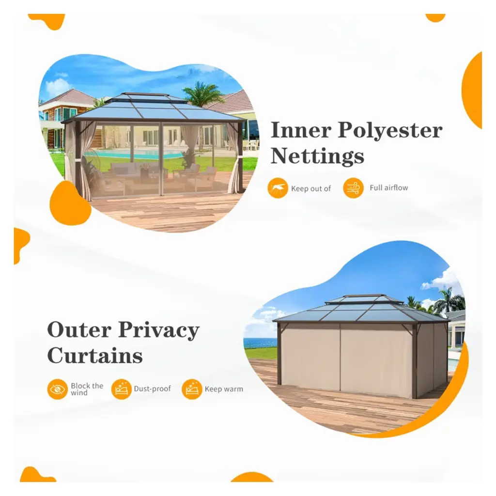 Our garden gazebos are made of durable Aluminum material with a powder coat finish that is resistant to rust, peeling, and scratches. Providing expansion screws for concrete floors and has a pre-drilled base. Designed for a robust installation that contributes to stability over time. Our patio gazebo has a vented, double-layer polycarbonate roof for fresher air. It helps endure wind, and rain and blocks damaging UV radiation.