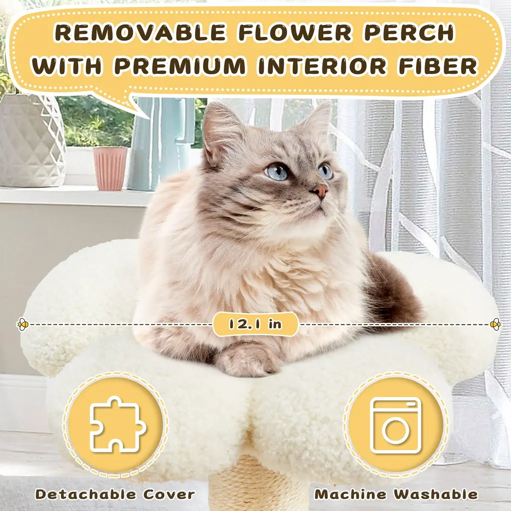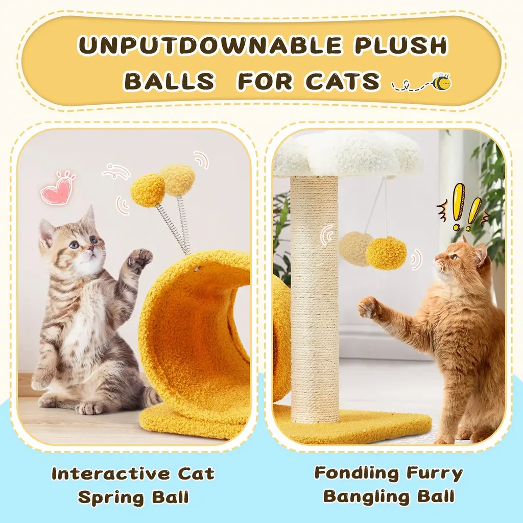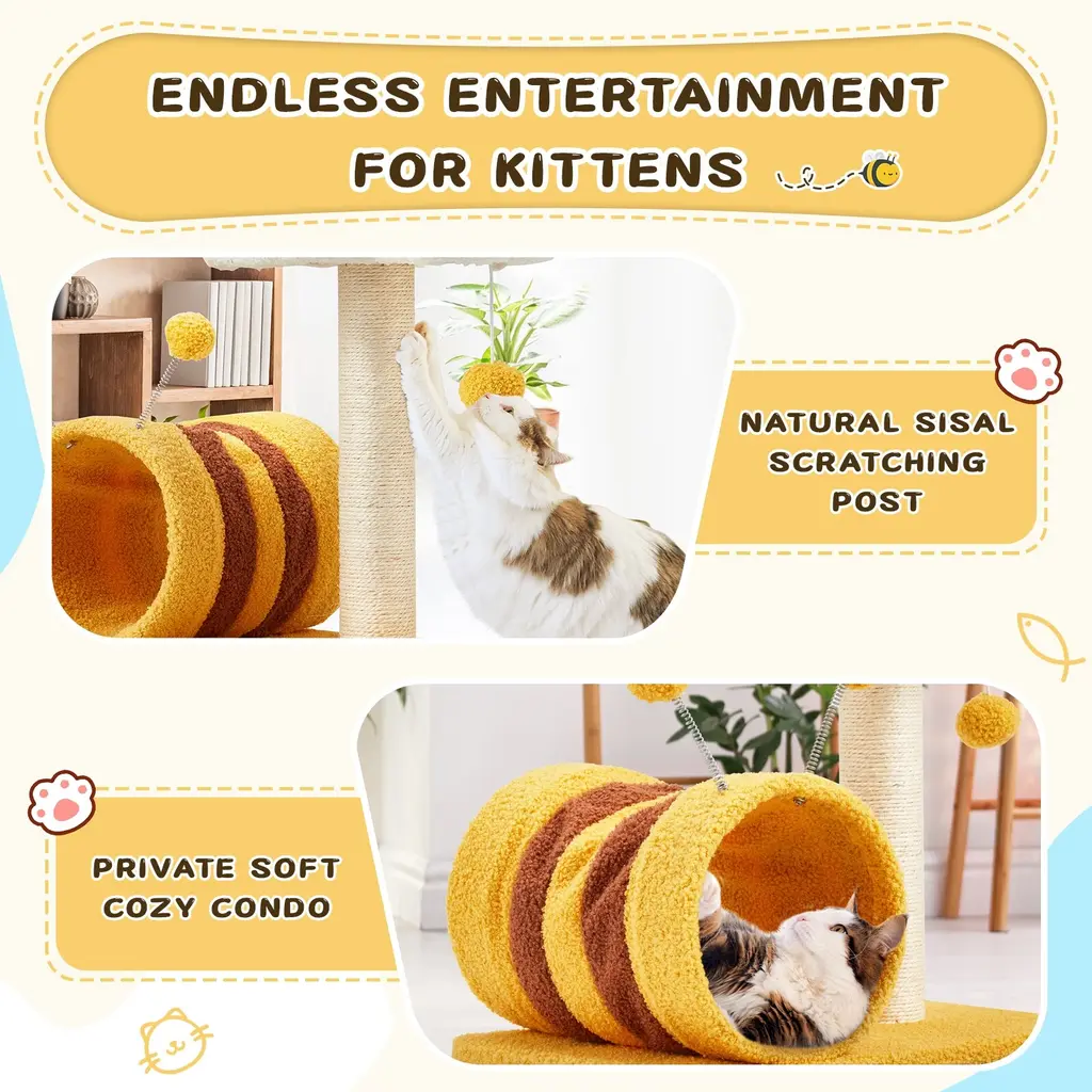 【Multi-level for Entertainment】The lovely flower perch on the top full of design sence that creates cozy and inviting spots for your cat to relax. Suspended at a appropriate height, the soft hammock fits the shape of cat's body serving as a enjoyable nest to curl up and nap. The color of warm bright yellow and the unique outer bee-shaped cat tower are not only attractive to cats, but also will be the highlight of your home decoration. 【Promotes Health and Happiness】To stay the health and vitality of your kittens, our cat tree tower includes scratching posts made of 3MM sisal that satisfie your cat's scratching instincts, which is more scratch resistant than ordinary sisal. And the spring balls on the above of the bee-like house provide additional leisure entertainment and mental stimulation. 【Excellent & Pet-friendly Quality】We prioritize safety and quality. Our cat tree features an anti-stipping and large base board design that ensure excellent load-bearing capacity, allowing multiple cats to climb, jump, and explore without any worries. The soft and durable teddy-plush covering ensures a skin-friendly experience while protecting your lively kitty from falls. 【Easy Installation & Space-saving 】Packed with simple construction and a necessary kit, as well as detailed instructions to make your installation hassle-free. The compact size of flower cat tree saves valuable floor space while ensuring that your cats have their own dedicated corner. 【Service & Note】Our team is committed to providing attentive and professional customer service. While minor color and size differences are normal, we encourage you to confirm all order details before placing it. In the unlikely event that your product arrives damaged or with missing parts, please contact us immediately, and we are here to assist you.