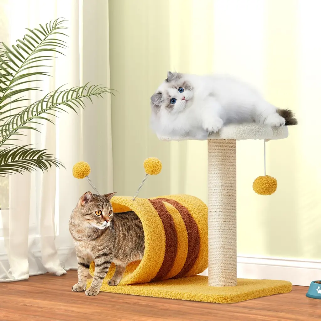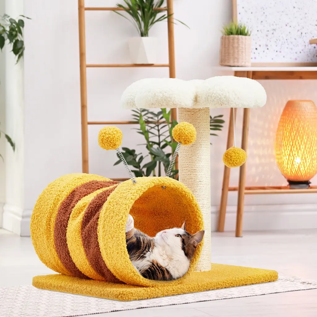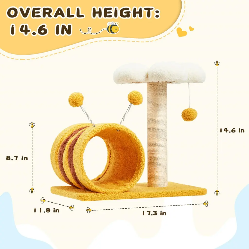 【Multi-level for Entertainment】The lovely flower perch on the top full of design sence that creates cozy and inviting spots for your cat to relax. Suspended at a appropriate height, the soft hammock fits the shape of cat's body serving as a enjoyable nest to curl up and nap. The color of warm bright yellow and the unique outer bee-shaped cat tower are not only attractive to cats, but also will be the highlight of your home decoration. 【Promotes Health and Happiness】To stay the health and vitality of your kittens, our cat tree tower includes scratching posts made of 3MM sisal that satisfie your cat's scratching instincts, which is more scratch resistant than ordinary sisal. And the spring balls on the above of the bee-like house provide additional leisure entertainment and mental stimulation. 【Excellent & Pet-friendly Quality】We prioritize safety and quality. Our cat tree features an anti-stipping and large base board design that ensure excellent load-bearing capacity, allowing multiple cats to climb, jump, and explore without any worries. The soft and durable teddy-plush covering ensures a skin-friendly experience while protecting your lively kitty from falls. 【Easy Installation & Space-saving 】Packed with simple construction and a necessary kit, as well as detailed instructions to make your installation hassle-free. The compact size of flower cat tree saves valuable floor space while ensuring that your cats have their own dedicated corner. 【Service & Note】Our team is committed to providing attentive and professional customer service. While minor color and size differences are normal, we encourage you to confirm all order details before placing it. In the unlikely event that your product arrives damaged or with missing parts, please contact us immediately, and we are here to assist you.