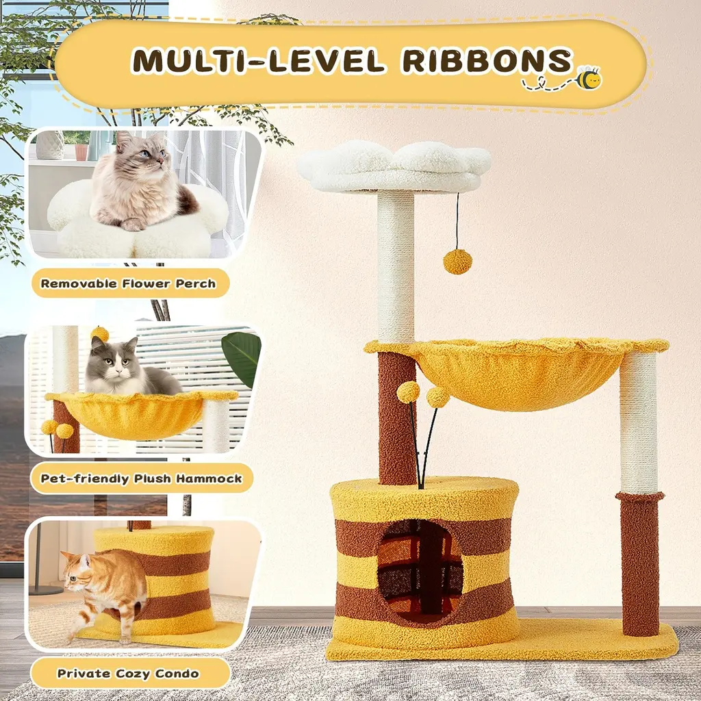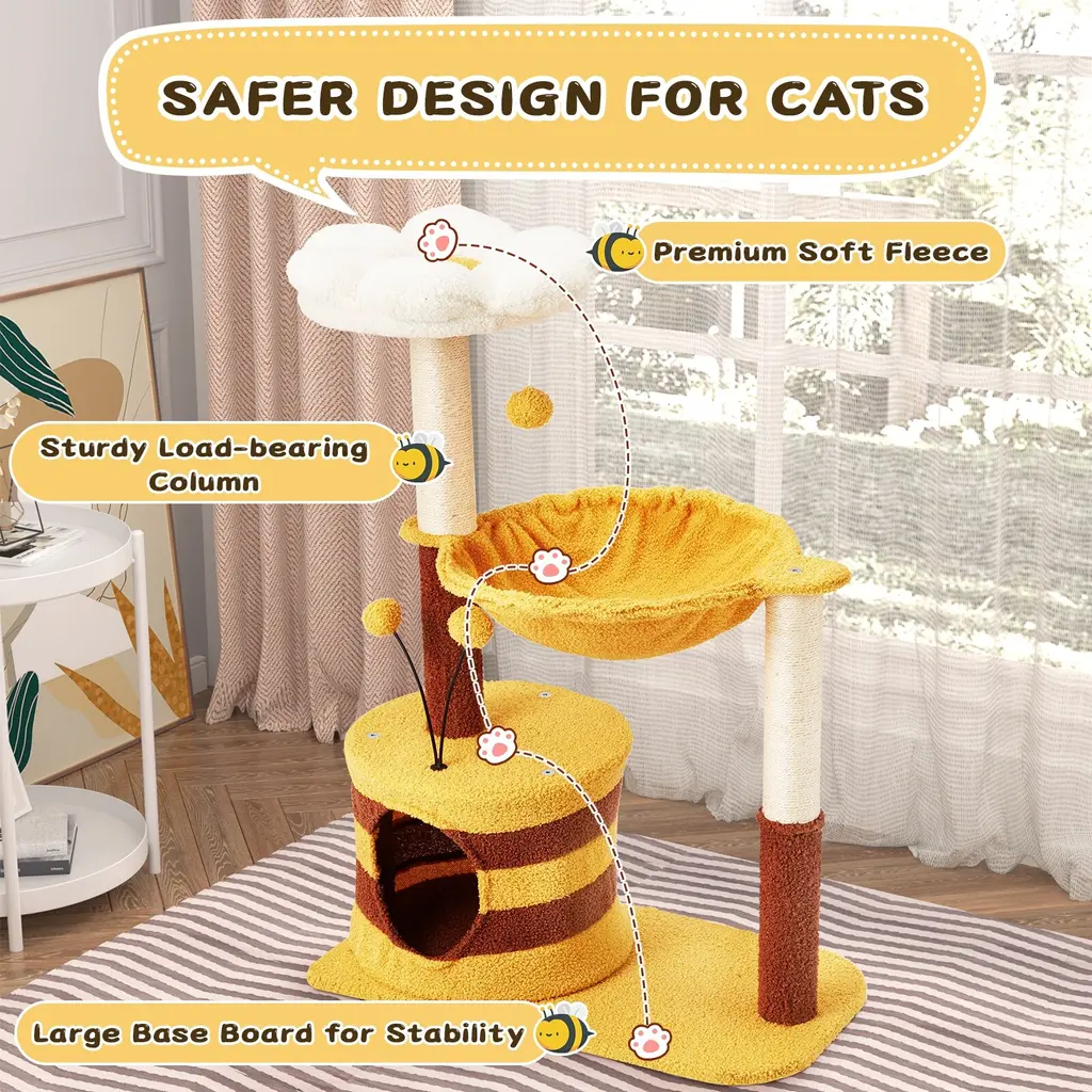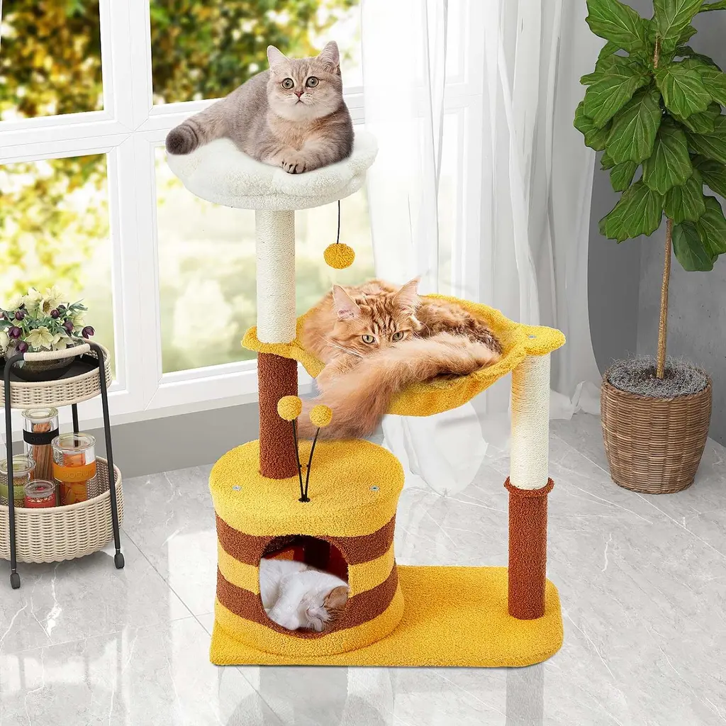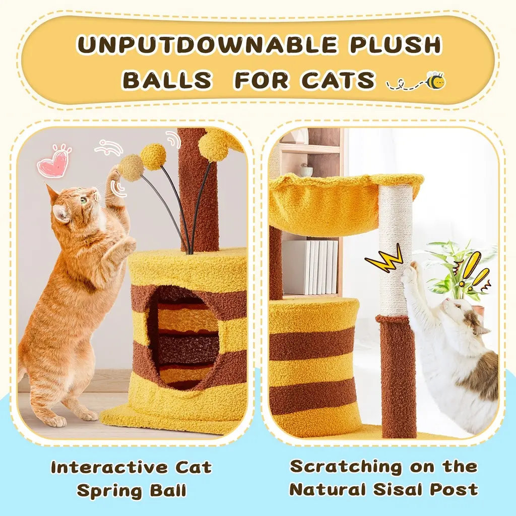 【Multi-level for Entertainment】The lovely flower perch on the top full of design sence that creates cozy and inviting spots for your cat to relax. Suspended at a appropriate height, the soft hammock fits the shape of cat's body serving as a enjoyable nest to curl up and nap. The color of warm bright yellow and the unique outer bee-shaped cat tower are not only attractive to cats, but also will be the highlight of your home decoration. 【Promotes Health and Happiness】To stay the health and vitality of your kittens, our cat tree tower includes scratching posts made of 3MM sisal that satisfie your cat's scratching instincts, which is more scratch resistant than ordinary sisal. And the spring balls on the above of the bee-like house provide additional leisure entertainment and mental stimulation. 【Excellent & Pet-friendly Quality】We prioritize safety and quality. Our cat tree features an anti-stipping and large base board design that ensure excellent load-bearing capacity, allowing multiple cats to climb, jump, and explore without any worries. The soft and durable teddy-plush covering ensures a skin-friendly experience while protecting your lively kitty from falls. 【Easy Installation & Space-saving 】Packed with simple construction and a necessary kit, as well as detailed instructions to make your installation hassle-free. The compact size of flower cat tree saves valuable floor space while ensuring that your cats have their own dedicated corner. 【Service & Note】Our team is committed to providing attentive and professional customer service. While minor color and size differences are normal, we encourage you to confirm all order details before placing it. In the unlikely event that your product arrives damaged or with missing parts, please contact us immediately, and we are here to assist you.