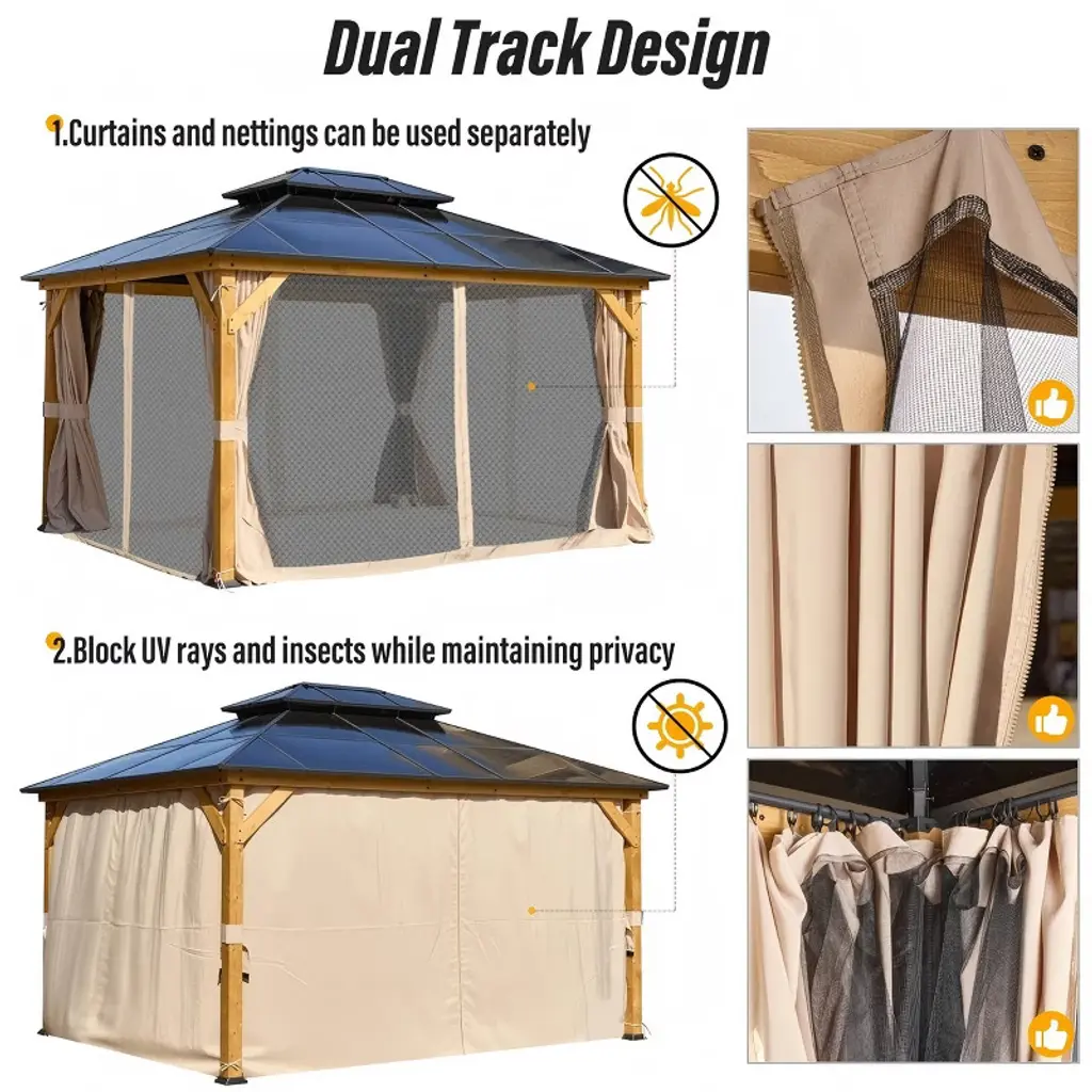 With an expansive 13 FT X 15 FT space, this patio gazebo provides an outdoor spot for relaxation and entertaining and stands out with its unique polycarbonate roof design that brilliantly blocks sun, rain and snow, creating a comfortable and functional outdoor retreat.
