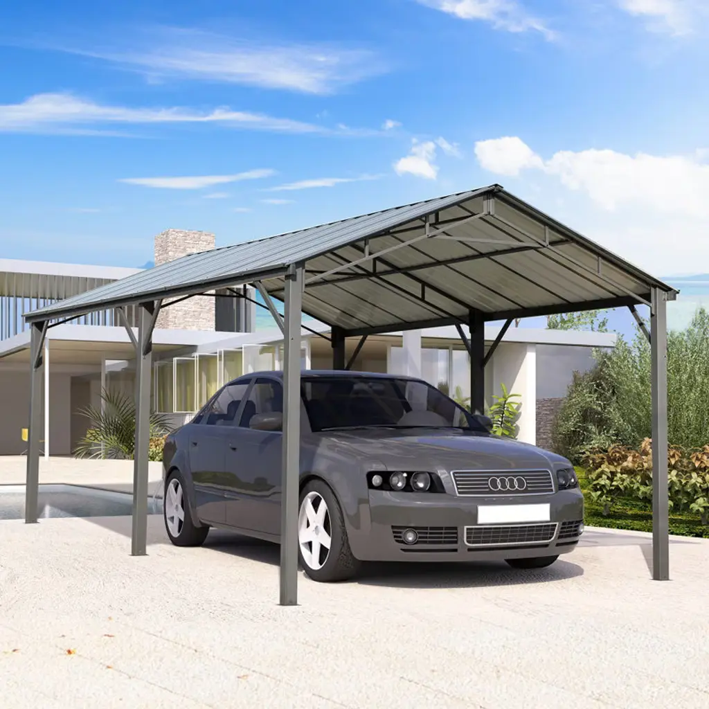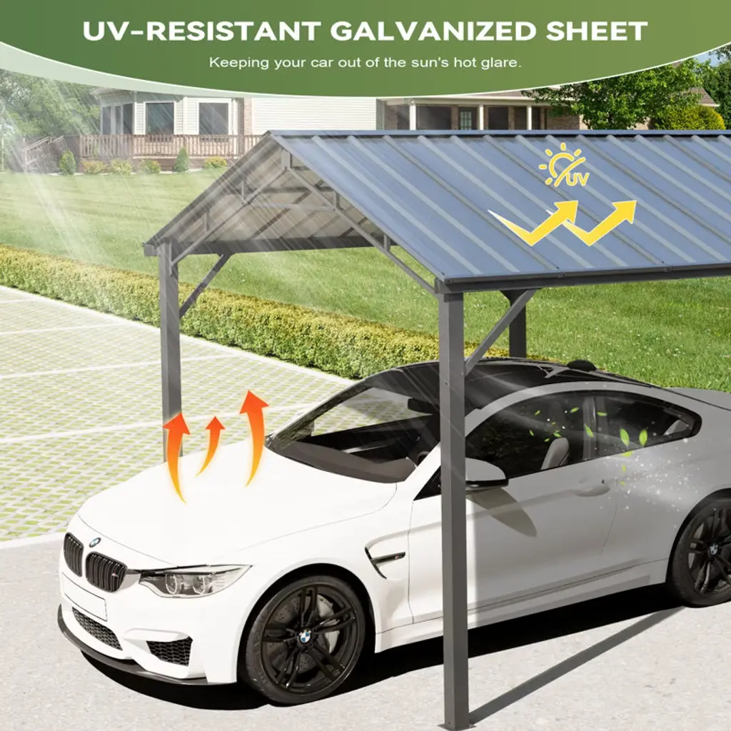 This Heavy-Duty Steel Garage is a spacious shelter for storing cars, boats and outdoor items, providing a versatile storage solution. Crafted with high-quality galvanized steel roof, it provides exceptional anti-rust and sun protection, ensuring reliable safeguarding of your belongings. With its size, it accommodates various vehicles and outdoor equipment effortlessly. Whether for sheltering your car, boat, or RV, this carport has you covered. Additionally, it serves as an ideal space for outdoor gatherings, allowing you to place a sectional dining set underneath for party enjoyment anytime. Perfect for outdoor activities, storage, and more, this carport is a practical addition to any property.