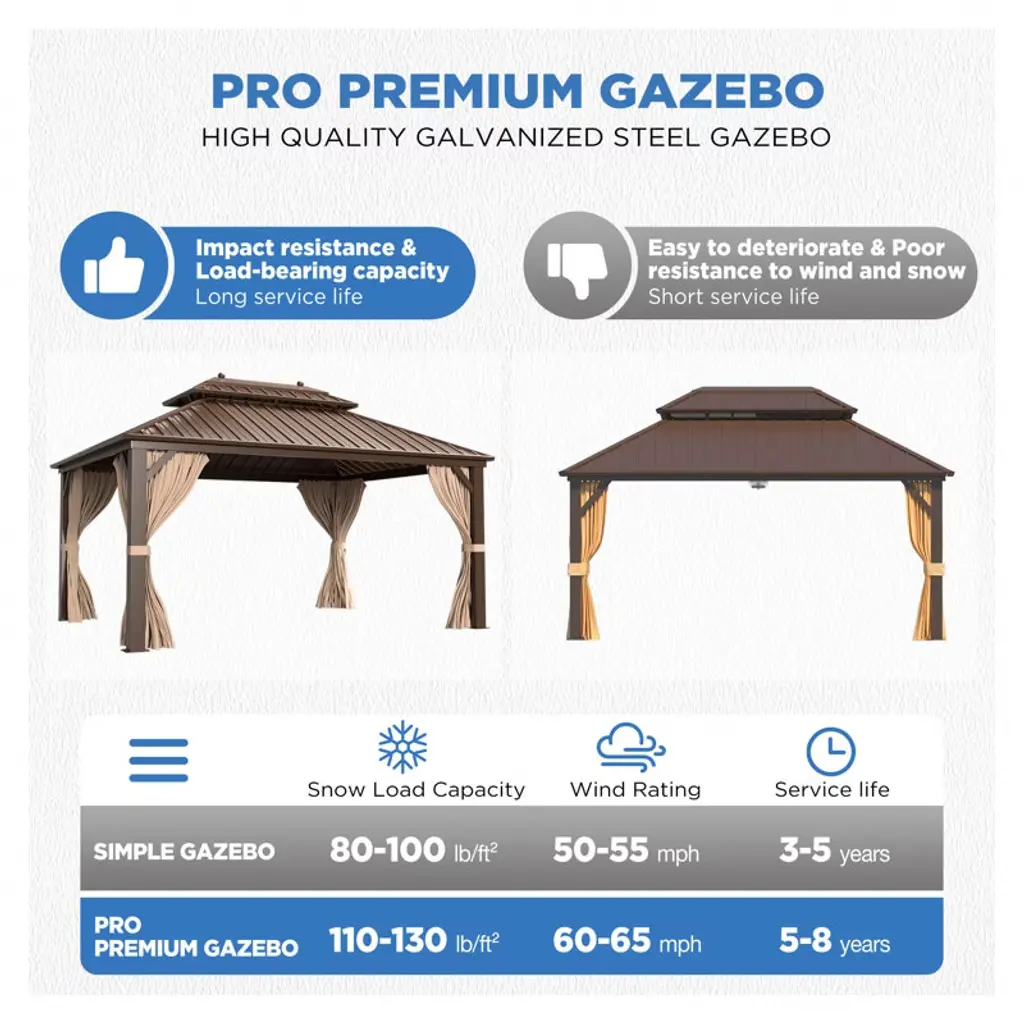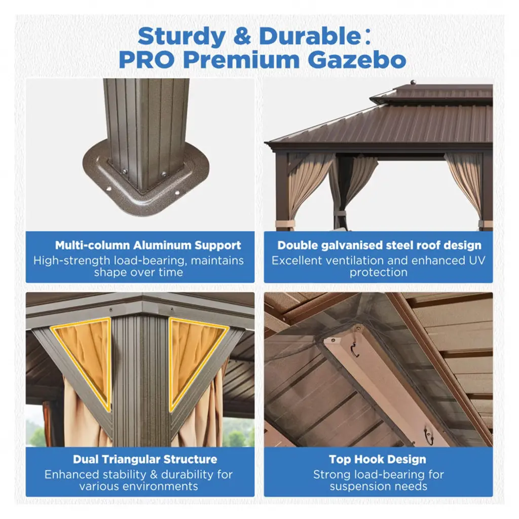 PRO Premium Gazebo is a practitioner of long-termism, made of high quality galvanized steel and aluminum, after 12 precision machining and three layers of composite coating process - galvanized process & anti-rust process & plastic spraying process, to achieve 3 times of corrosion resistance beyond the standard. The structure has been verified by lab test to withstand strong wind over 60MPH and 110lb/ft² snow load, with unique integrated drainage system and terrain-adaptive anchoring base to ensure stable guarding of the whole scenario, and easy to deal with the severe environments such as torrential rain, blizzard and gusty winds and we promise 1 year structural nature warranty! Meanwhile, it is worth mentioning that our Pro gazebo has 20% less screws than other products, which can save 30% of installation time!