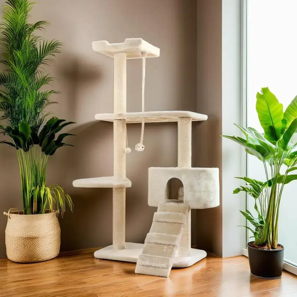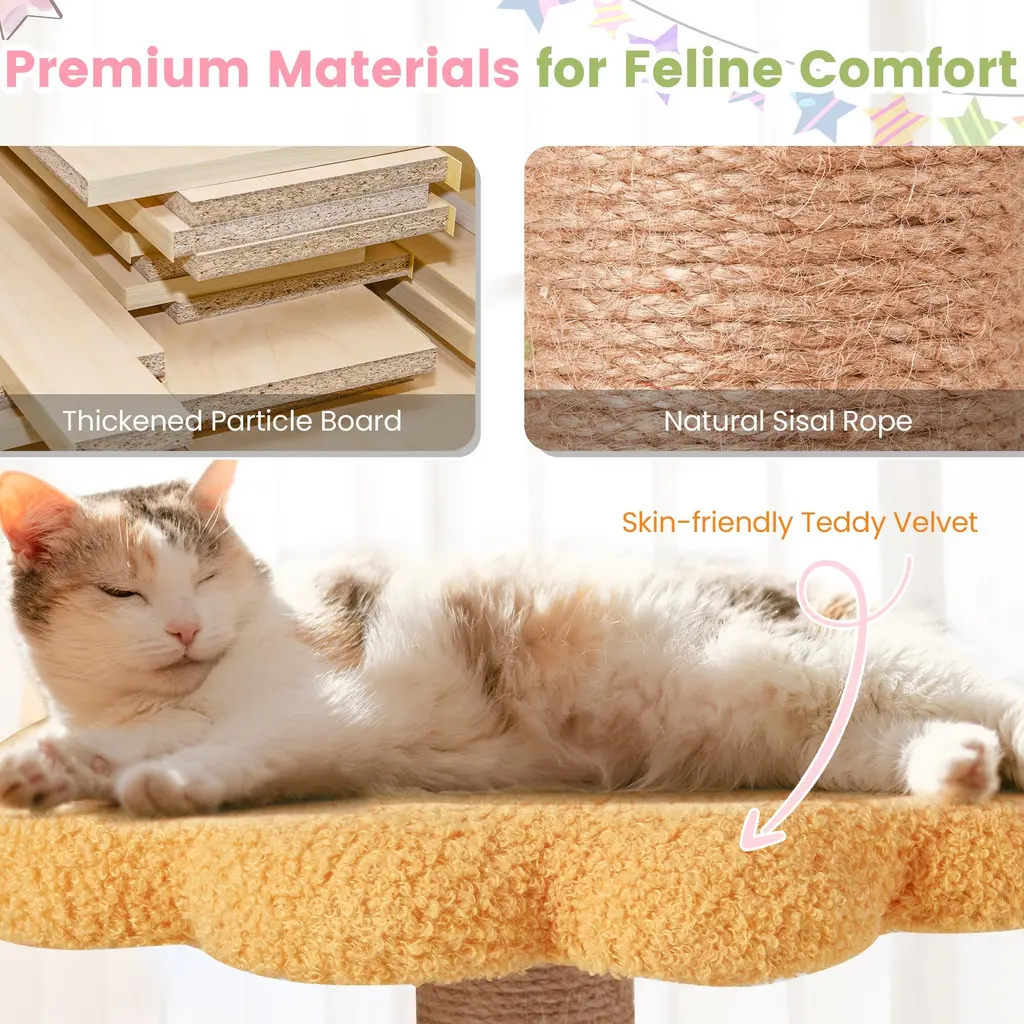 【Premium Material】The cat tree features a premium plush fabric, offering ultimate comfort for your cats. Its 100% natural sisal adds elegance and durability. A large base board ensures stability and safety. Your cats will feel cozy and secure in this luxurious haven. 【All-in-One Design】The top boasts charming top perch, enhancing your cat's playtime. With natural sisal scratching posts, 2 cozy hammocks, 2 fluffy balls, cute pendants, and 2 spacious condos, this cat tower offers both entertainment and relaxation. The cat furniture is the all-in-one solution for your feline's needs. 【Multi-level design]】Our multi-level cat tree towers provide varied heights and spaces for your cat to explore. With scratching posts, caves, platforms, cozy hammocks, and top perch, your cat will have endless fun satisfying their curiosity. 【Stable & Stylish】To ensure the utmost safety for our active kittens and cats. Our play towers & trees for cats boasts a reinforced base, an anti-toppling strap, scratch posts wrapped in durable sisal, and anti-tipping devices. Decorated with cute pendants, it's cute and stylish. It's the perfect cat castle for your feline friends to indulge in playtime and relaxation, all on their own terms. 【Easy to Clean & Assemble】The material of the cat tree is machine washable. Your cat's health and happiness are our priority, so they can play worry-free. Plus, our cat condo includes a detailed manual and tutorial, simplifying setup. Spend less time assembling and more time playing with your cats!