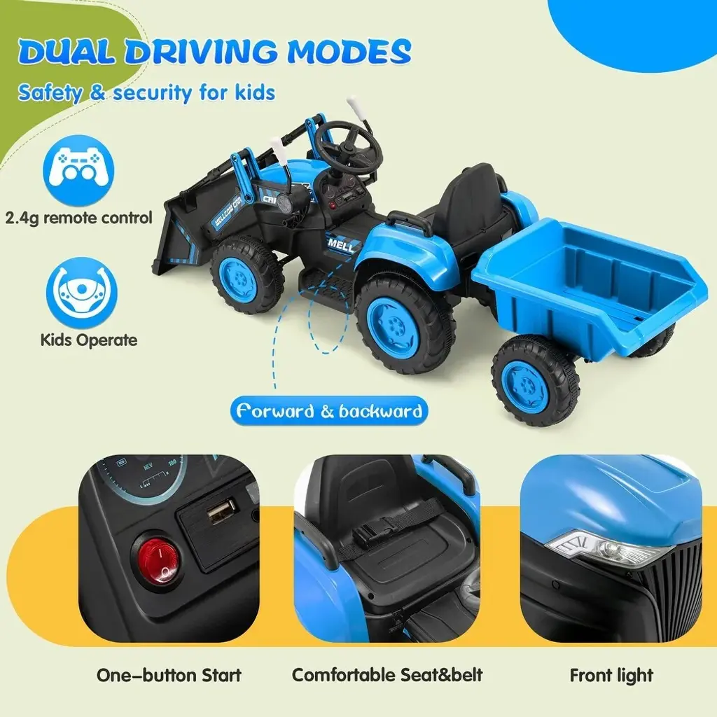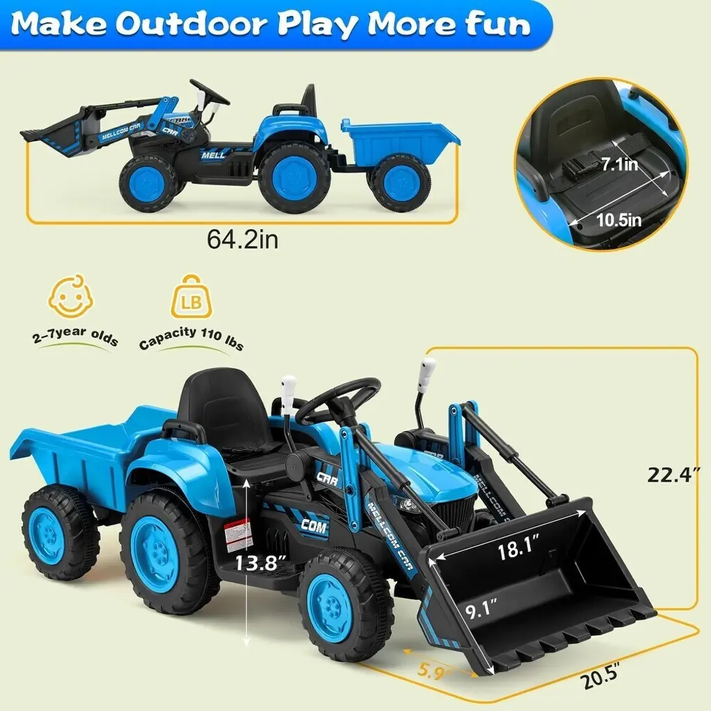 【Functional Excavator Arm】 This electric ride-on excavator is designed with a fully functional arm and loading shovel, operated through a digging handle. Children can engage in authentic digging, shoveling, and dumping activities, enhancing their imaginative playtime. 【Interactive Features】 This battery-powered ride-on vehicle is equipped with exciting features, including LED headlights, a horn, a 2.4G remote control, Bluetooth connectivity, a one-button start, an accelerator pedal, and both forward and reverse settings. It also has adjustable volume and three-speed options, along with a central control panel that supports Mp3, USB, and Aux inputs for added fun. 【Detachable Large Trailer】 The RC excavator includes a spacious trailer that can be easily attached or removed, providing a dumping function for extra entertainment during play. 【Long Battery Life】 With an external charging port, this ride-on excavator allows for 1-2 hours of continuous play on a full charge, giving your child plenty of time for adventures. 【Safe and Sturdy Build】 Made from durable PP and iron materials, this excavator can support up to 110 pounds, making it suitable for children aged 2 and older. The puncture-proof plastic wheels and included seat belt ensure a safe ride. 【Charging Guidelines】 For optimal performance and safety, charge the electric car for 8-12 hours before the first use. Recharge the battery when it drops to 20%, and always turn off the power switch when the toy is not in use.