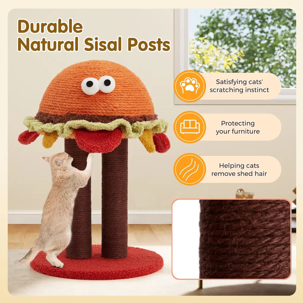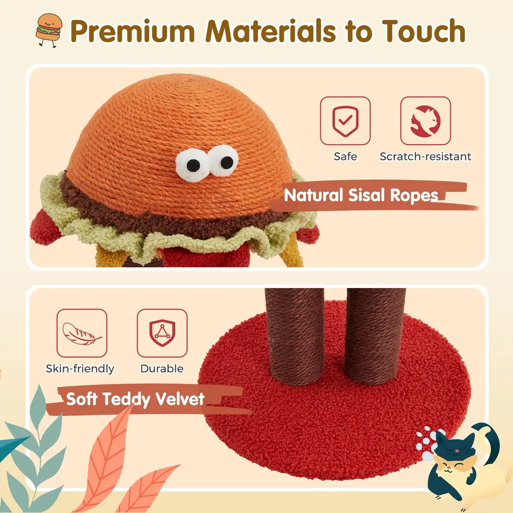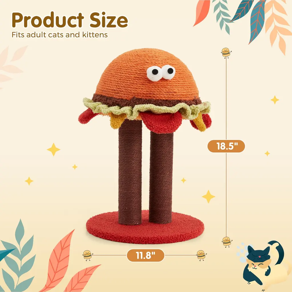 Adorable Hamburger Design Cat Scratcher: This playful hamburger cat scratching post adds a whimsical touch to your home while satisfying your cat’s natural scratching instincts. With a fun burger shape and bold character details, it doubles as a decorative cat toy and stylish scratcher that fits seamlessly into any indoor space. Dual Sisal Posts for Maximum Stability and Durability: Featuring two reinforced sisal-covered scratching posts and a thick base, this cute cat scratcher is built to withstand daily clawing and climbing. Unlike flimsy single-post scratchers that easily tip over, our double-post design ensures lasting balance and reliable performance during active play. 100% Natural Sisal for Healthy Scratching: Crafted with tightly wound natural sisal rope, this scratching post gives your cat the satisfying texture they crave for claw maintenance. The durable sisal surface prevents fraying and shedding, offering long-term use while protecting your furniture from unwanted damage. Heavy-Duty Base Prevents Wobbling or Tipping: Built on an 11.6-inch wide particleboard platform, this indoor cat scratching post offers strong support and prevents wobbling, even with aggressive cats. Unlike lightweight options that easily move or fall, this stable base keeps the scratcher safely in place during play. Easy Assembly with All Tools Included: Designed for convenience, this kitten and cat scratcher comes with pre-drilled holes, tools, and clear instructions. It assembles in minutes with no extra hardware needed. For added support, our responsive customer service team is available to help ensure a smooth setup.