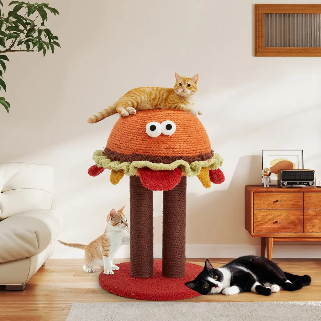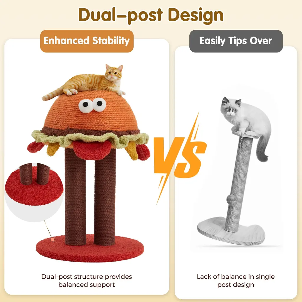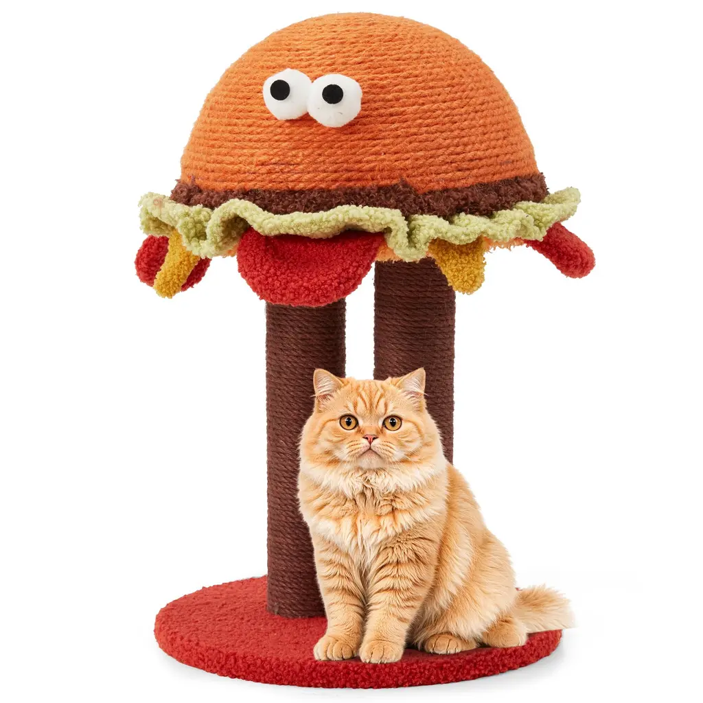 Adorable Hamburger Design Cat Scratcher: This playful hamburger cat scratching post adds a whimsical touch to your home while satisfying your cat’s natural scratching instincts. With a fun burger shape and bold character details, it doubles as a decorative cat toy and stylish scratcher that fits seamlessly into any indoor space. Dual Sisal Posts for Maximum Stability and Durability: Featuring two reinforced sisal-covered scratching posts and a thick base, this cute cat scratcher is built to withstand daily clawing and climbing. Unlike flimsy single-post scratchers that easily tip over, our double-post design ensures lasting balance and reliable performance during active play. 100% Natural Sisal for Healthy Scratching: Crafted with tightly wound natural sisal rope, this scratching post gives your cat the satisfying texture they crave for claw maintenance. The durable sisal surface prevents fraying and shedding, offering long-term use while protecting your furniture from unwanted damage. Heavy-Duty Base Prevents Wobbling or Tipping: Built on an 11.6-inch wide particleboard platform, this indoor cat scratching post offers strong support and prevents wobbling, even with aggressive cats. Unlike lightweight options that easily move or fall, this stable base keeps the scratcher safely in place during play. Easy Assembly with All Tools Included: Designed for convenience, this kitten and cat scratcher comes with pre-drilled holes, tools, and clear instructions. It assembles in minutes with no extra hardware needed. For added support, our responsive customer service team is available to help ensure a smooth setup.