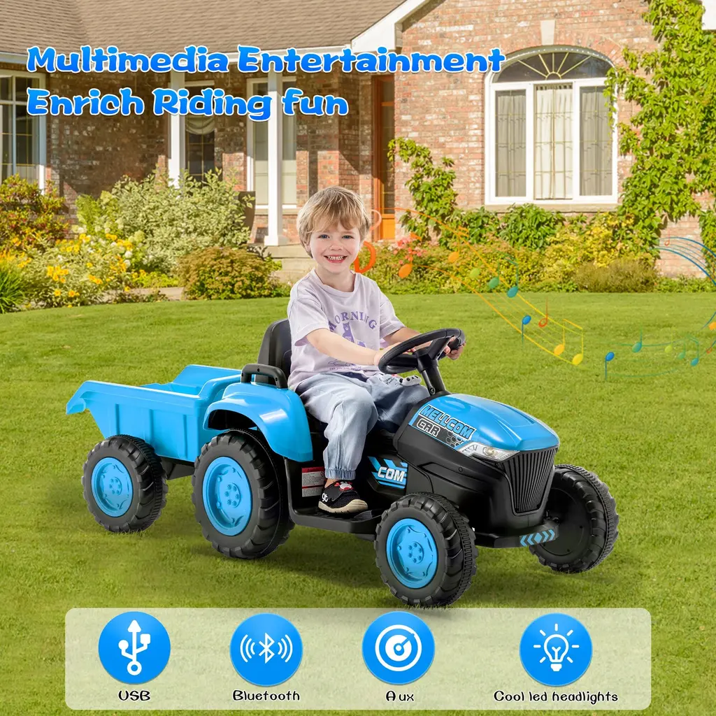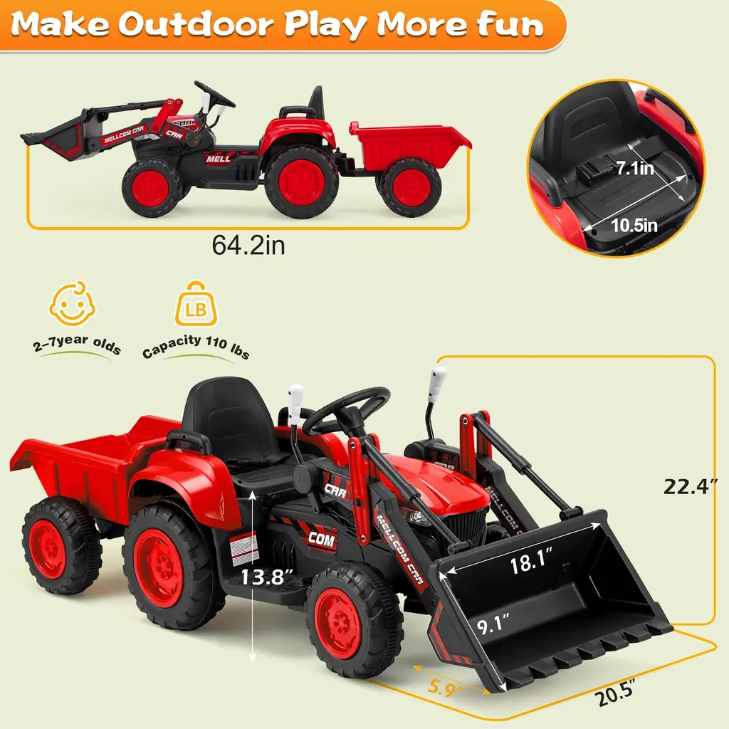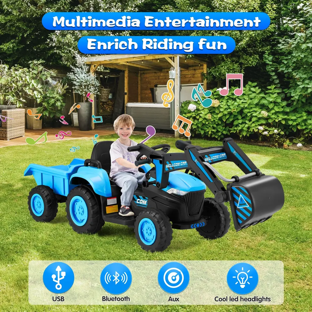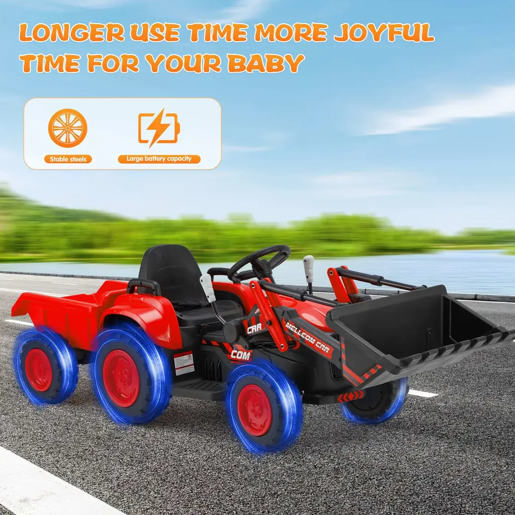 【Function Load Digger】 This ride on excavator toy has a real functional arm and a loading shovel. Controlled by a digging handle, this kids' excavator toy can actually achieve movements like dig, shovel and dump. 【Rich Interactive Functions】 This battery powered electric vehicle has LED headlights, horn,2.4g remote control, Bluetooth connection, one-button start, accelerator pedal, forward and backward, volume adjustment, high/medium/low speed can be adjusted, music central control panel (Mp3/USB/Aux) functions. 【Detachable Large Trailer】 This Rc excavator is designed with an easily disassemble large trailer and trailer can be dumped. 【Long Battery Life】These kids ride on toy has an external charging port. The fully charged excavator can support your children to play continuously for 1-2 hours. 【Safe & Durable】 This kids excavator ride on includes plastic wheels that will never deflate. It's made of PP + iron, the structure is firmer, with a load of 110 pounds, which can carry children over 2 years old and the seat belt is equipped to make it safer. 【Usage Tips】 Ensure safe and optimal usage of your electric car by fully charging it for 8-12 hours before first use. Remember to recharge the car when the battery level drops to 20% and turn off the power switch when not in use.