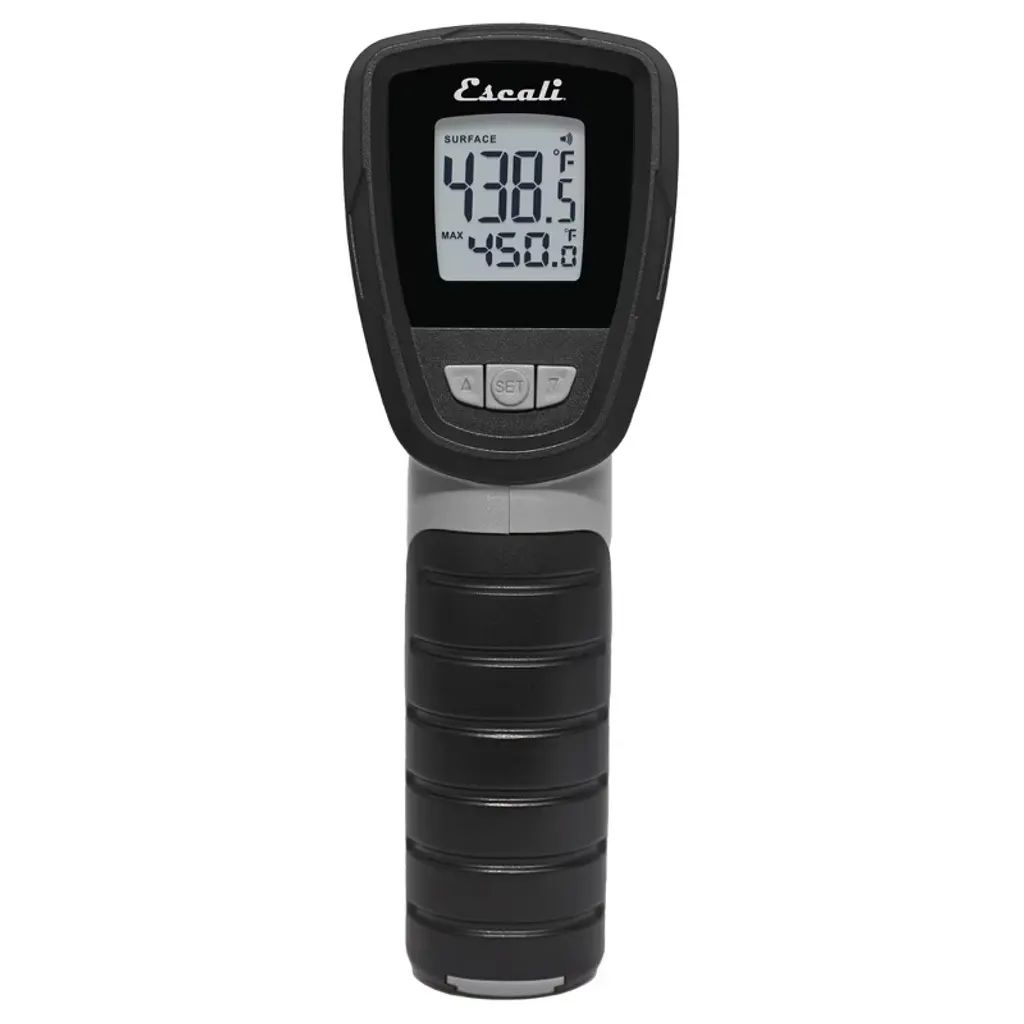 The Escali DH8 is an extremely useful tool for the home or outdoor cook with the functions of two thermometers in one device. In surface (infrared) mode the DH8 is able to read surface temperatures and when in probe mode can read internal temperatures. The IR mode is great for checking the surface temperature of grill grates, pizza stones or the food you are cooking while the probe mode allows you to check the internal temperatures of foods to make sure they are at temperatures safe for consumption. Unlike other two in one devices, the DH8 is a handheld infrared thermometer with a built in port that allows a probe thermometer to be plugged into the unit and used like a grill probe thermometer. The unit also allows for additional functionality like hold, min/max temperatures, and audible alerts. The DH8 boasts a bright white backlit display with large numbers that are easy to read in all lighting conditions and viewing angles. The DH8 is a great tool for the home or outdoor cook that would like the ability to check both surface and internal temperatures but would prefer to have that ability in one easy to use product.