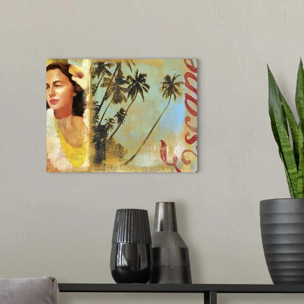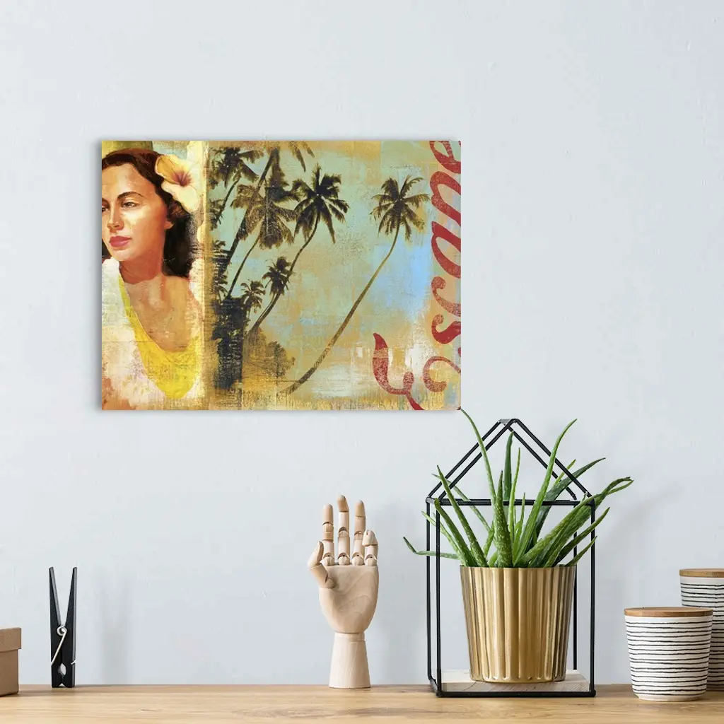 Large collage of a woman with a tropical flower in her hair and the silhouette of palm trees over a grungy background on a canvas.