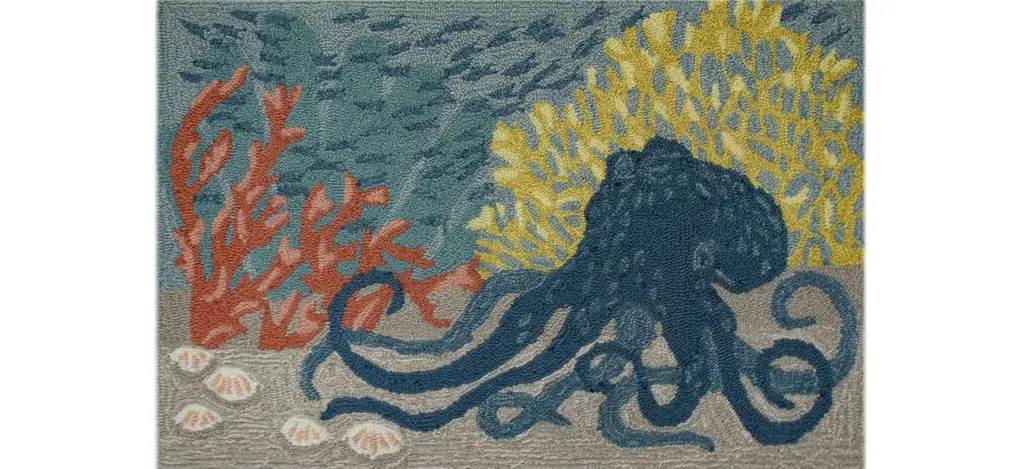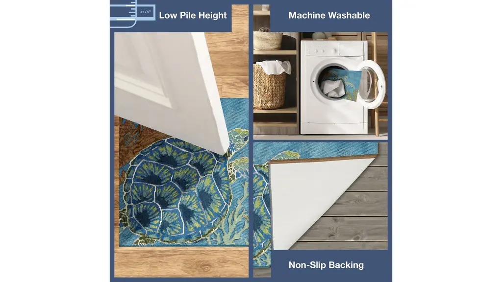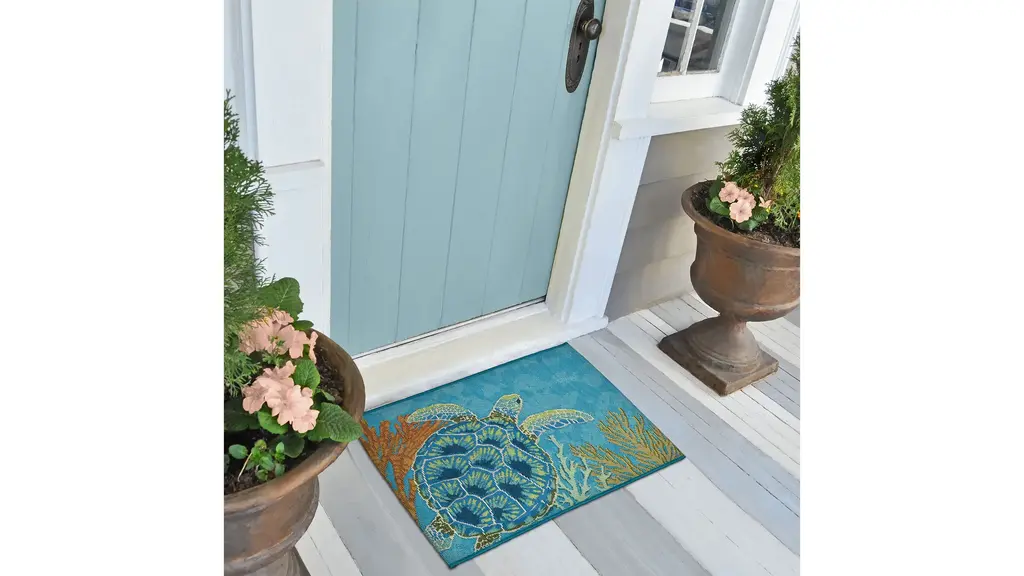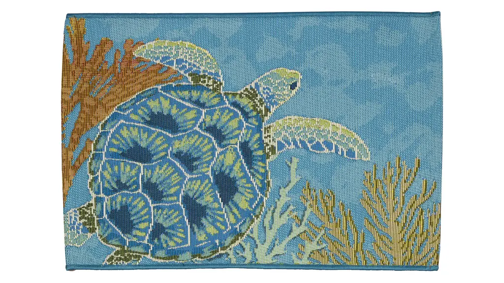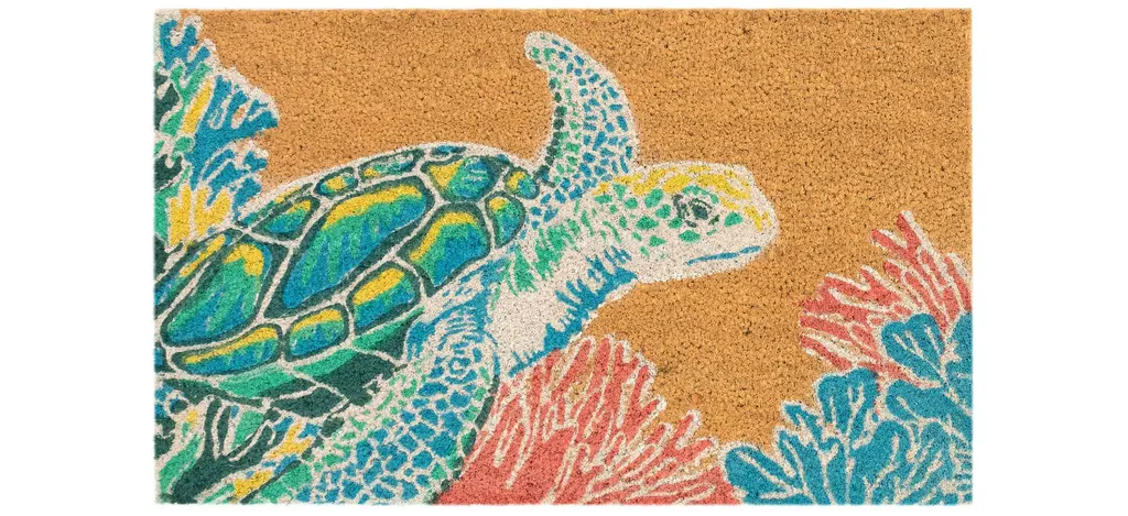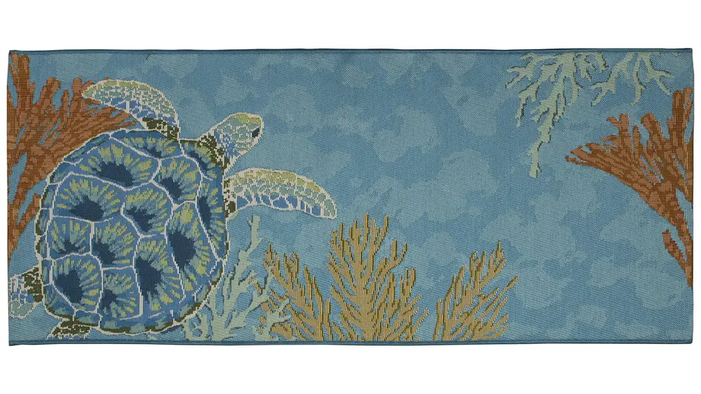 The Esencia Sea Turtle Garden Indoor/Outdoor Mat features a sea turtle swimming peacefully in coastal, cool blue waters among the multicolored coral will effortlessly complement any space inside or outside your home.