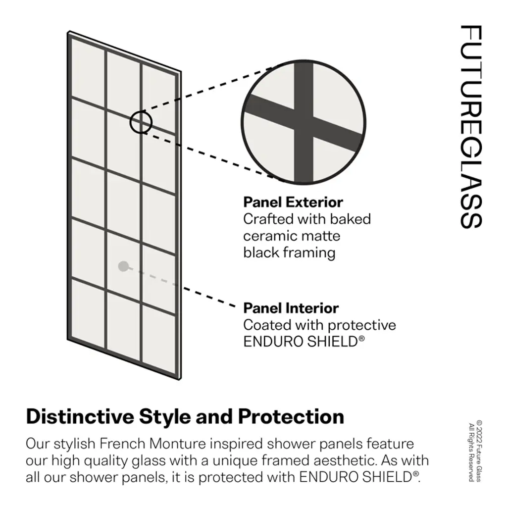 Make a striking statement in your bathroom with the eye-catching design of the Esprit fixed shower panel. High-quality glass enhances the light in your space, while the industrial aesthetic introduces a contemporary feel. Taller than most competitor shower enclosures, our 3/8” tempered glass panels come in a standard 78” height. Glass is treated with EnduroShield coating, which aids in repelling water and soap residue. In addition, our superior quality solid brass hardware is available in a variety of color finishes to suit any bathroom. With an extensive range of fixed shower panel sizes available, the Esprit by Glass Warehouse has a sleek, ceramic, matte black finish baked onto the glass making it a long-lasting, easy to clean design.