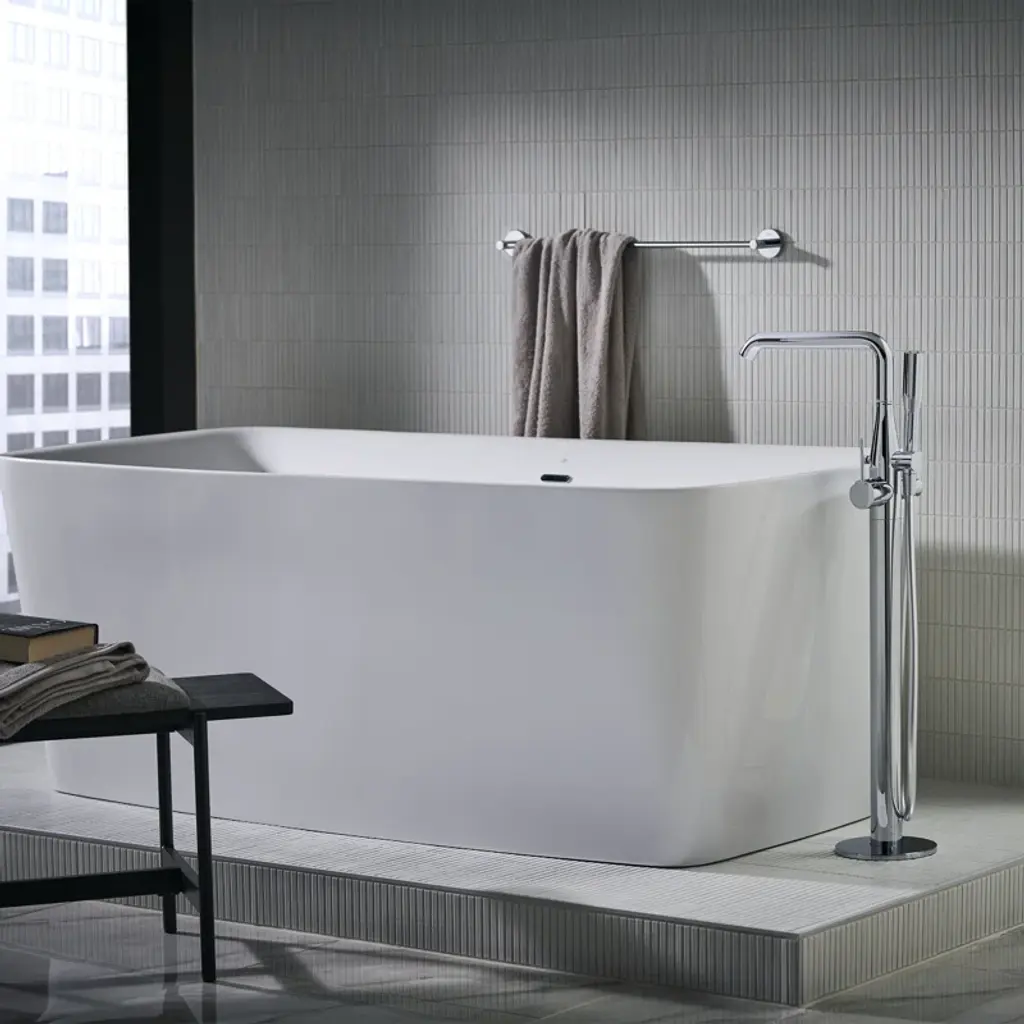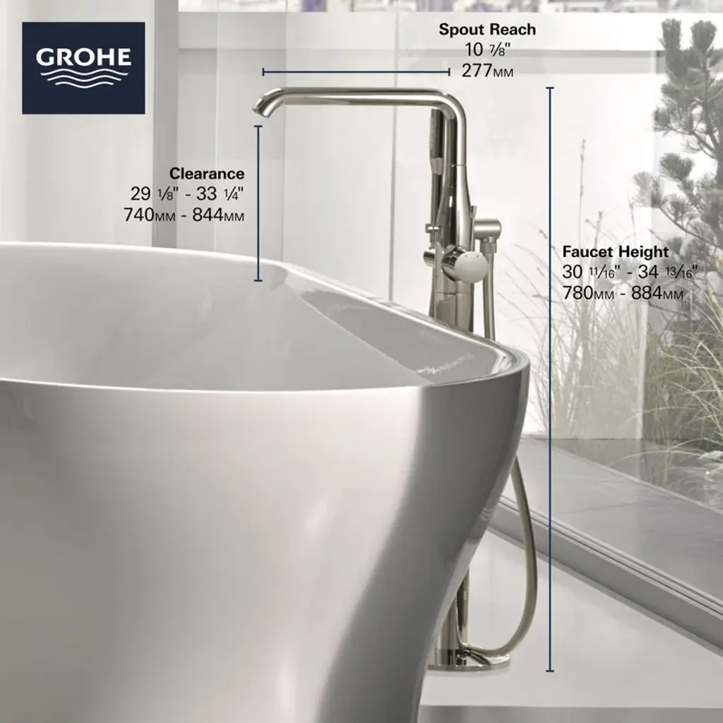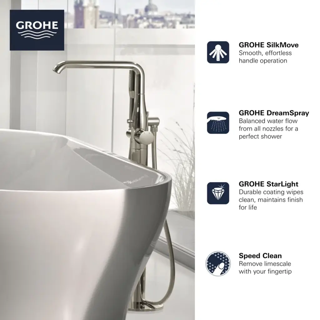 Sleek, sophisticated, and available in an array of exquisite finishes, this product adds a distinctive touch to your freestanding bathtub. Engineered with impressive features for today's well-appointed home, the Essence Freestanding Tub Filler ensures superior performance with smooth, GROHE SilkMove handle operation, lasting beauty with the durable GROHE StarLight finish, and a relaxed experience with the Euphoria Stick Hand Shower featuring GROHE DreamSpray. This contemporary tub filler embodies all the elements of precision craftsmanship and design excellence that have made GROHE the choice for discerning homeowners.