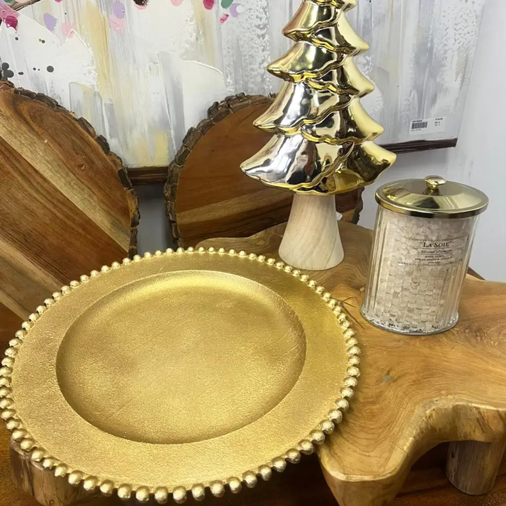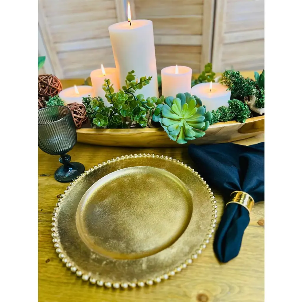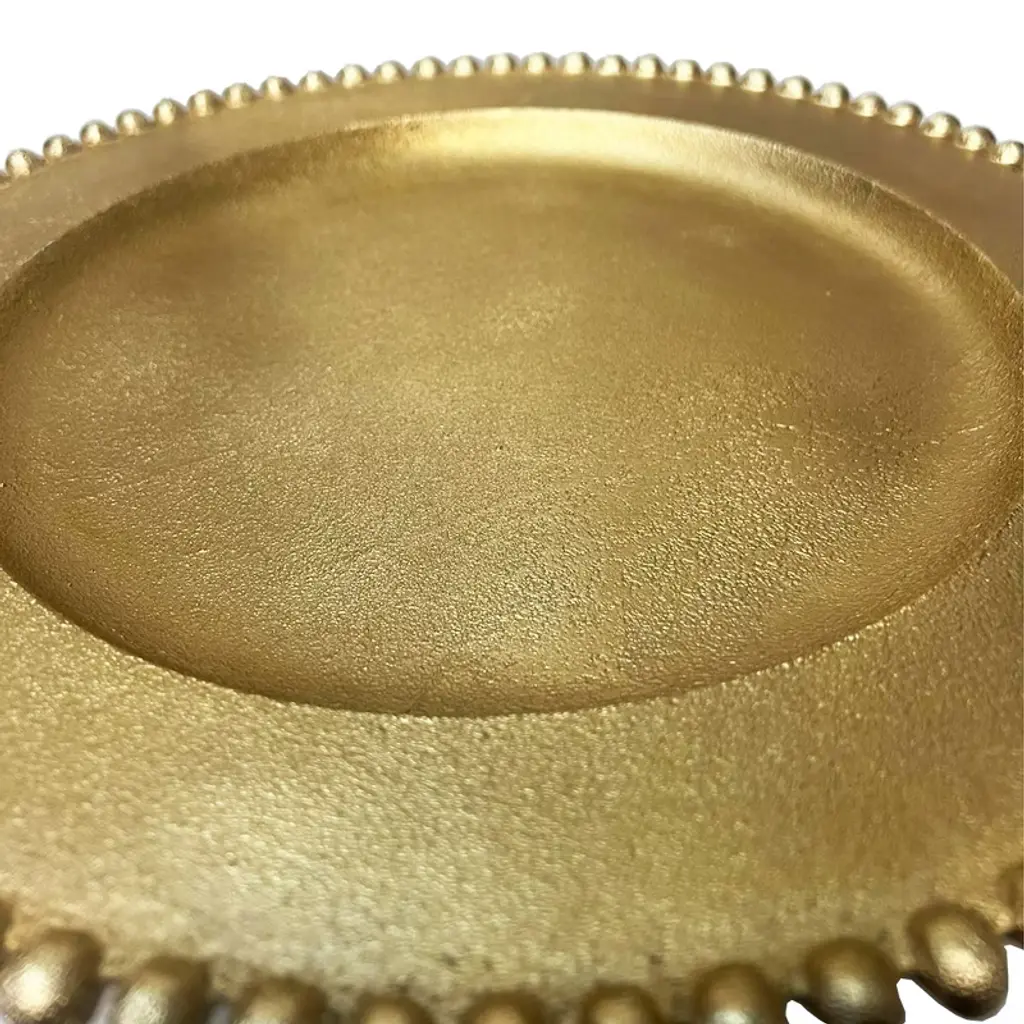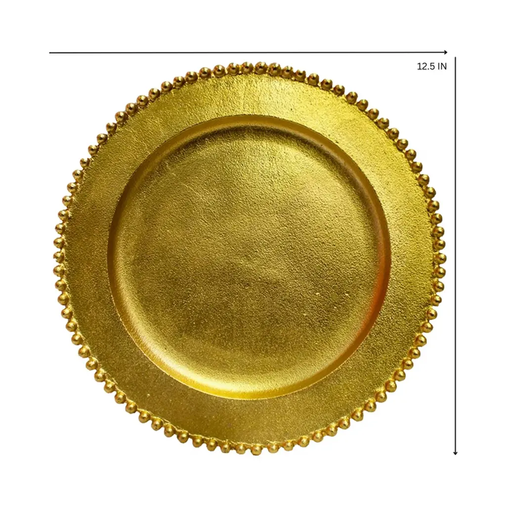 These charger plates bring a touch of rustic elegance to your dining table. The aluminum construction gives them a warm, metallic look, while the beaded rim adds a touch of texture and visual interest. The gold finish complements a variety of dinnerware styles, making them perfect for both everyday use and special occasions.