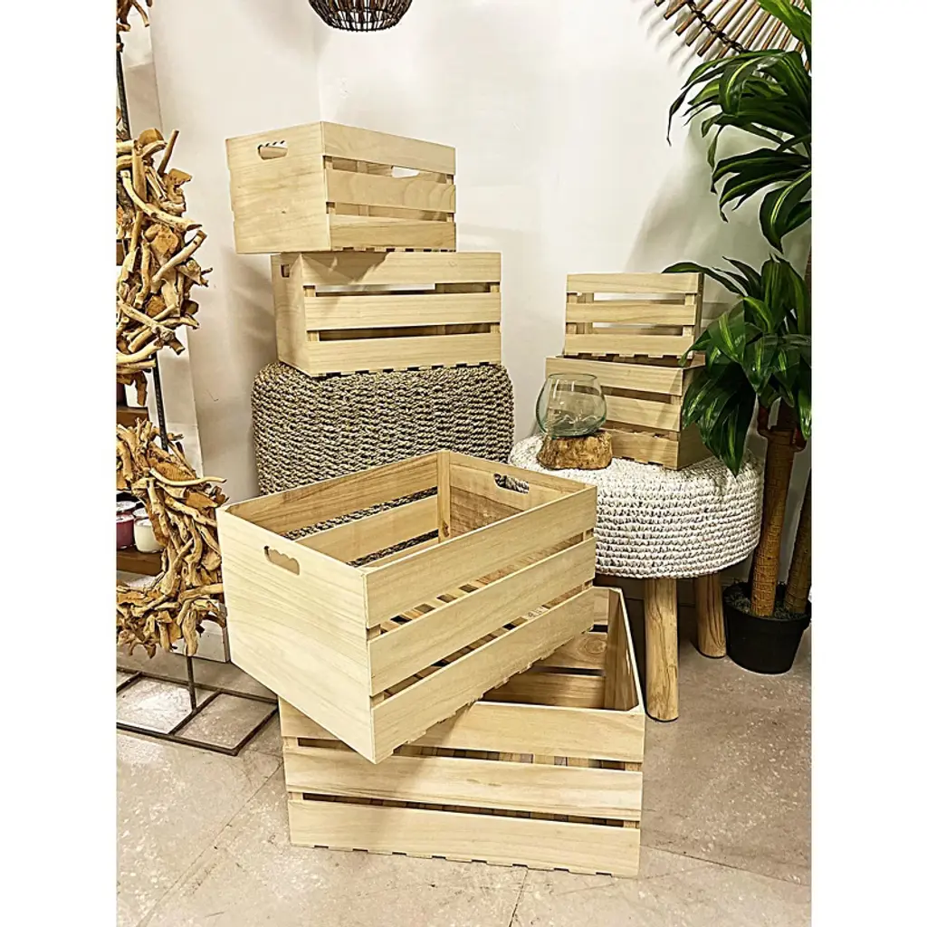 The Essential Decor & Beyond 6-Piece Natural Wooden Crate Storage Set is a stylish and practical solution for home organization. Combining functionality with rustic charm, this versatile set helps keep your space neat while adding a touch of natural beauty. "Set of Six: Includes six different sizes of crates, offering versatility for various storage needs and spaces. XXL: 10.24" H x 19.68" L x 14.96" W XL: 9.45" H x 17.72" L x 13.39" W Large: 8.66" H x 15.75" L x 11.81" W Medium: 7.87" H x 13.78" L x 10.24" W Small: 7.09" H x 11.81" L x 8.66" W Extra Small: 6.3" H x 9.84" L x 7.09" W