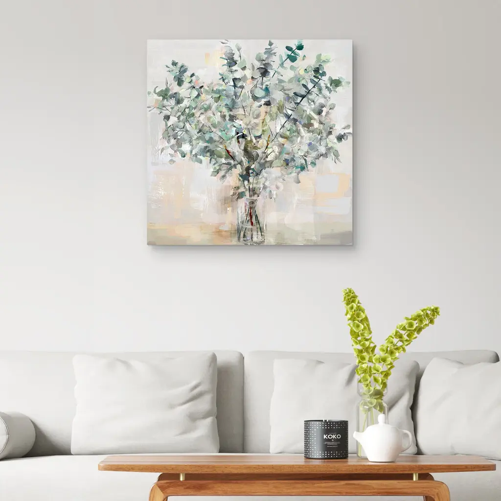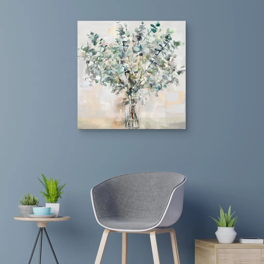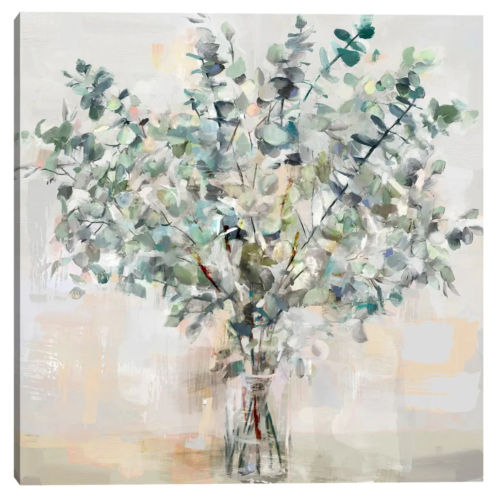 A bouquet of colorful blossoms always fill a room with joy, but understated greens like silver dollar eucalyptus certainly have a place in the decorative realm. Tolerant to extreme temperatures at the mercury's upper end, this floral filler looks perfectly lovely in a glass vase independent of blooms and won't expire without water. Essential Greens I by Studio Arts canvas print is a classy and sophisticated image.