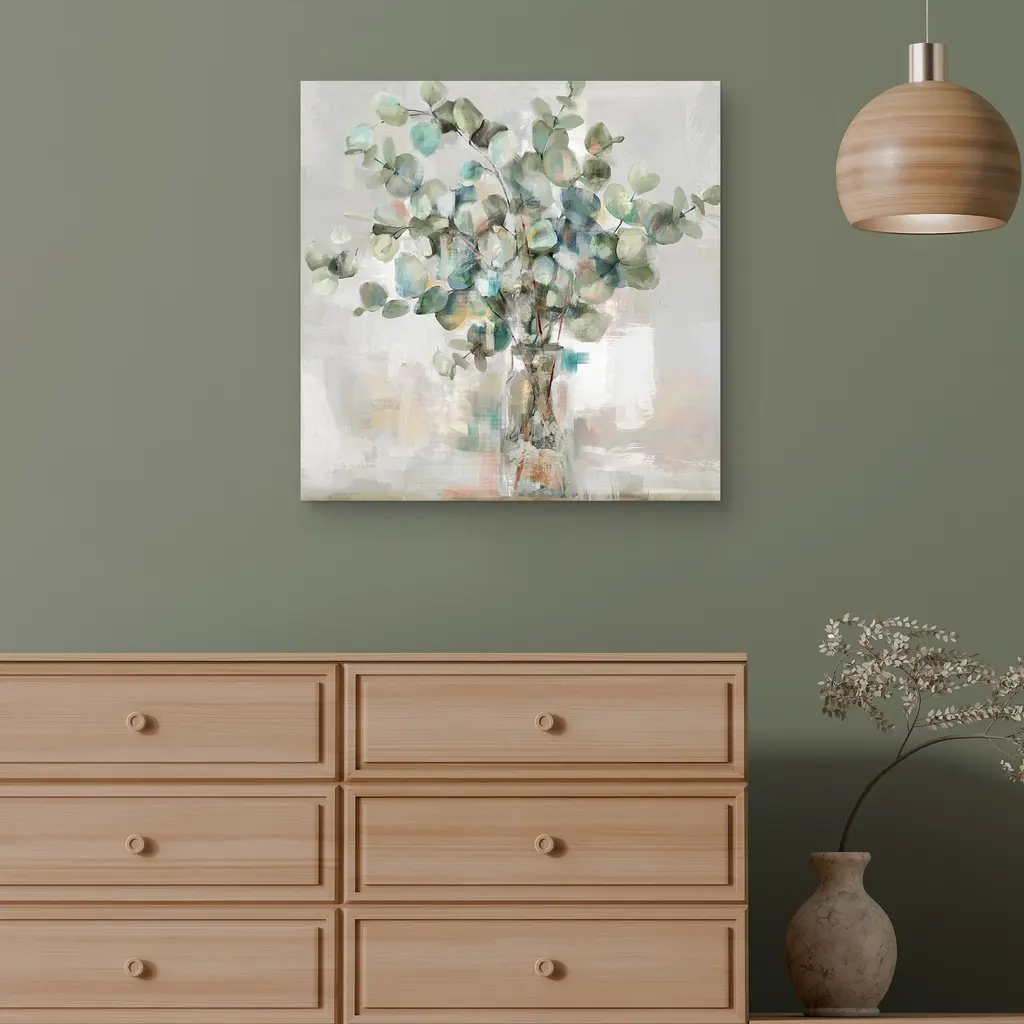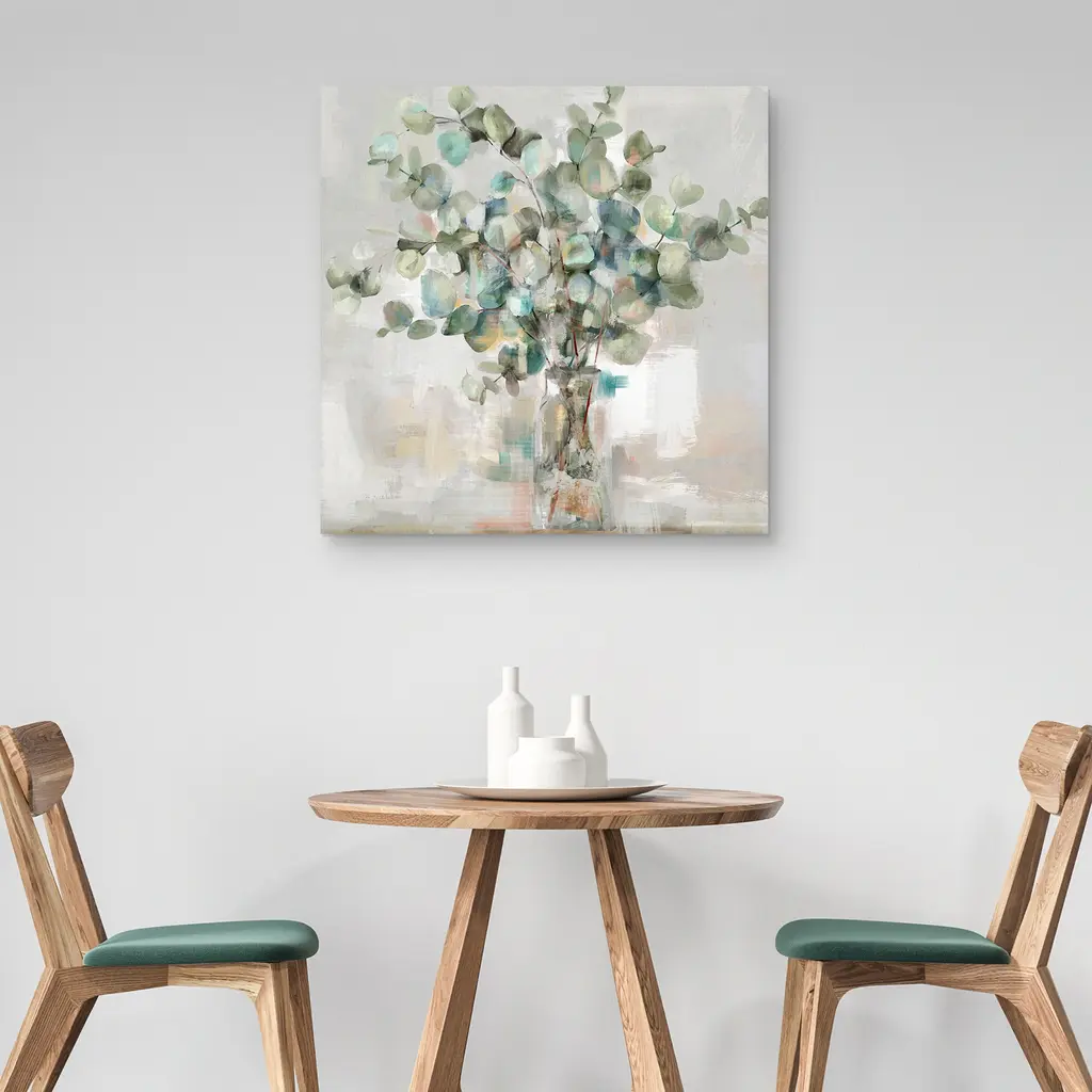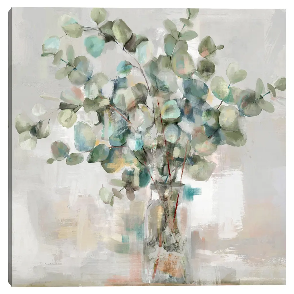 A bouquet of colorful blossoms always fill a room with joy, but understated greens like silver dollar eucalyptus certainly have a place in the decorative realm. Tolerant to extreme temperatures at the mercury's upper end, this floral filler looks perfectly lovely in a glass vase independent of blooms and won't expire without water. Essential Greens II by Studio Arts canvas print is a classy and sophisticated image.