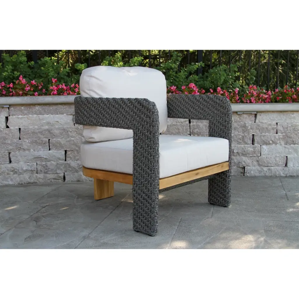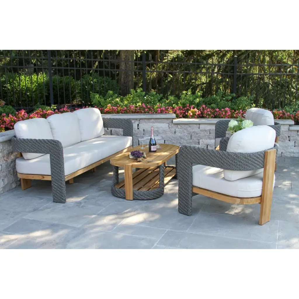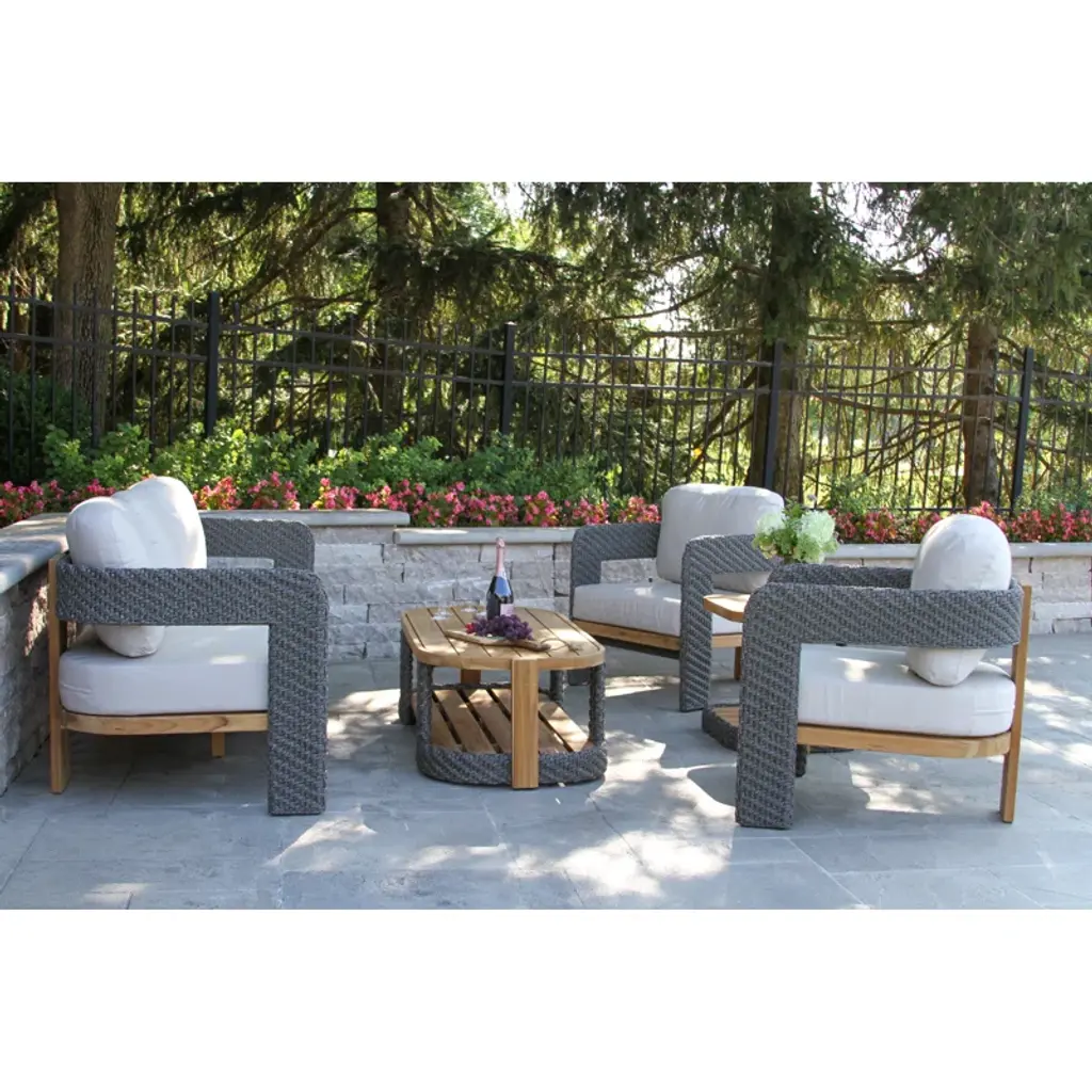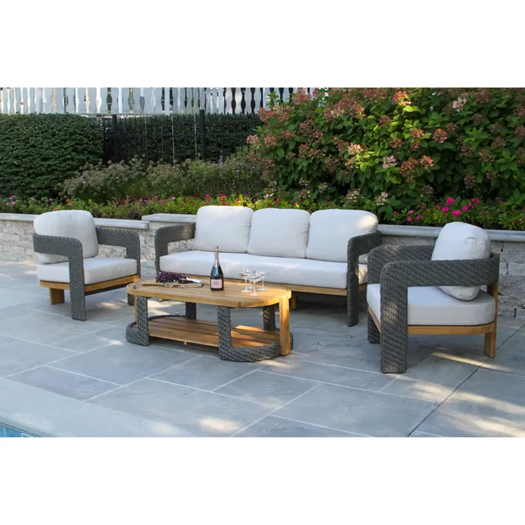 This 4 pc. modern seating group includes a luxurious sofa, armchairs, and coffee table, all exuding a modern flair that complements any contemporary outdoor space. Made with FSC teak hardwood, HDPE wicker, powder-coated aluminum frames, and Sunbrella fabric, this set is built to last. Each piece comes fully assembled, so you can enjoy it immediately!