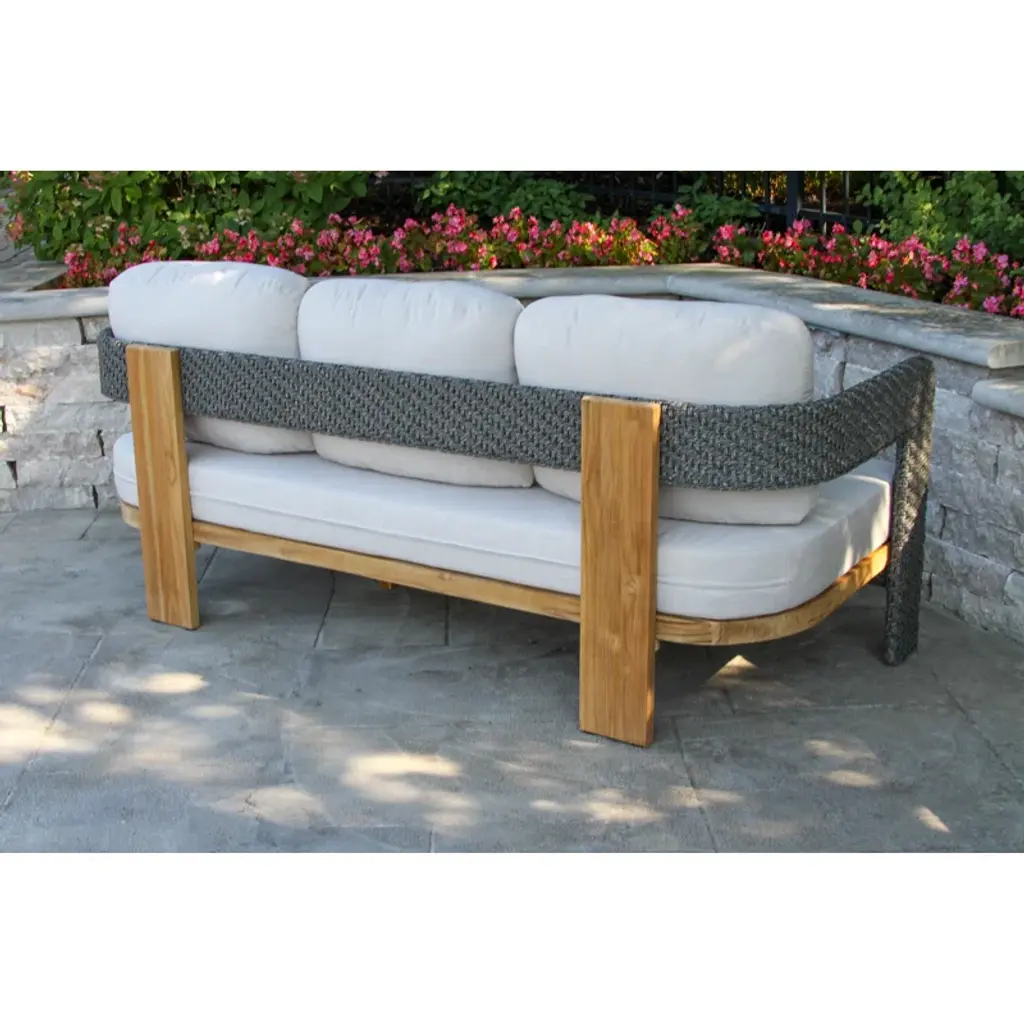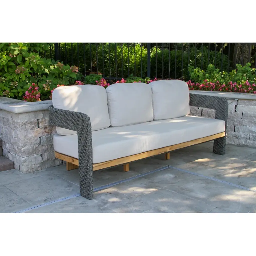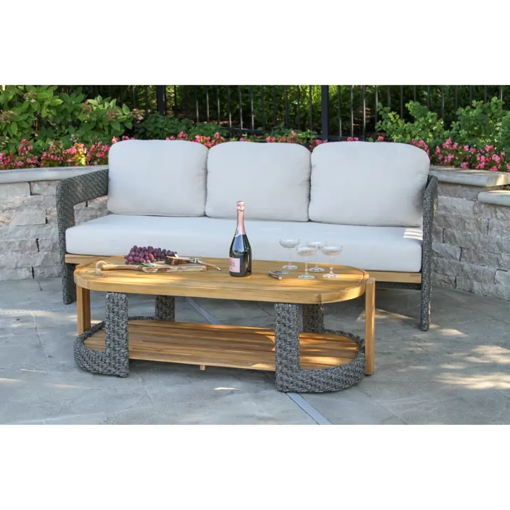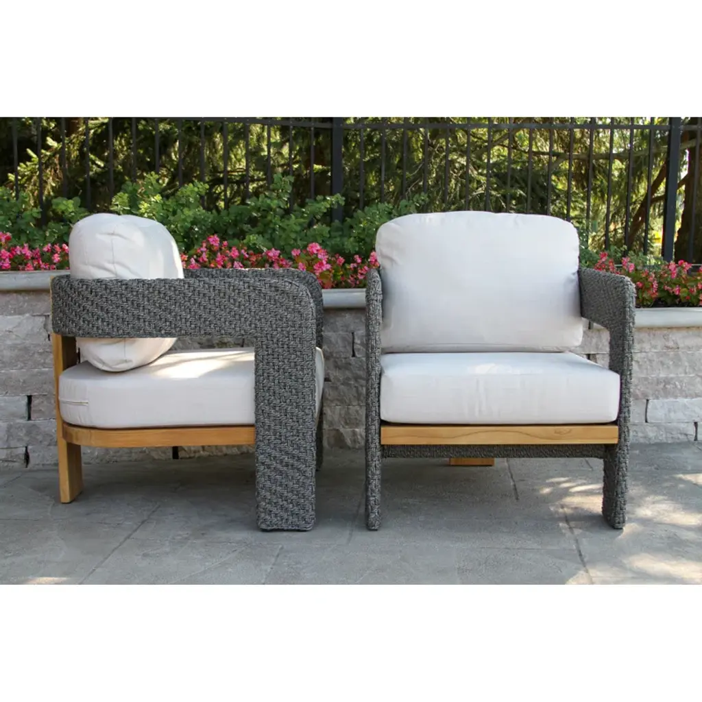 This 4 pc. modern seating group includes a luxurious sofa, armchairs, and coffee table, all exuding a modern flair that complements any contemporary outdoor space. Made with FSC teak hardwood, HDPE wicker, powder-coated aluminum frames, and Sunbrella fabric, this set is built to last. Each piece comes fully assembled, so you can enjoy it immediately!