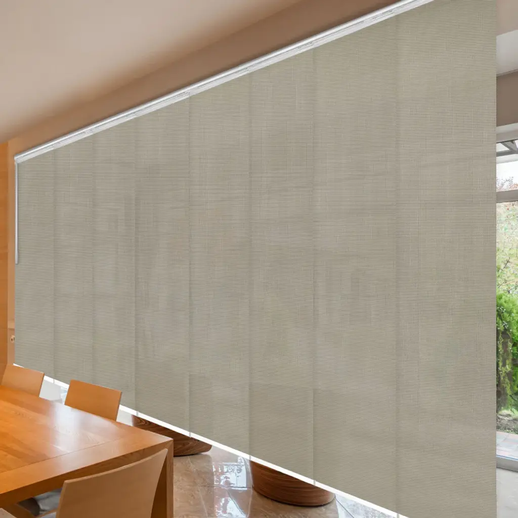 Central Design Products is pleased to introduce a new innovative panel track that offers easy 2-way installation, adding an alluring style and refined touch to your home decor. The double rail design of the track is sleek, compact, and reduces the overall footprint and weight of the installation, eliminating bulky, intrusive window treatments. Adjusting the panel height is a breeze � simply trim the panel, re-attach the liner, and install the panel weight. Detailed instructions are included.The panel track also features a patented slider design, made with aluminum and fitted with bearings that allow for durable and smooth operation. The sliders are stacked closer together than conventional panel tracks, reducing light bleed coming from the gaps between panels. This track has endless uses from dividing rooms, garages, offices, and closets to decorating windows and patios. Available in smaller sizes including 3, 4, 5, 6, and 7 panels. Extends from 130-175� wide. Each panel measures 23.5" wide and 91.5" tall, with a total installation height of 94" (includes the 2.5" rail track). The track can be wall or ceiling mounted. The panels can stack on the left or the right. The clearance from the wall is extendable from 1.25� to 3.25� and projection from the wall is extendable from 3� to 4.25�. Estelle panel is made from 85% Vinyl 15% Polyester, with a light filtering shade that blocks 60% of the light.