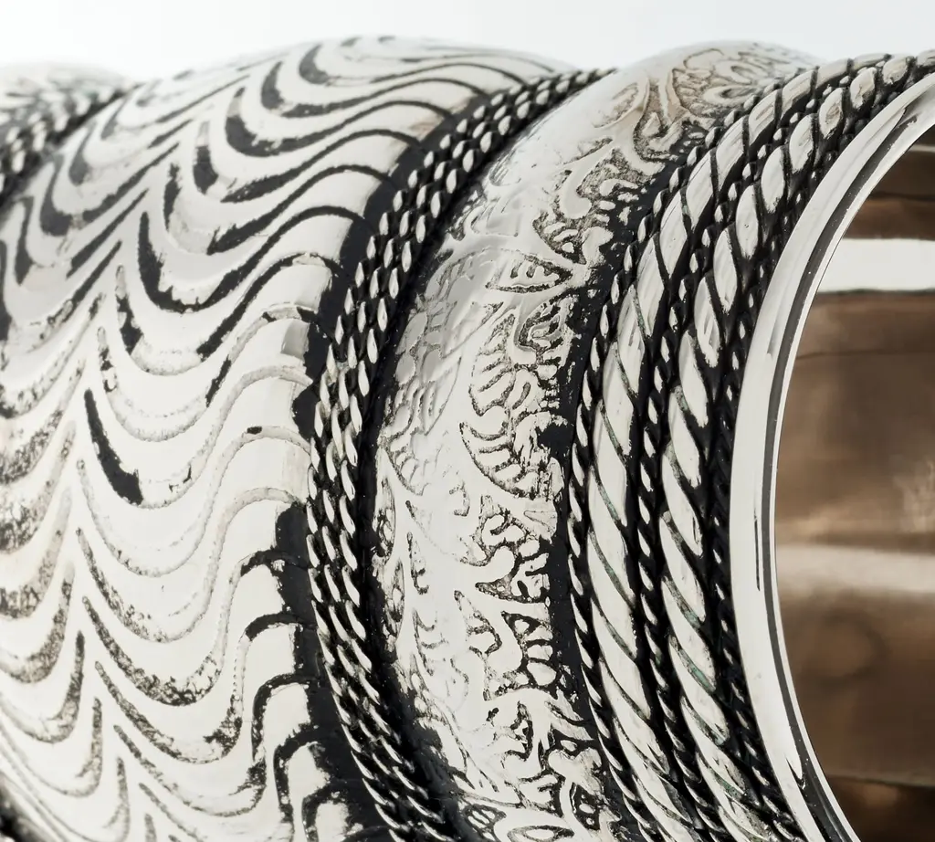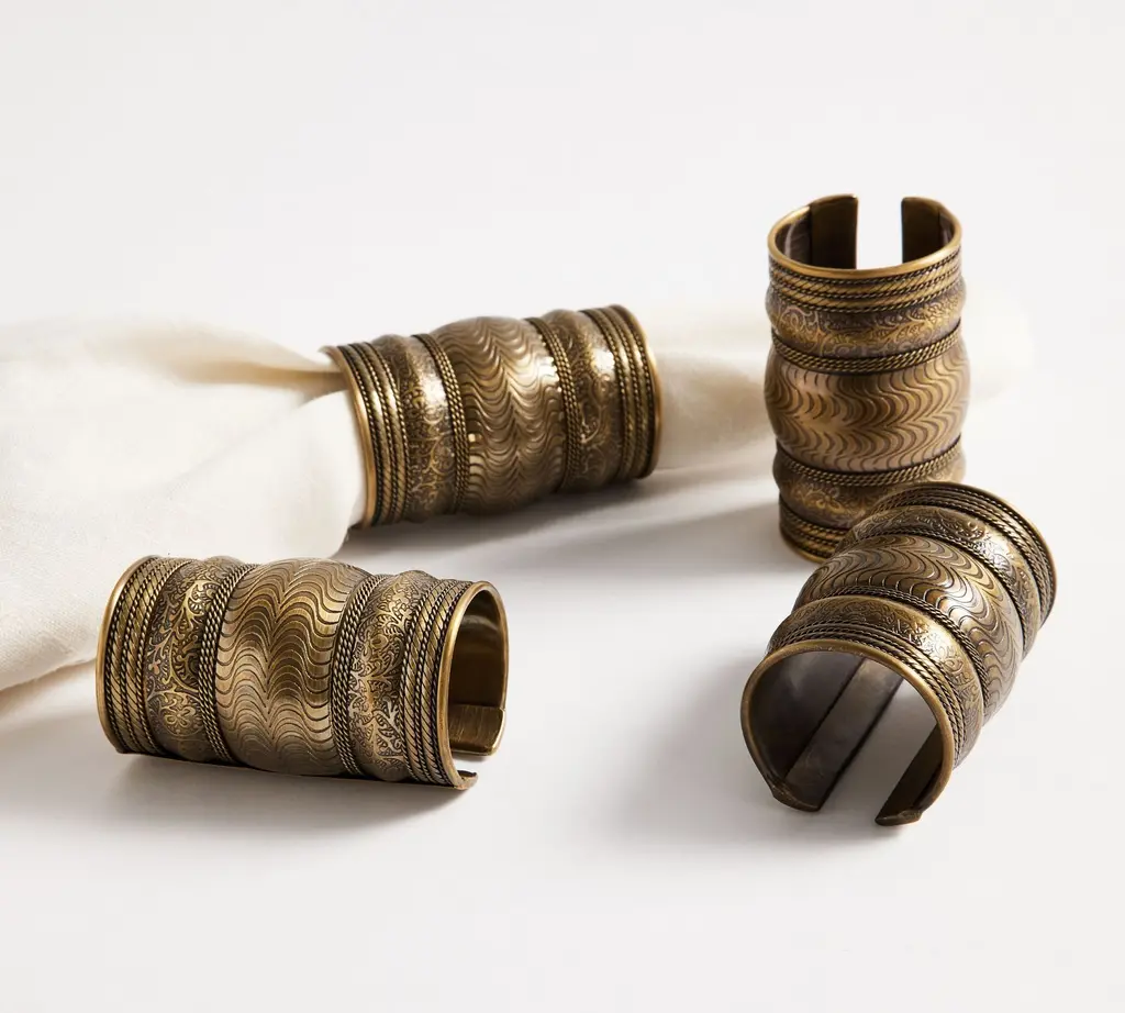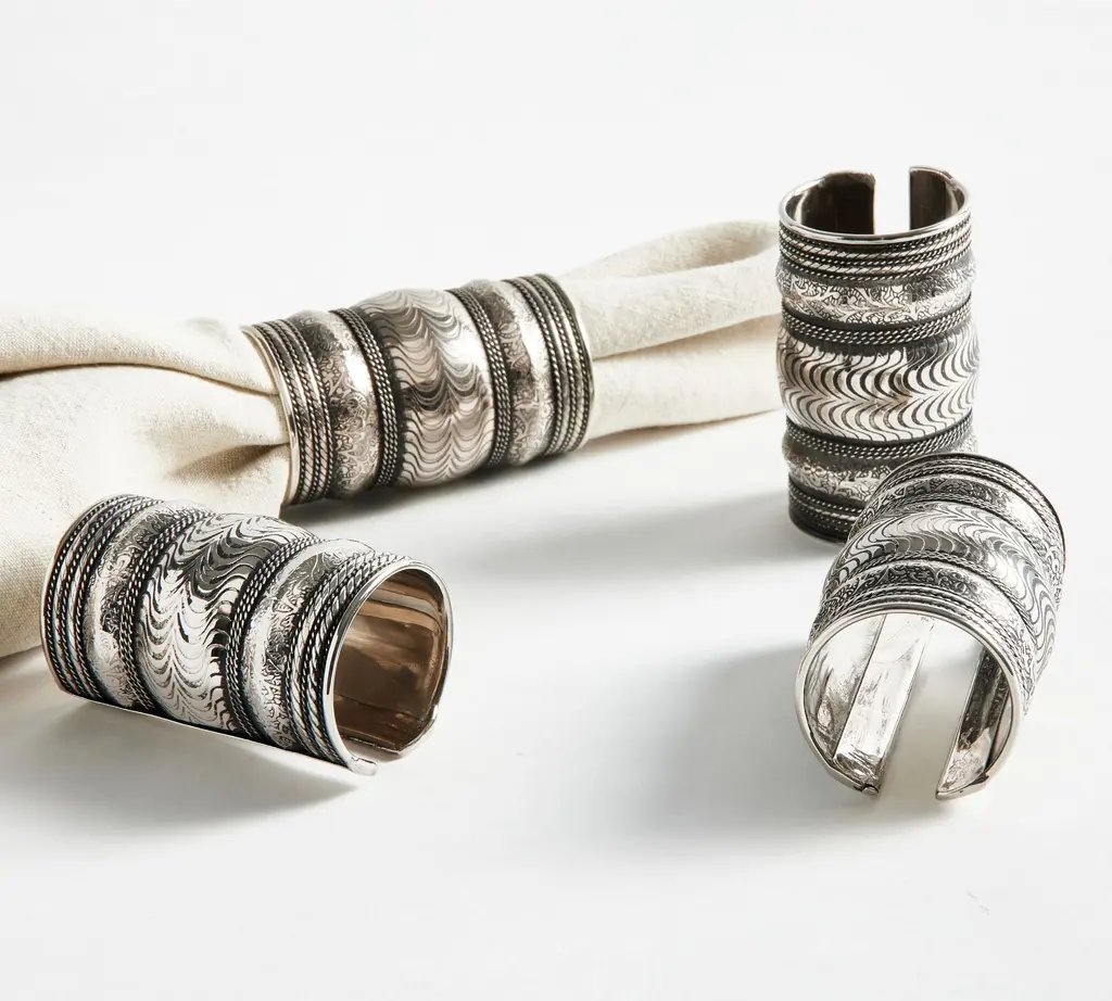 Like jewelry for your place setting, these beautiful bangles wrap your napkins in intricate etched detail. Handcrafted and finished in antique nickel, they bring a global-inspired vibe to your table. Add these defining accents to your next dinner party or to dress up everyday meals.