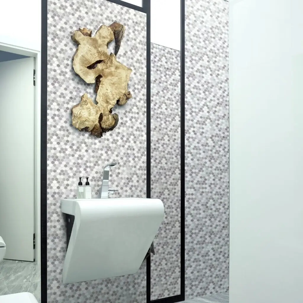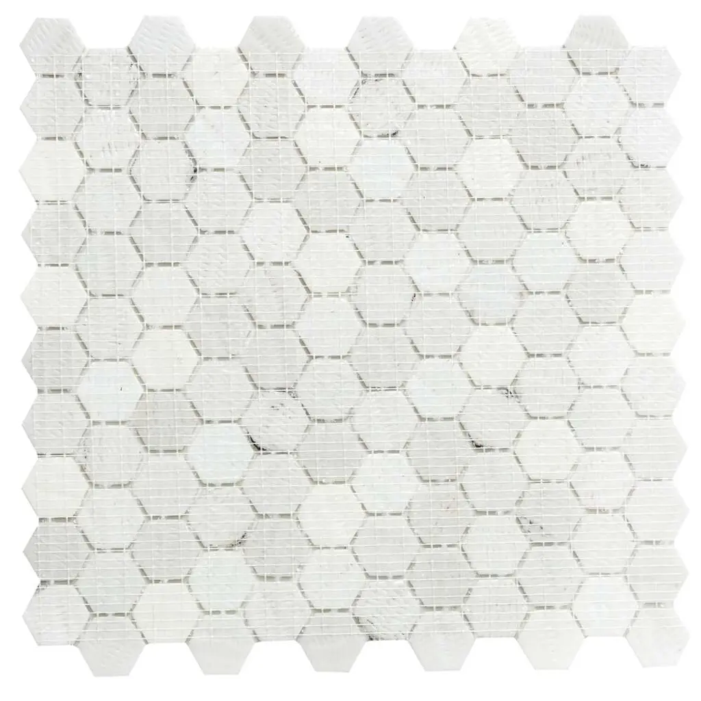 Carefully designed combinations of timeless hex in neutral tones and subtle details are designed to enhance any residential project and maintain its originality. Made and designed in Spain, this 98% recycled, sustainable mosaic is meant for both floor and wall applications while also being suitable for dry, pool, or wet areas. This collection comes in various colors, all offering their own unique style and variation. Our Eterna Hex Glass Mosaic collection stands the test of time and provides your home with long-lasting beauty. FEATURES: DIMENSIONS: