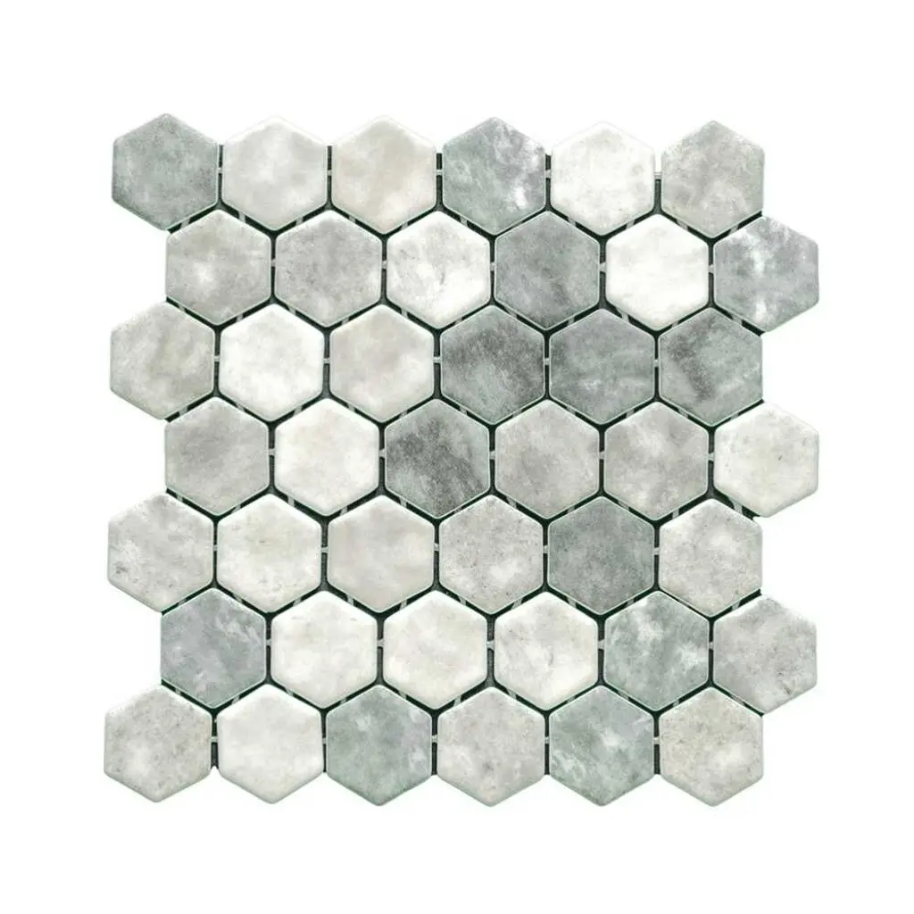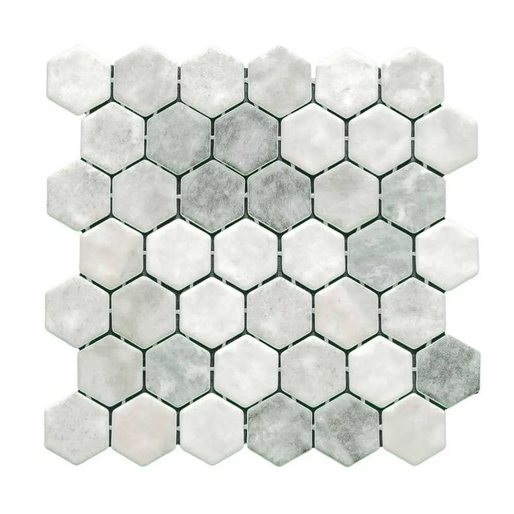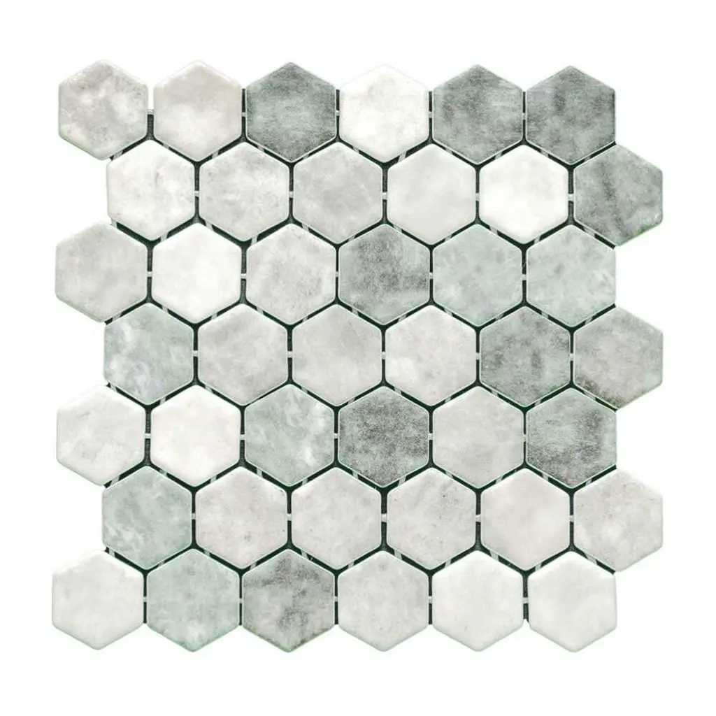 Looking for a unique multicolored checked tile? Check out The Tile Life's Eterna Hex Glass Mosaic for beautiful multicolored patterned tile. This mosaic collection features a stunning combination of elegant marble and stone textures covering each mosaic, creating endless possibilities and combinations for decorating your environment. A grain that recalls the marble finesse and realistically recreates the stones, taking us to its natural origin. Made and designed in Spain, this 98% recycled, sustainable mosaic is meant for both floor and wall applications and is suitable for pools and dry and wet areas. FEATURES: DIMENSIONS: