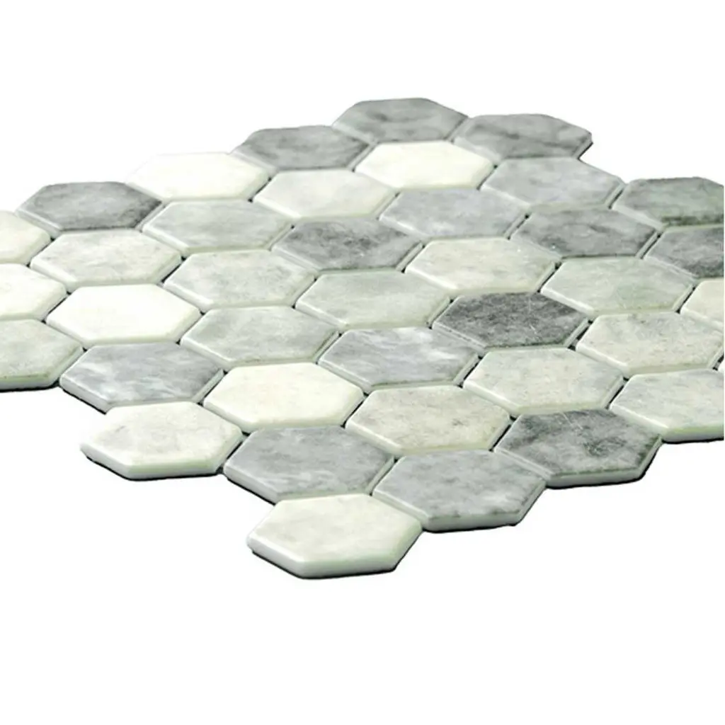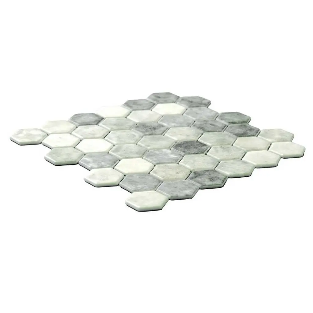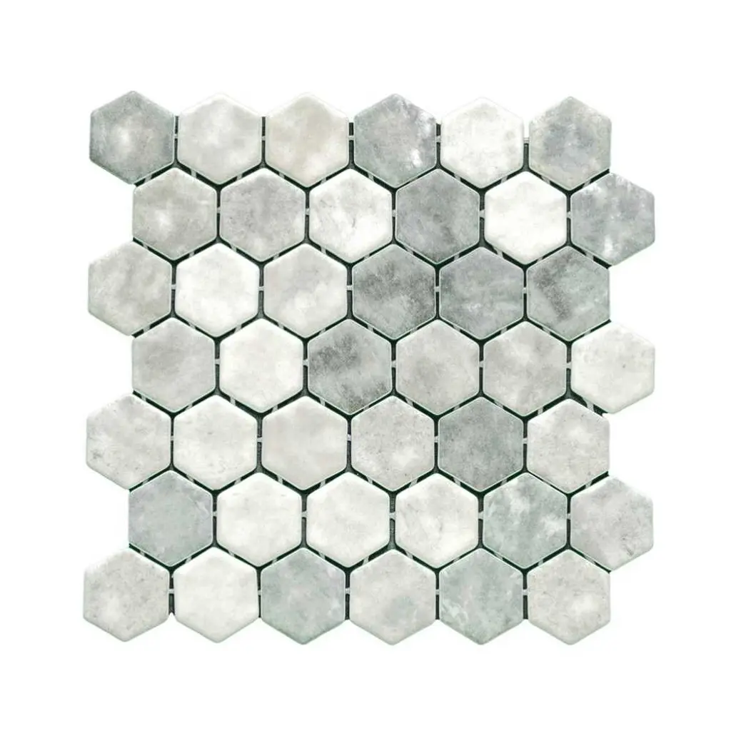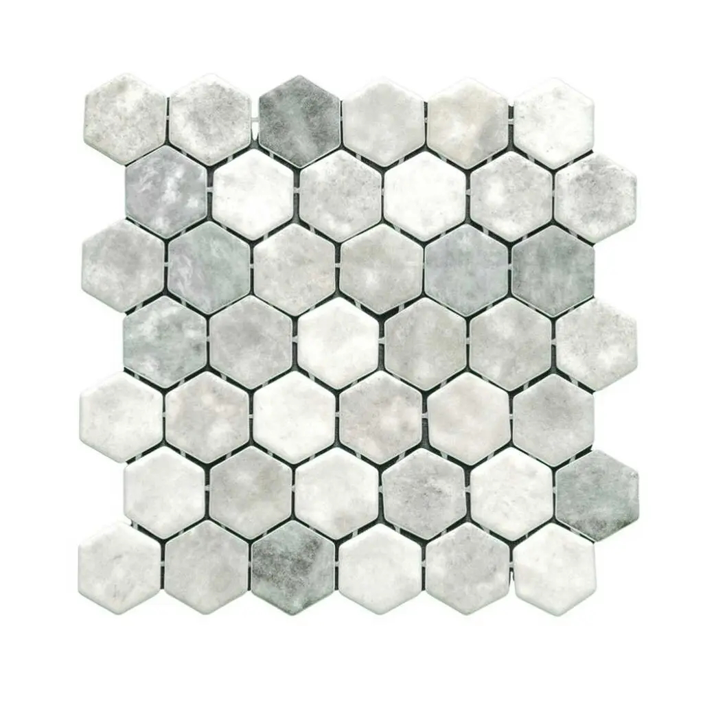 Looking for a unique multicolored checked tile? Check out The Tile Life's Eterna Hex Glass Mosaic for beautiful multicolored patterned tile. This mosaic collection features a stunning combination of elegant marble and stone textures covering each mosaic, creating endless possibilities and combinations for decorating your environment. A grain that recalls the marble finesse and realistically recreates the stones, taking us to its natural origin. Made and designed in Spain, this 98% recycled, sustainable mosaic is meant for both floor and wall applications and is suitable for pools and dry and wet areas. FEATURES: DIMENSIONS: