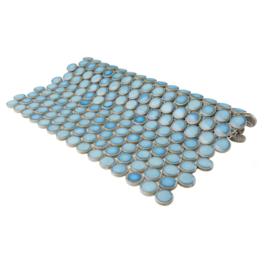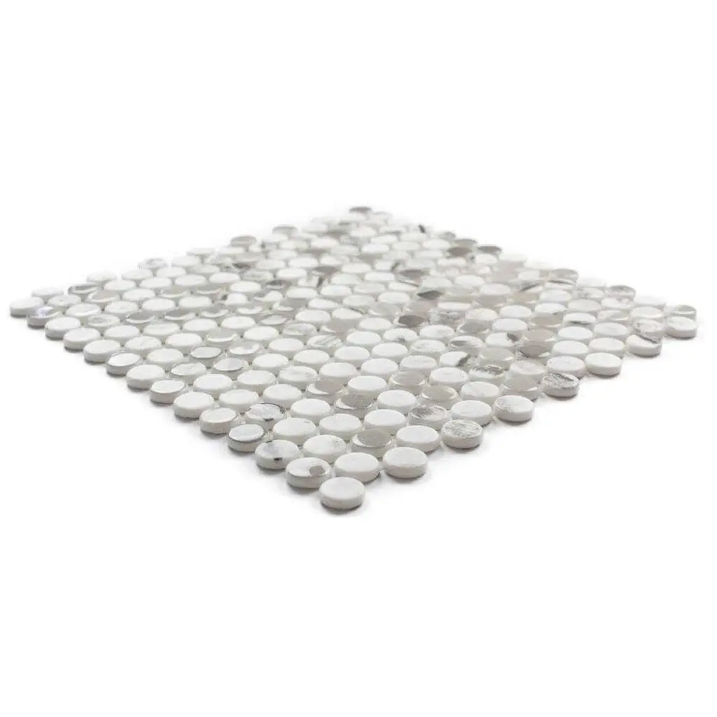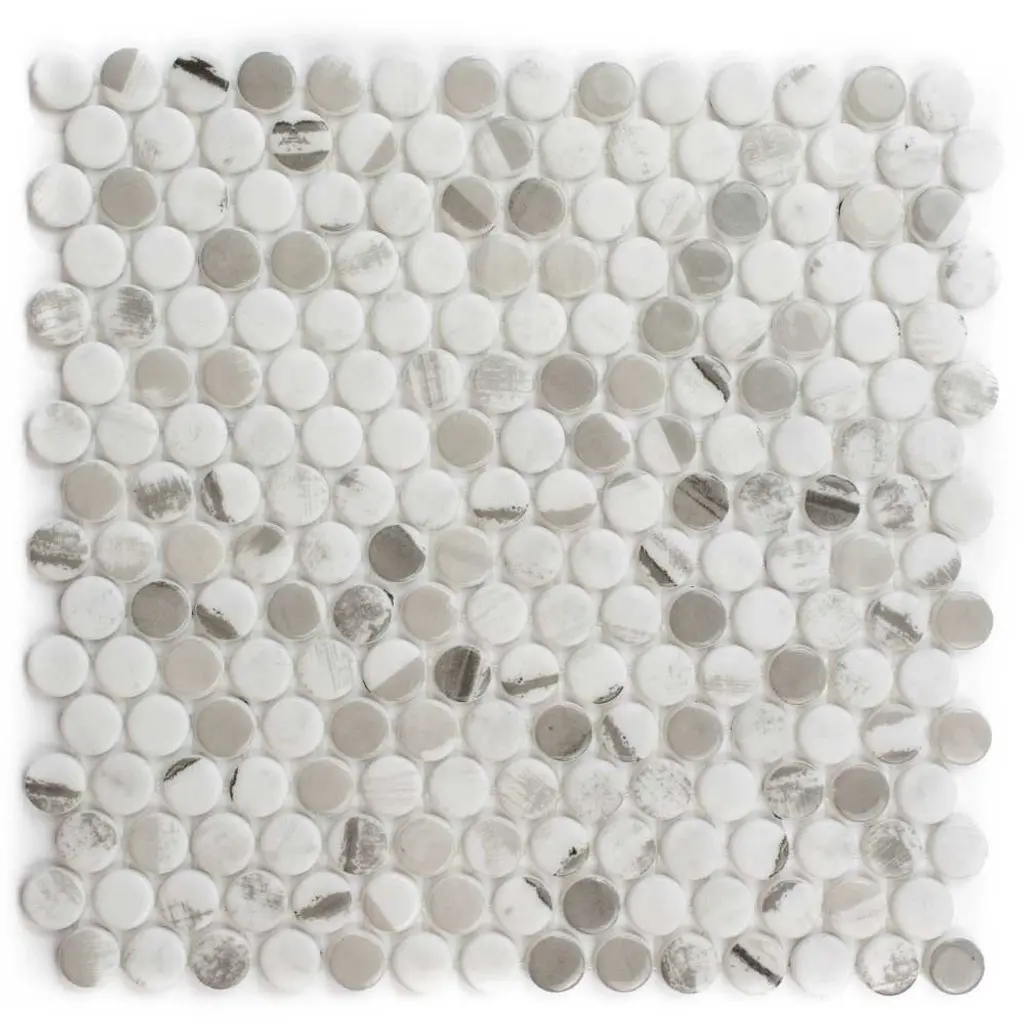 Carefully designed combinations of a timeless penny in neutral tones and subtle details designed to enhance any residential project while maintaining its originality. Our Eterna Penny Mosaic is produced from the highest quality recycled glass to create a high-end look. Made and designed in Spain, this 98% recycled sustainable mosaic is meant for both floor/ wall applications and is suitable for dry/pool/wet areas. These easy-to-install 12" x 12" decorative penny round glass mosaic tiles are perfect for a wide range of applications, they're ideal for backsplashes, bathrooms, showers, kitchens, pools, fireplace surrounds, countertops, floors, and walls—both indoors and out. Designed for use in dry or wet areas, these versatile glass mosaics are approved for residential and commercial installations, offering a stylish and durable solution for nearly any surface. FEATURES:DIMENSIONS: