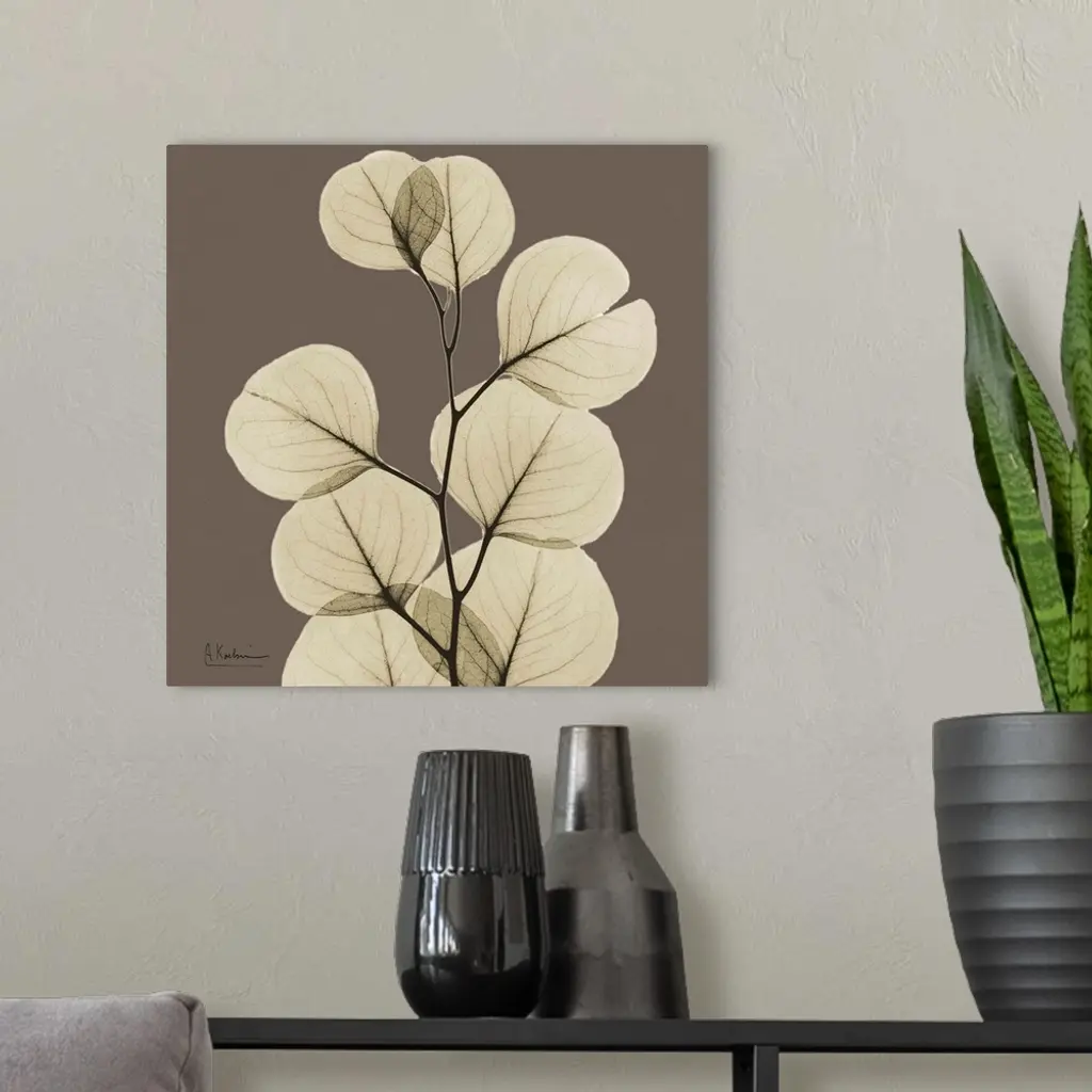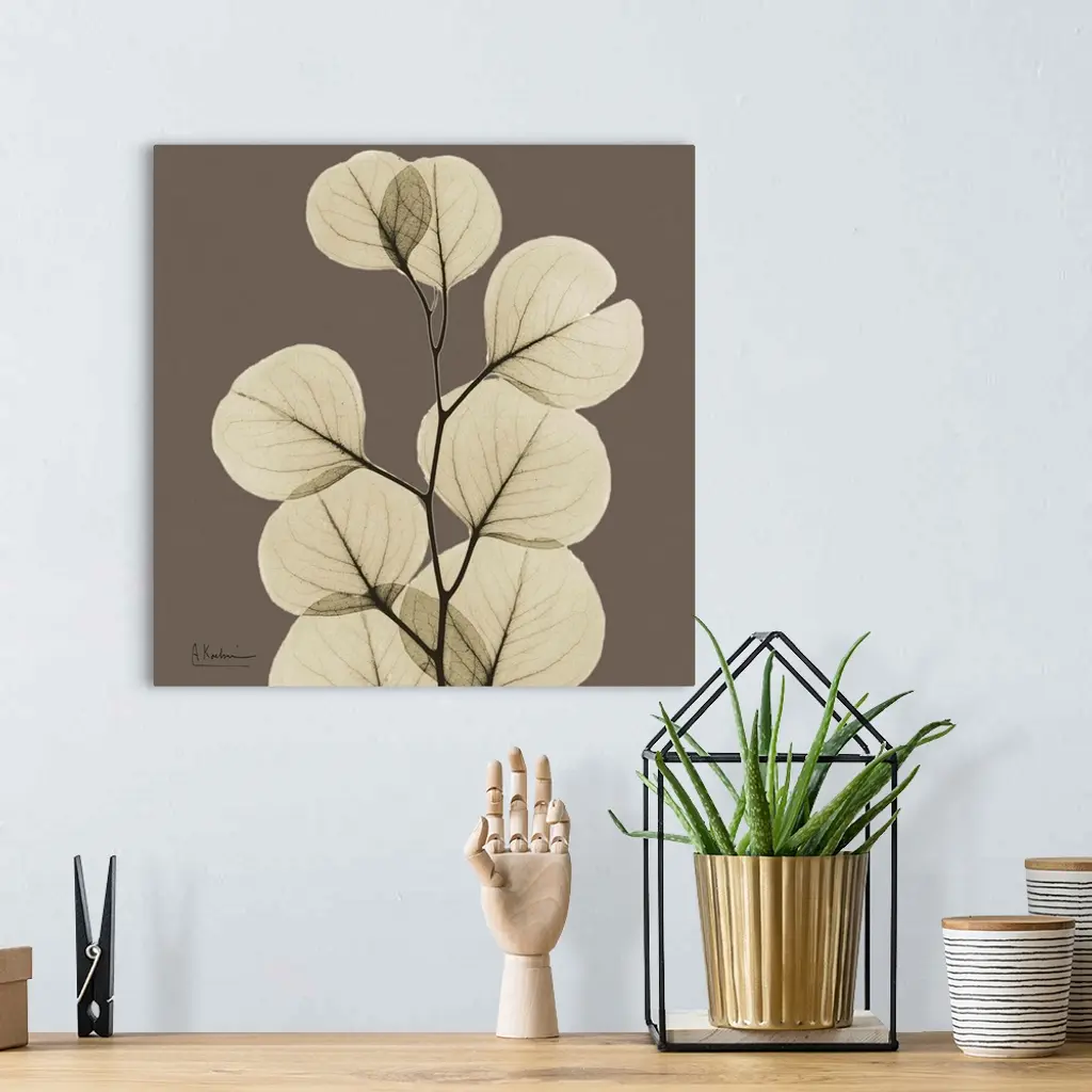 Square x-ray photograph of a group of eucalyptus leaves on the end a tree branch, against an earth toned background.