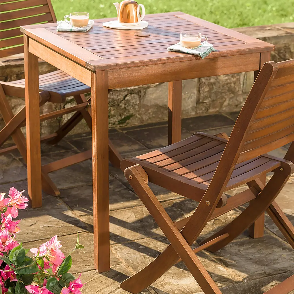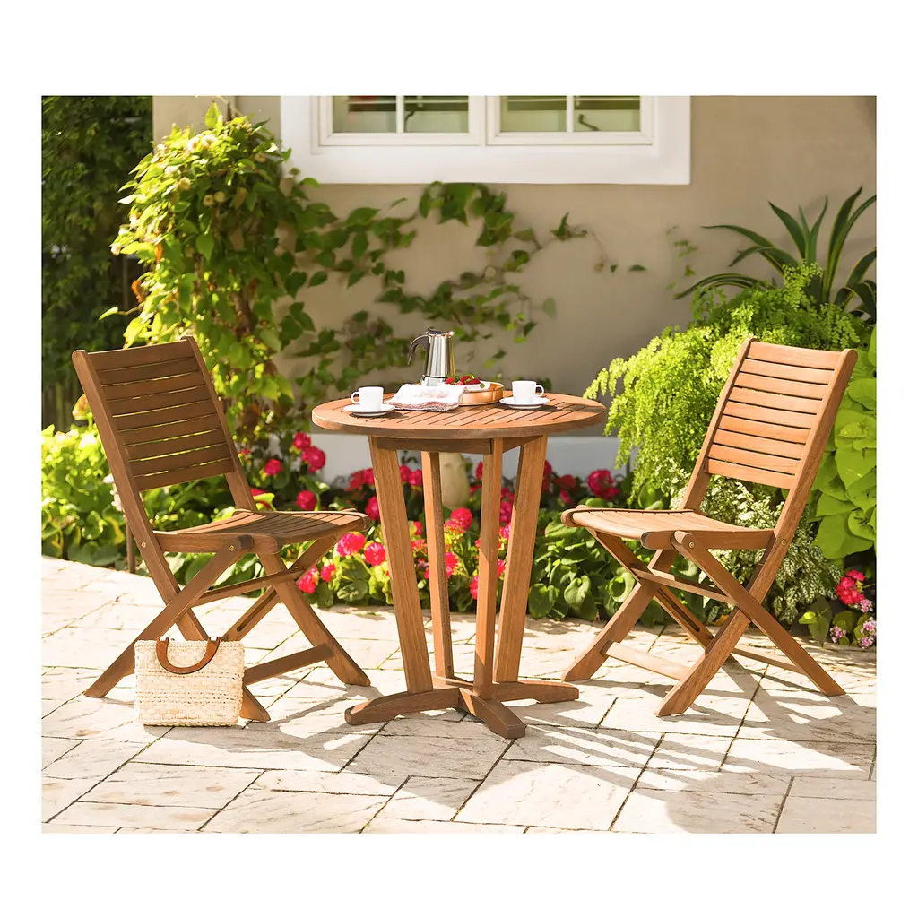You'll always be prepared for extra or unexpected guests with our Eucalyptus Folding Bistro Chairs. These beautiful chairs are crafted from durable FSC-certified eucalyptus and feature a rich, attractive finish that protects the wood and enhances the gorgeous grain. The classic slatted design works well in any setting from patio and porch to deck, balcony and beyond.Our solid wood Bistro Chairs give you a convenient and attractive solution for any size space or gathering. The folding Bistro Chairs provide a sturdy yet comfortable place to relax, and they're easy to tote and store. Made with versatility and ease of use in mind!