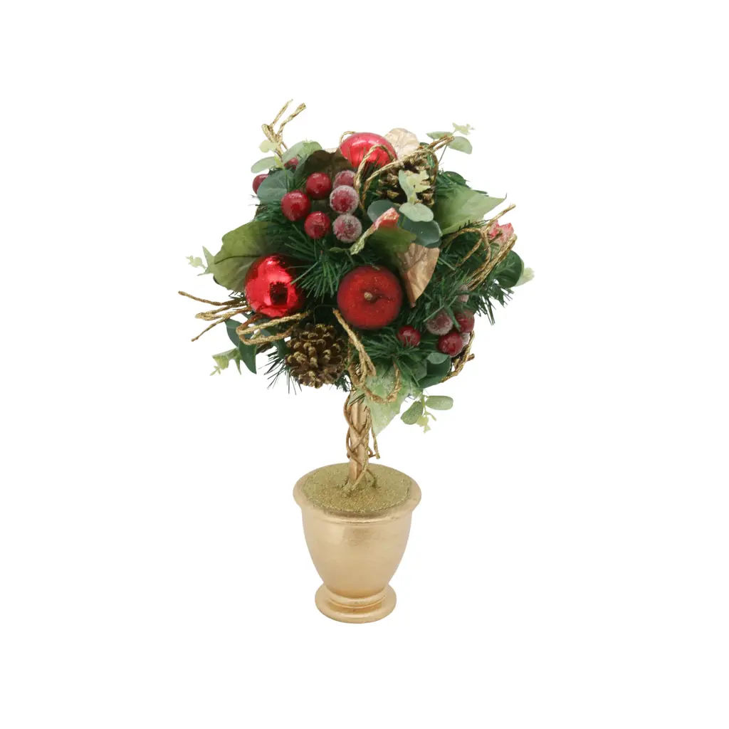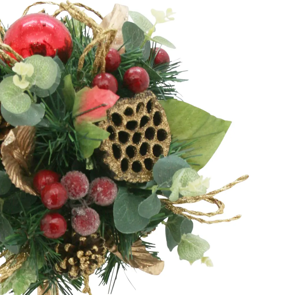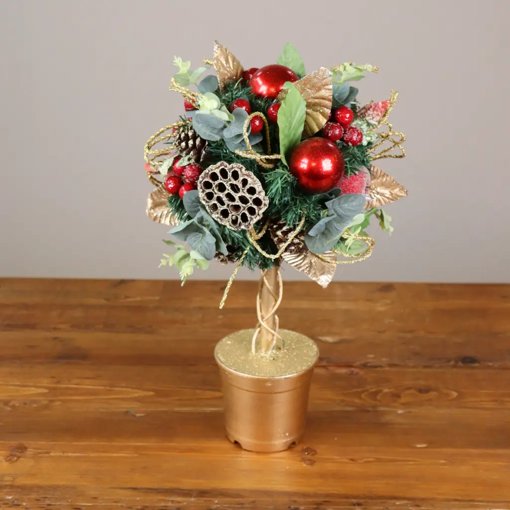 Bring vertical elegance to your seasonal decor with this handcrafted holiday topiary, a sculptural celebration of nature and festive charm. Built around a lush base of eucalyptus leaves, this piece rises with organic texture and warmth, crowned by lotus seed pods and rich holiday accents.