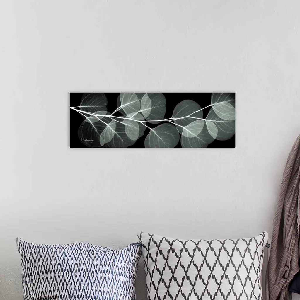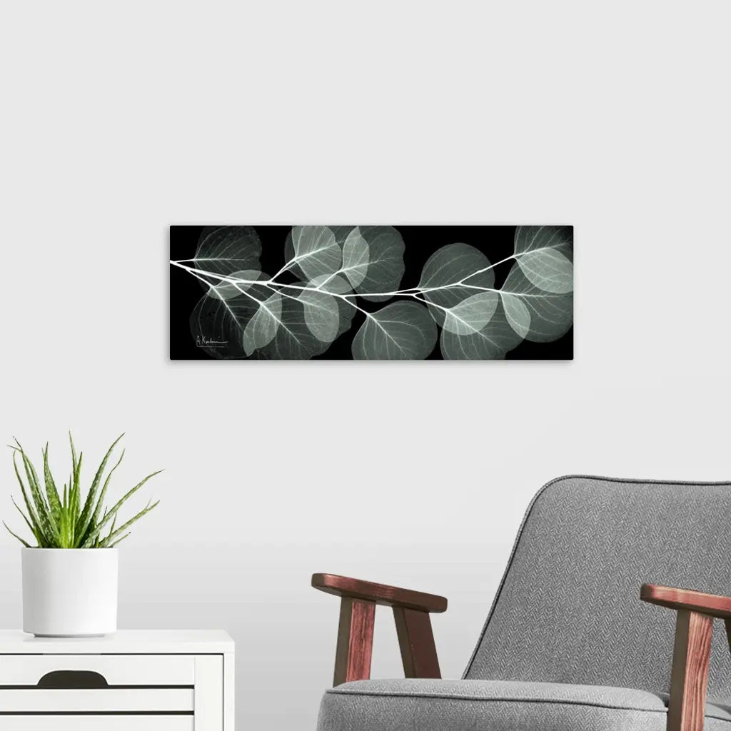 An x-ray of a branch of eucalyptus leaves on a black background.