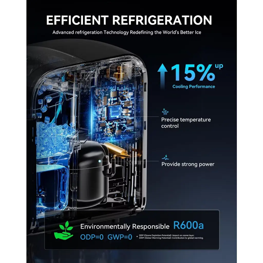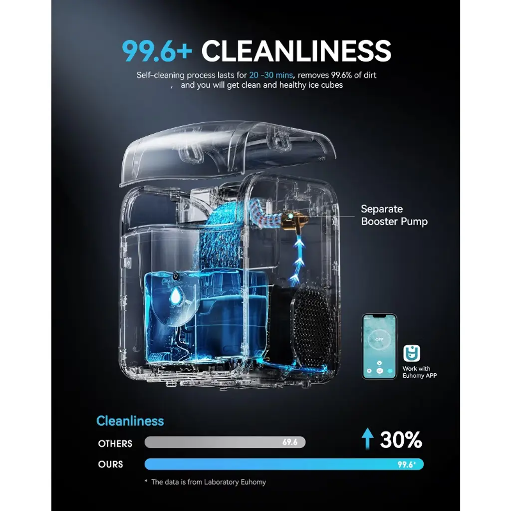 Introducing our Euhomy Portable Nugget Ice Maker: Fast, Smart, & Effortless Ice Bliss. Enjoy ice with a tap on your phone! Add water, then start ice-making easily via the physical button or remote control with the APP. Then you will get crunchable nugget ice in just 7 minutes. The LED - lit indicator keeps you in the loop. Plus, your phone gets “ice full” or “water tank empty” push alerts. Boasting a 40-lbs daily output, it churns out over 5000 ice cubes to fill more than 100 cups in 24 hours. Say goodbye to tedious manual cleaning - simply press button to activate the 20-min deep self-cleaning function. The ice maker operates at a whisper-quiet level of less than 45db, ensuring a peaceful environment. This efficient machine consumes only 4kWh/24H, effectively saving on your electricity bills. Compact and versatile, it fits easily on most countertops and tabletops, perfect for home, office, kitchen, RV, and more!