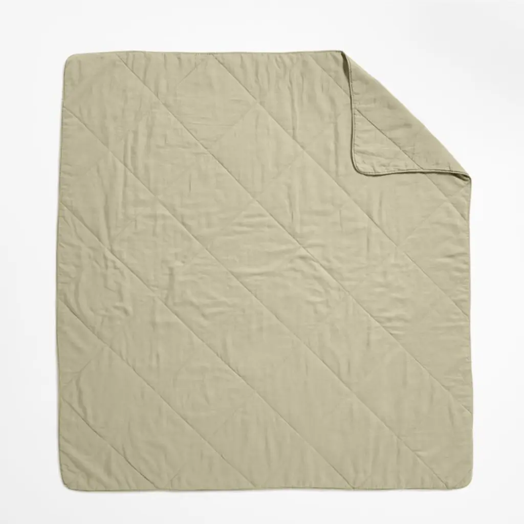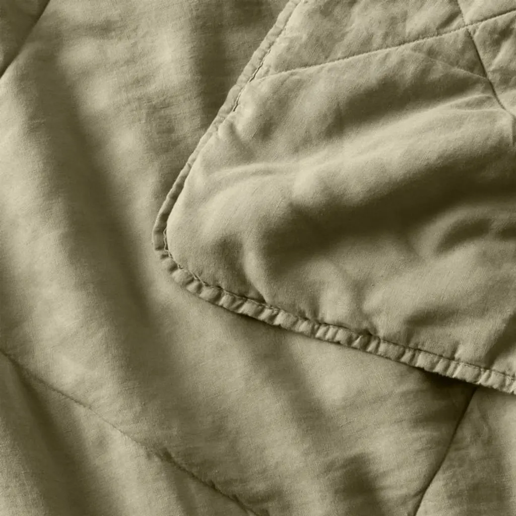 Quilted on the diagonal with oversized diamonds, these shams and quilts make the bed with a beautifully slouchy feel. Sustainable linen in khaki green weaves the laid-back bedding, an updated take on intricate quilting. We love the shams paired with the matching quilt or mixed with our other exclusive garden green bedding for a relaxed, layered look.